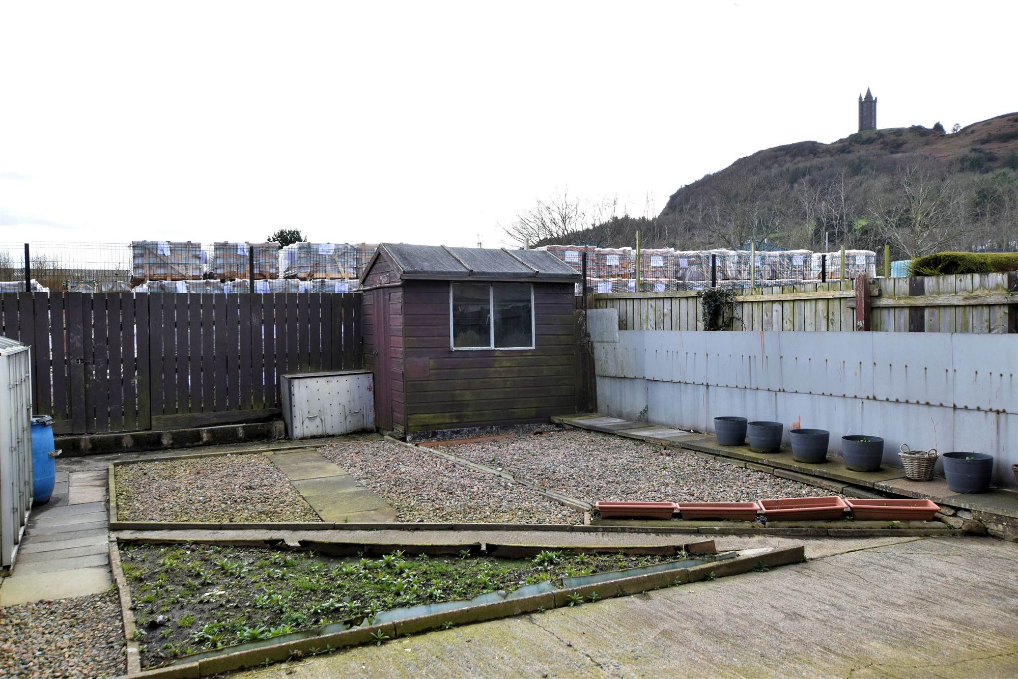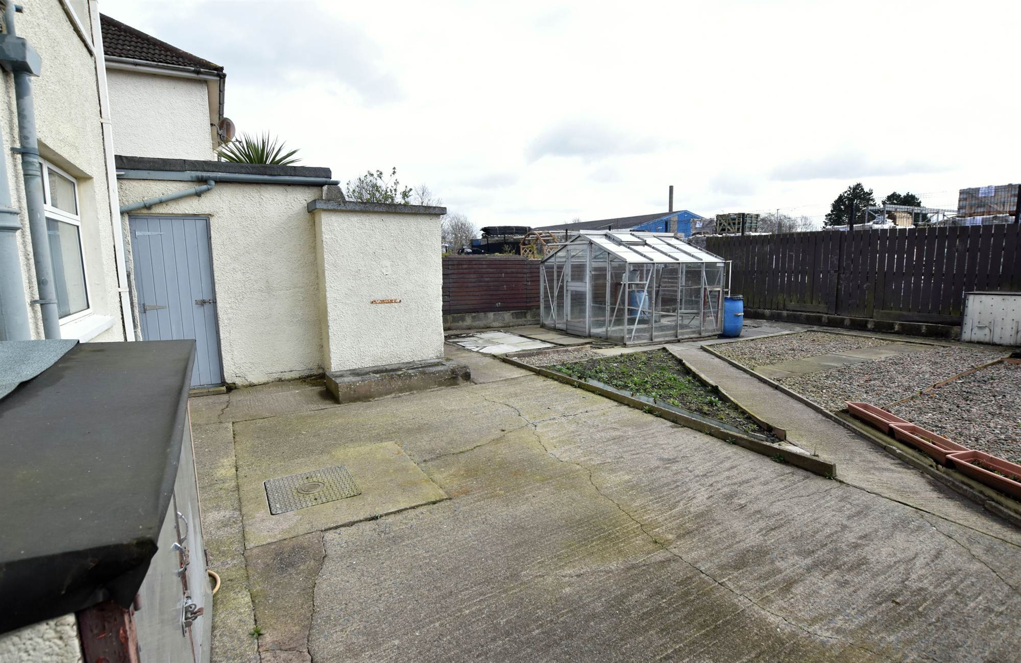 To front in paved patio area and extensive enclosed rear in concrete patio area and fencing.