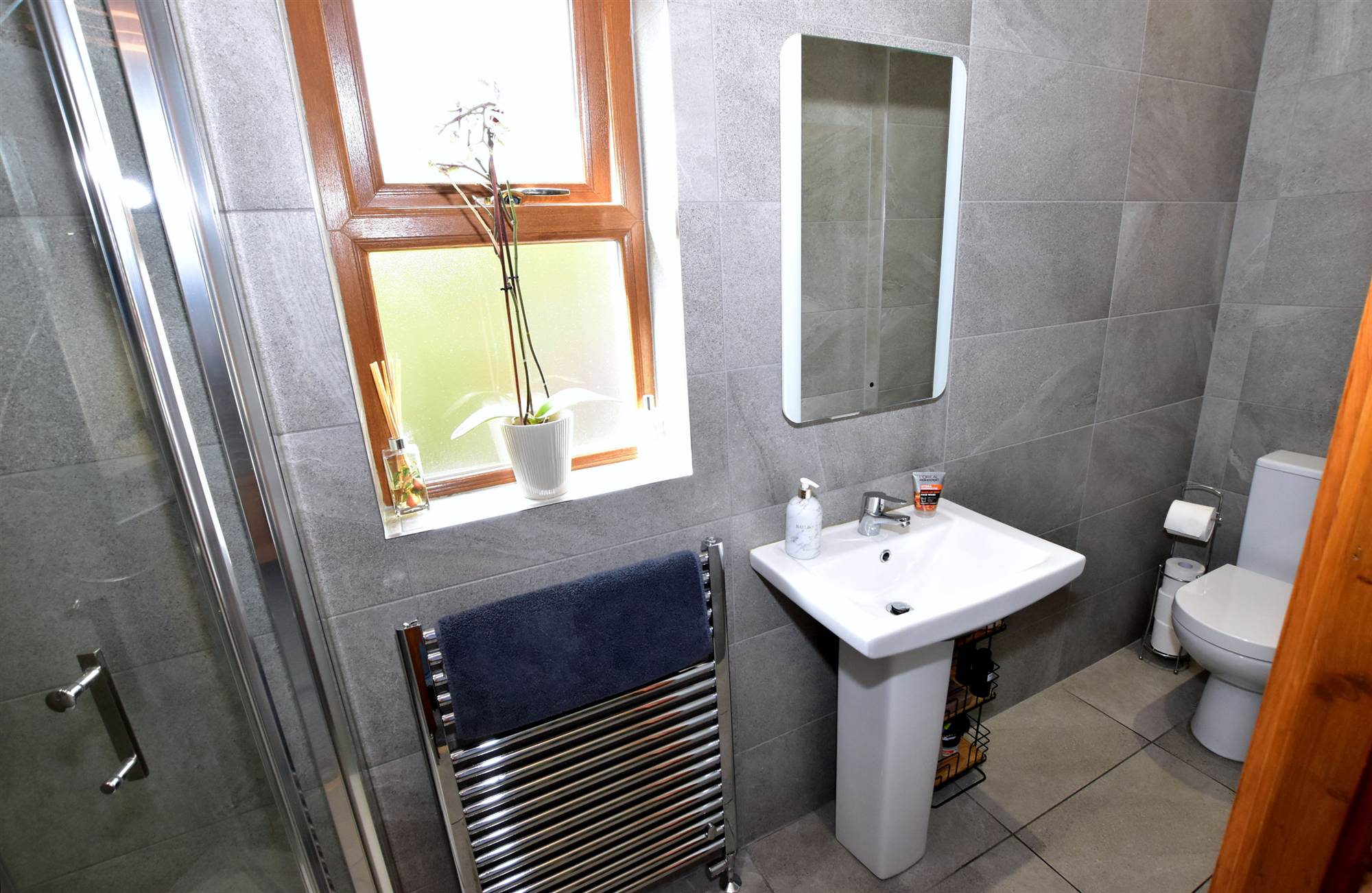 ceramic tiled floor, heated chrome towel rail.