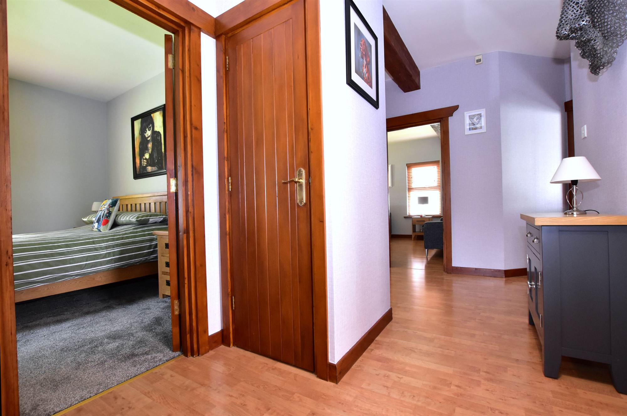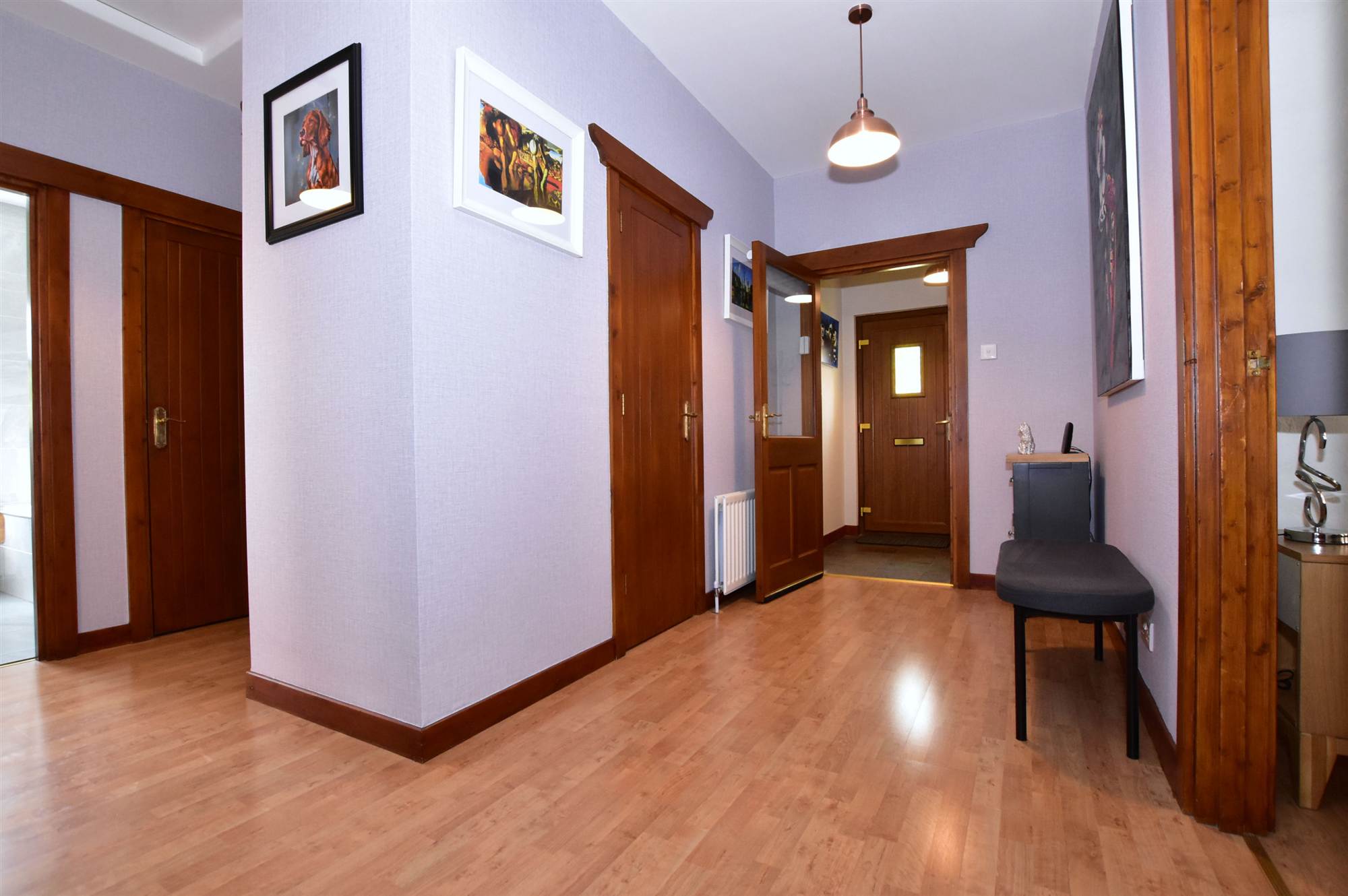 Enclosed entrance porch with chinese slate floor. Entrance hall with polished laminate floor, hot press copper cylinder with immersion heater, cloaks cupboard.