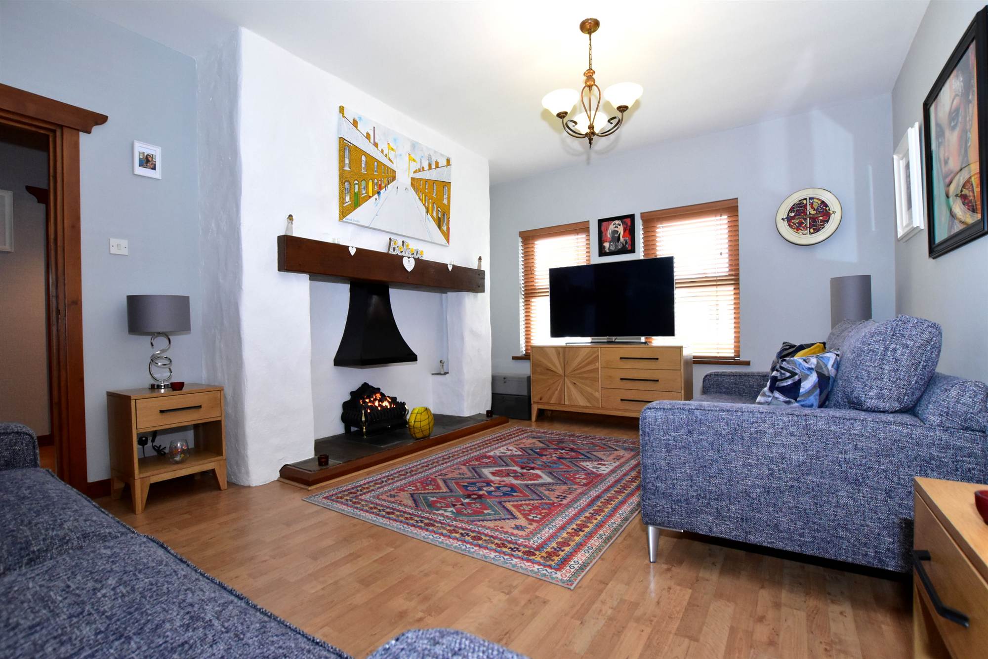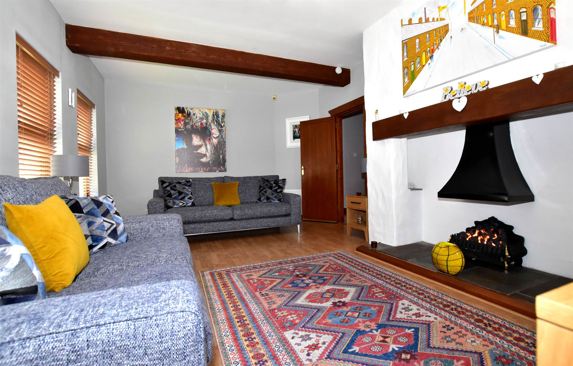 Feature Inglenook fireplace with gas fire, slate hearth, solid beam mantle, polished laminate floor.