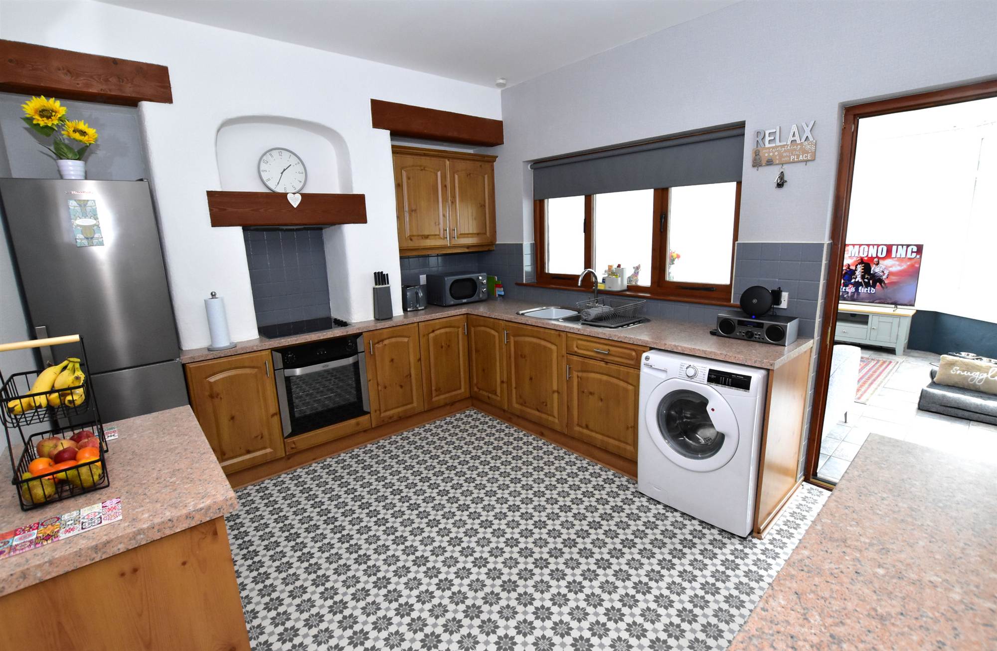 1 ½ Tub single drainer stainless steel sink unit with mixer taps, range of high and low level units, formica round edged work surfaces, built-in oven, four ring hob unit, extractor hood, plumbed for washing machine, wall tiling.