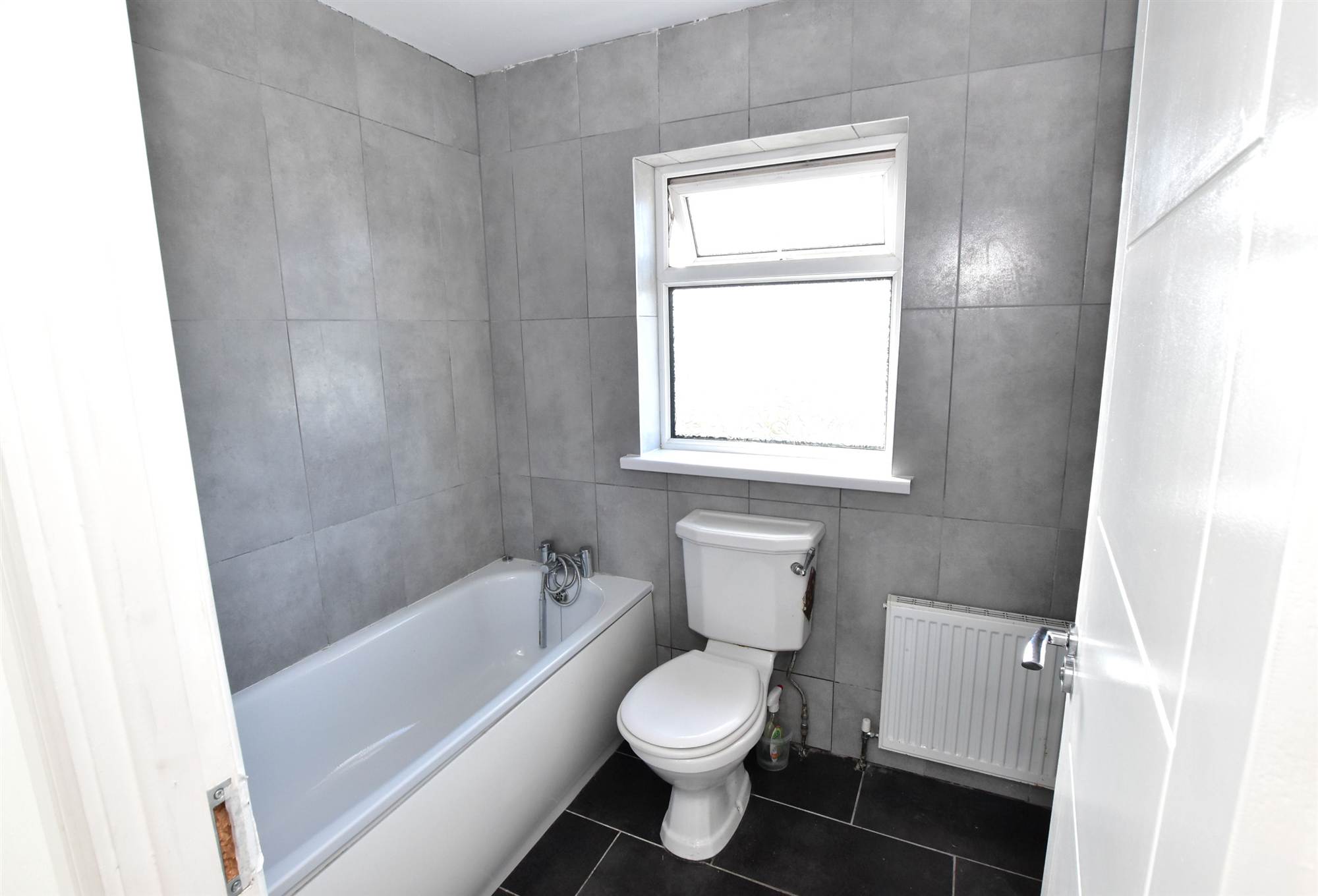 White suite comprising panelled bath with mixer taps, fully tiled shower cubicle with triton thermostatically controlled shower unit, pedestal wash hand basin, low flush WC, wall tiling, ceramic tiled floor.