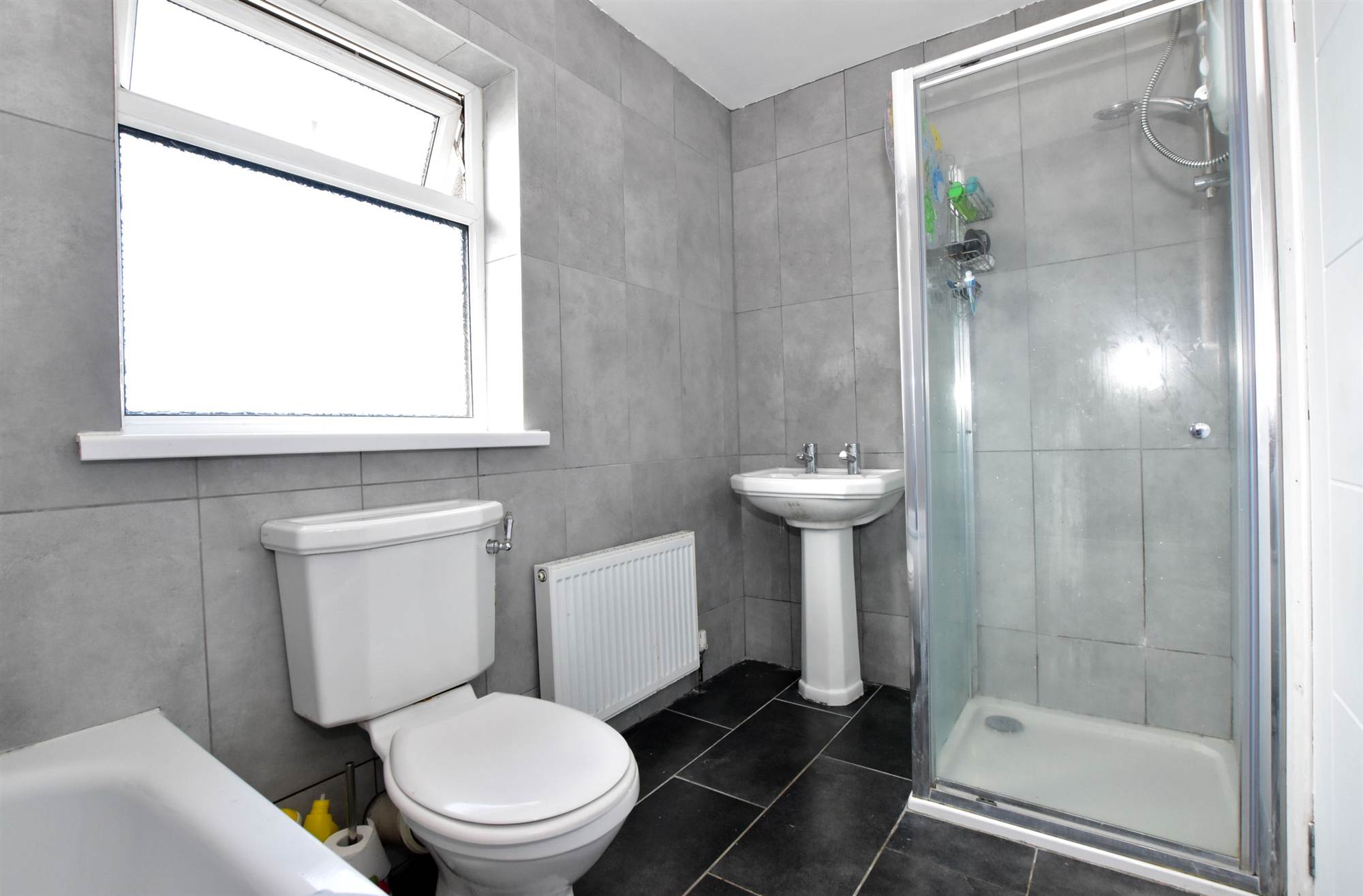 Deluxe white bathroom suite with separate fully tiled shower cubicle, ceramic wall and floor tiling.