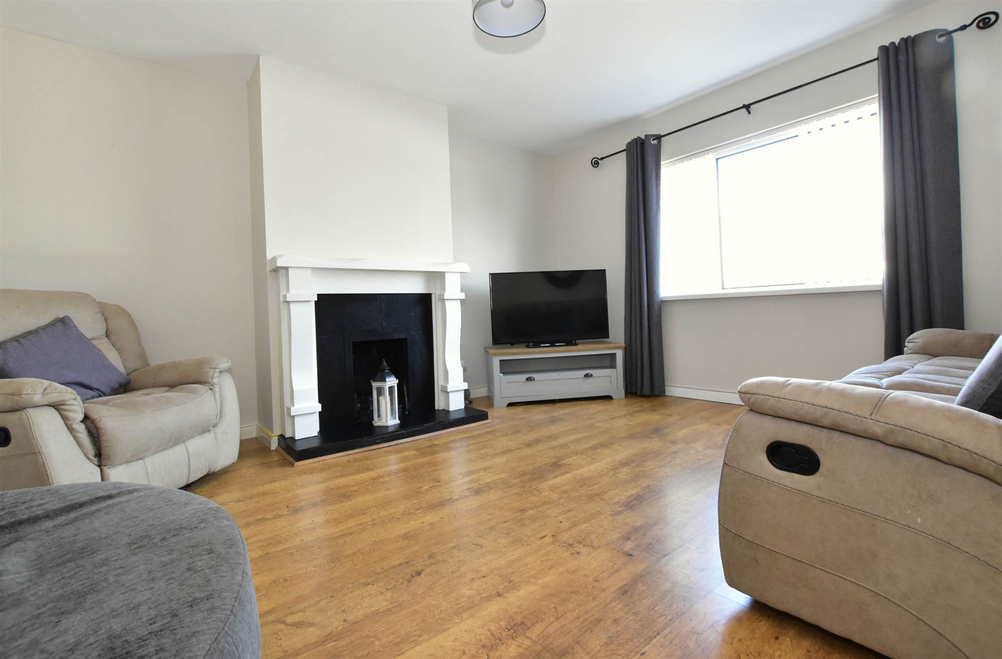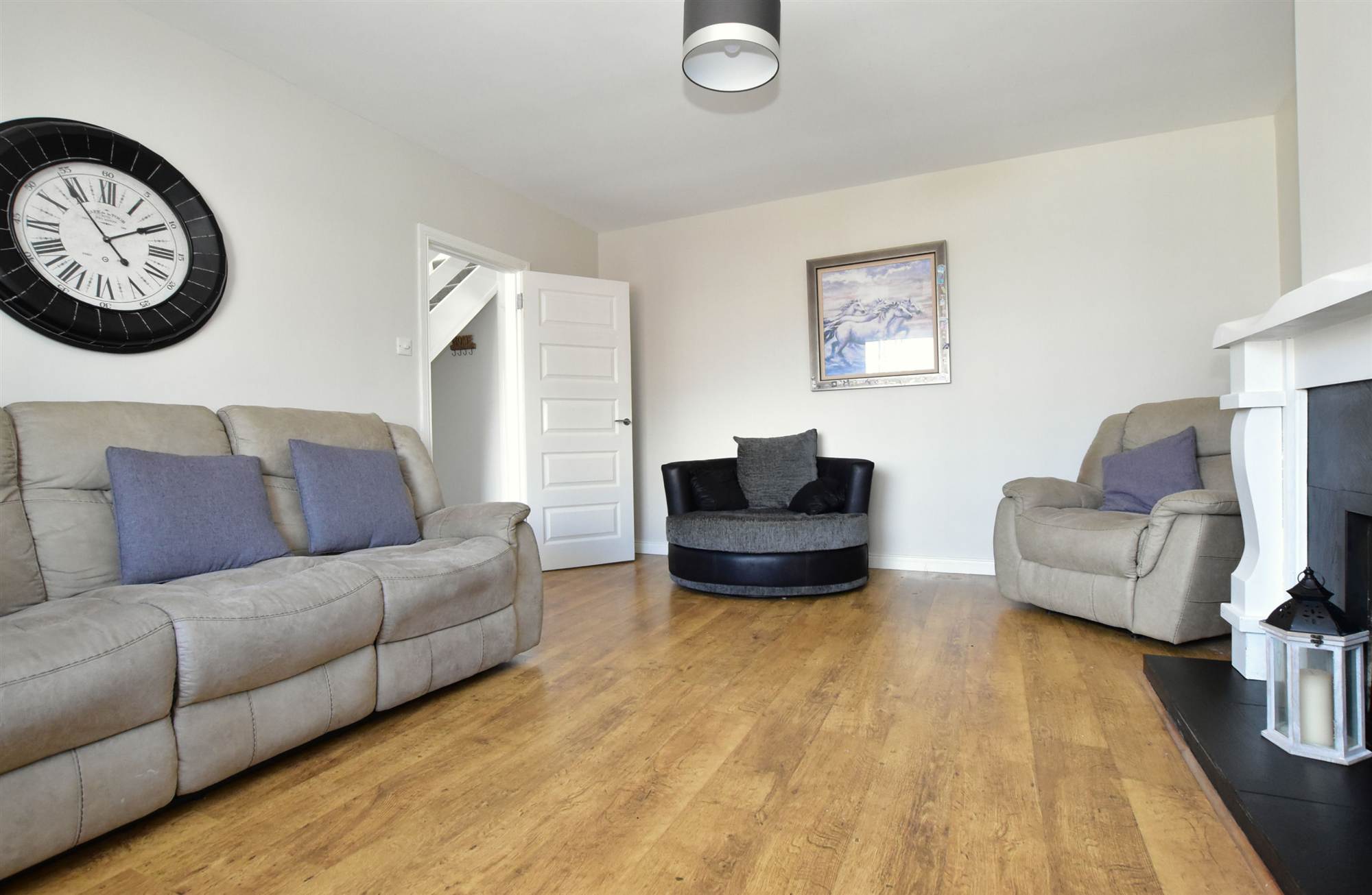 Solid wood mantle with slate inset, slate hearth, back boiler, polished laminate floor.