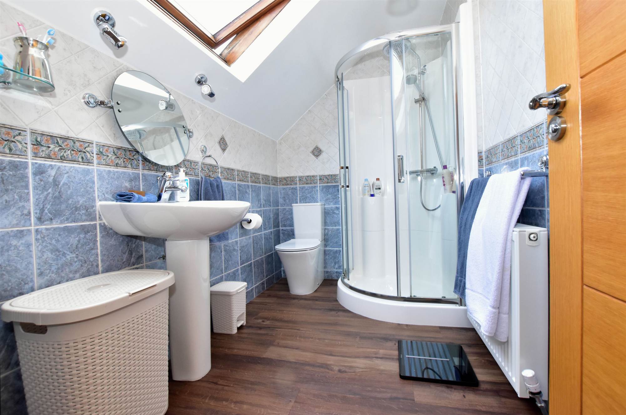 White suite comprising shower cubicle, pedestal wash hand basin, low flush WC wall tiling, linen cupboard.