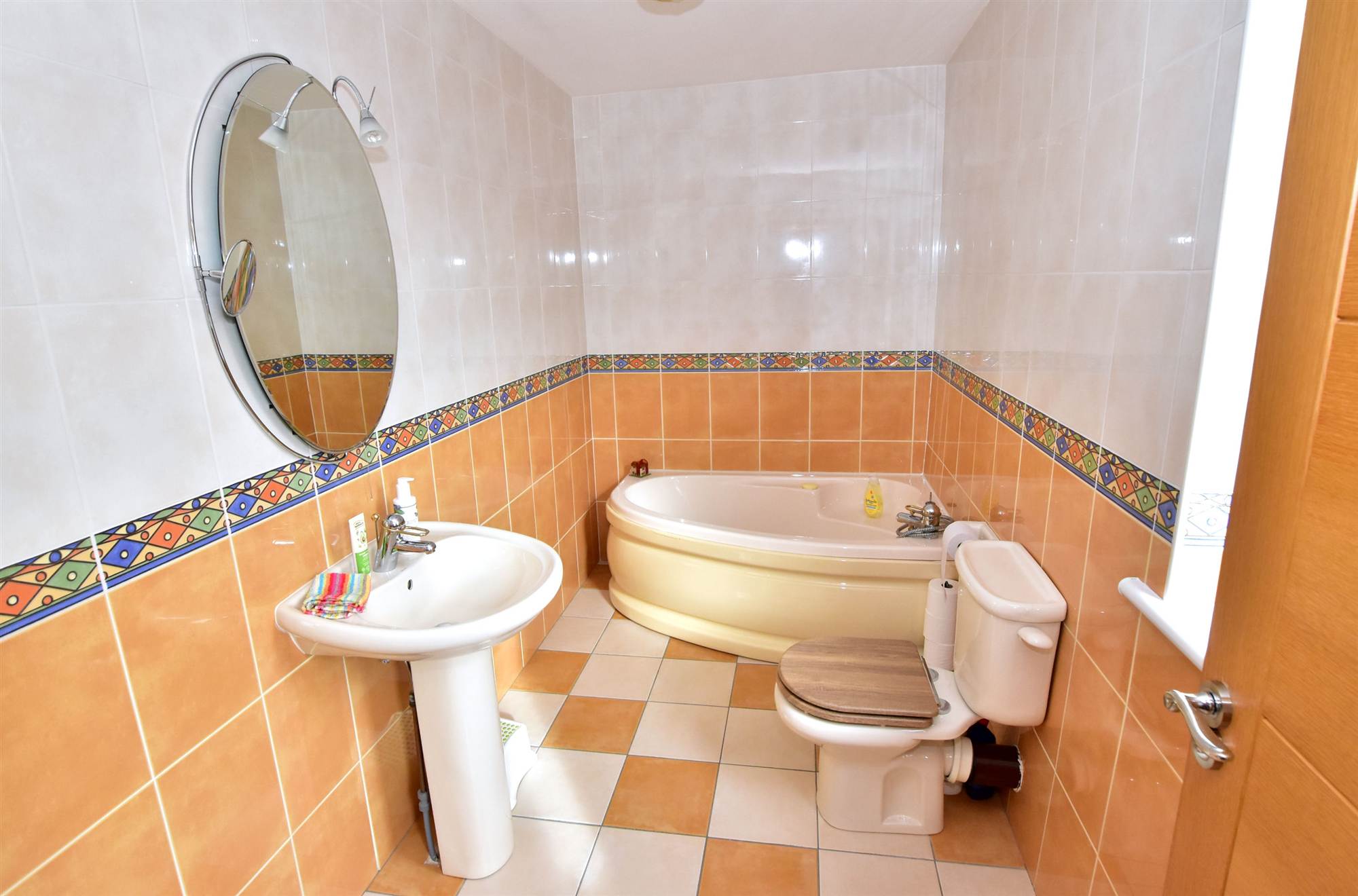 Coloured suite comprising panelled corner bath, pedestal wash hand basin, low flush WC, wall tiling, ceramic tiled floor.