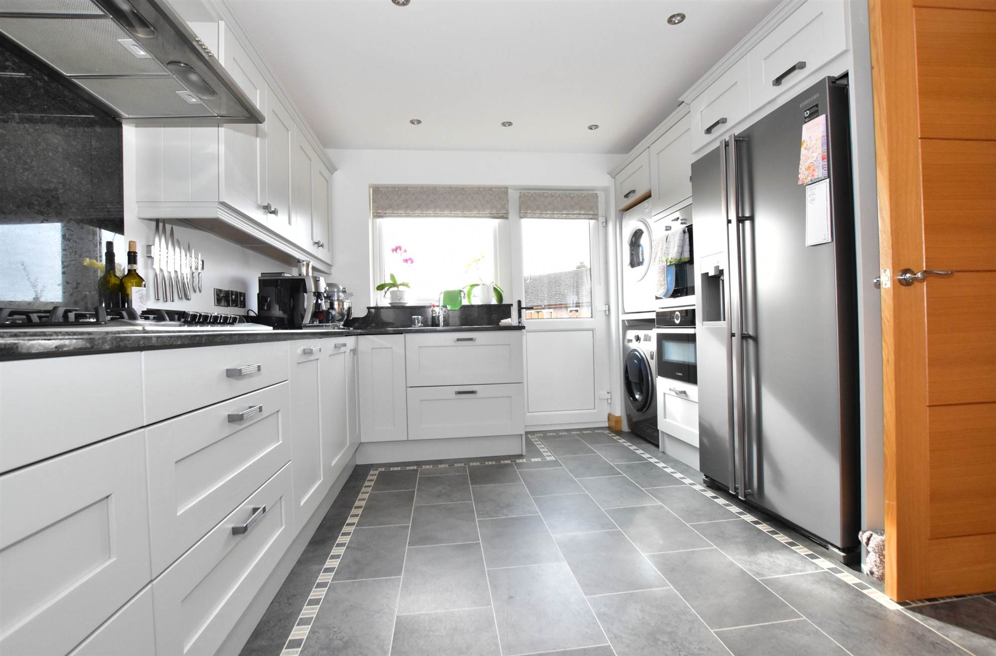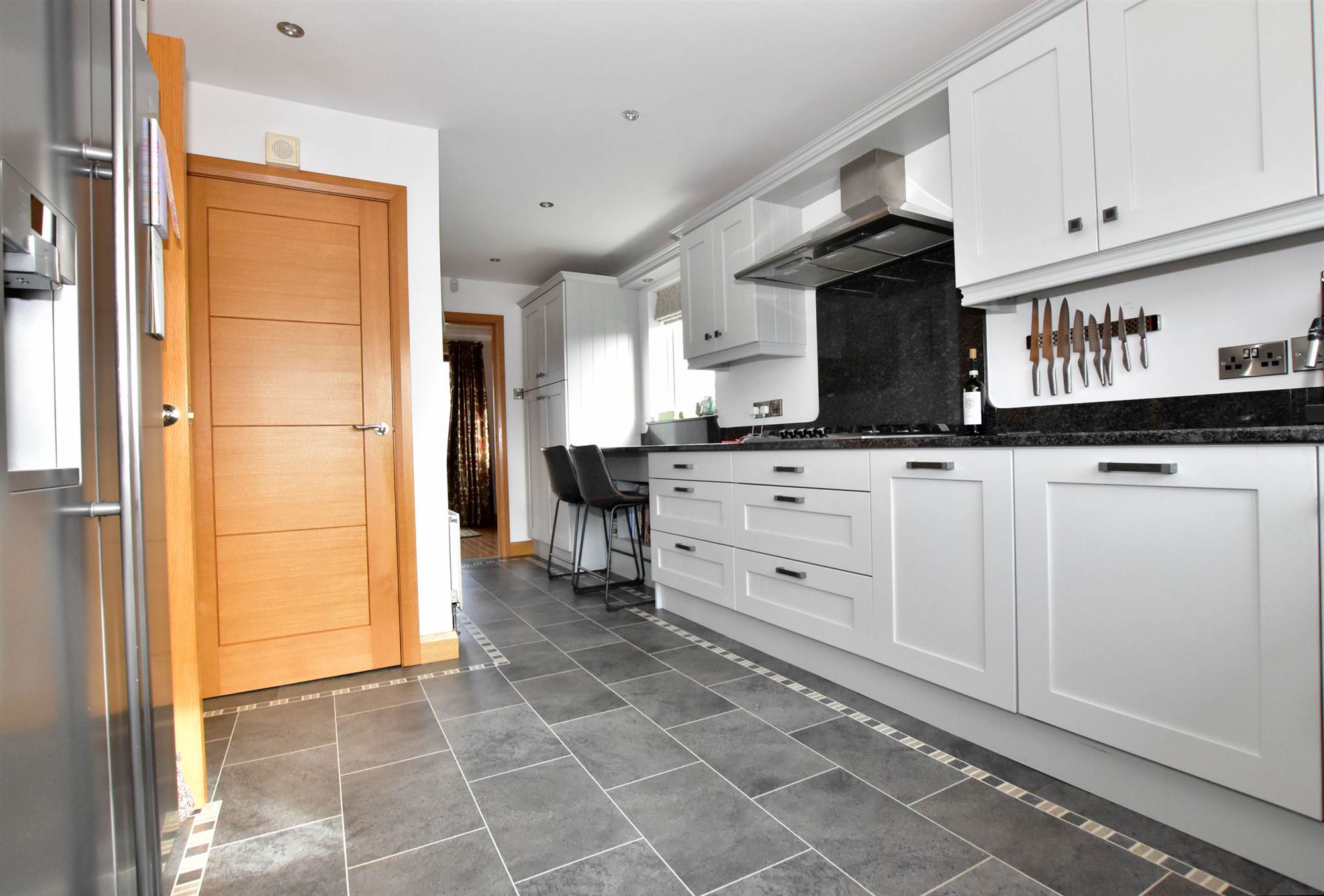 1½ tub single drainer sink unit, mixer taps, range of high and low level units, polished granite worktops, built in double oven, five ring gas hob, extractor hood, plumbed for washing machine, plumbed for american style fridge/freezer, integrated dishwasher, cloaks cupboard understairs.