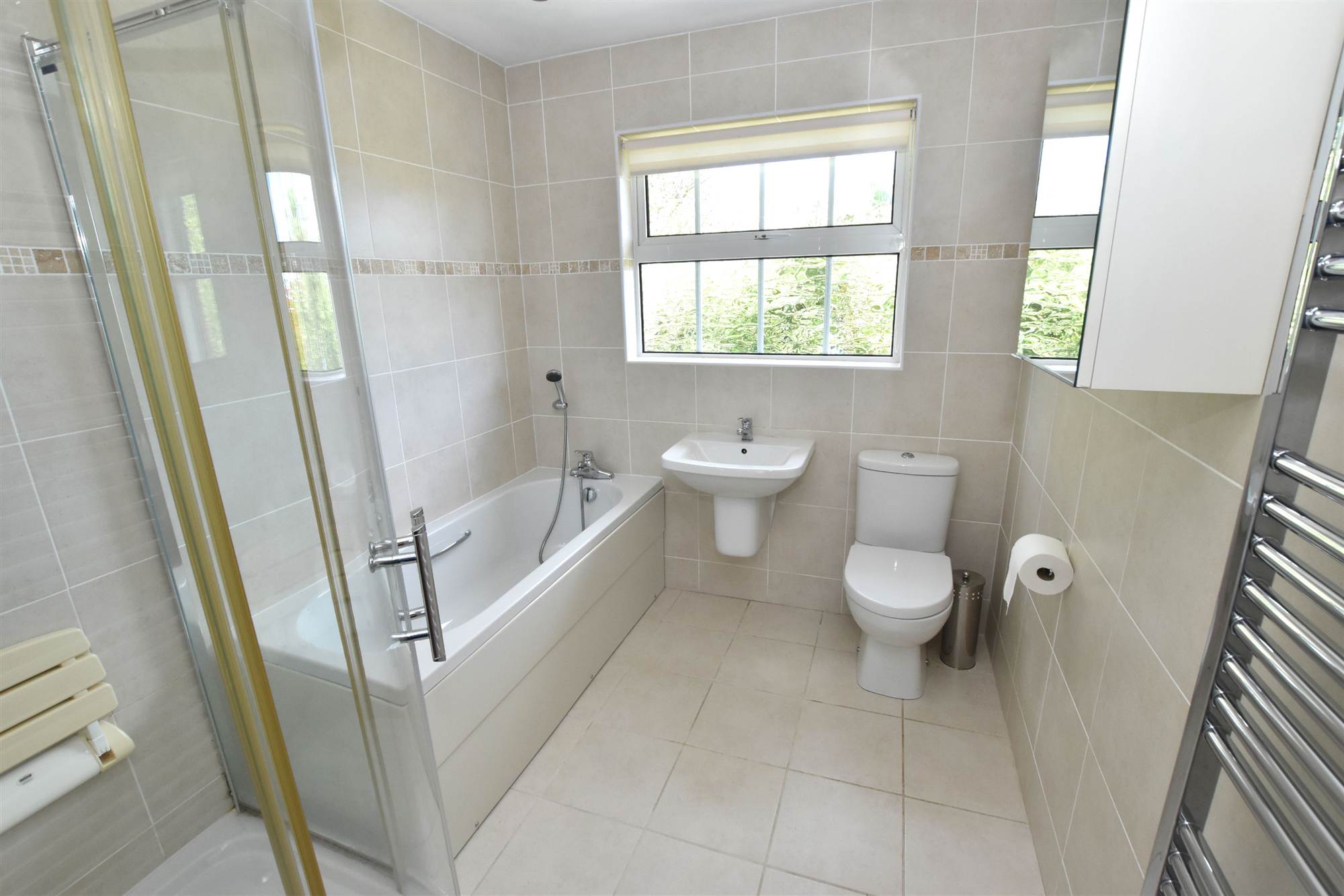 White suite comprising panelled bath with mixer taps and telephone hand shower, fully tiled shower cubicle with mira thermostatically controlled shower unit, wash hand basin, low flush WC, wall tiling, ceramic tiled floor, heated chrome towel rail.