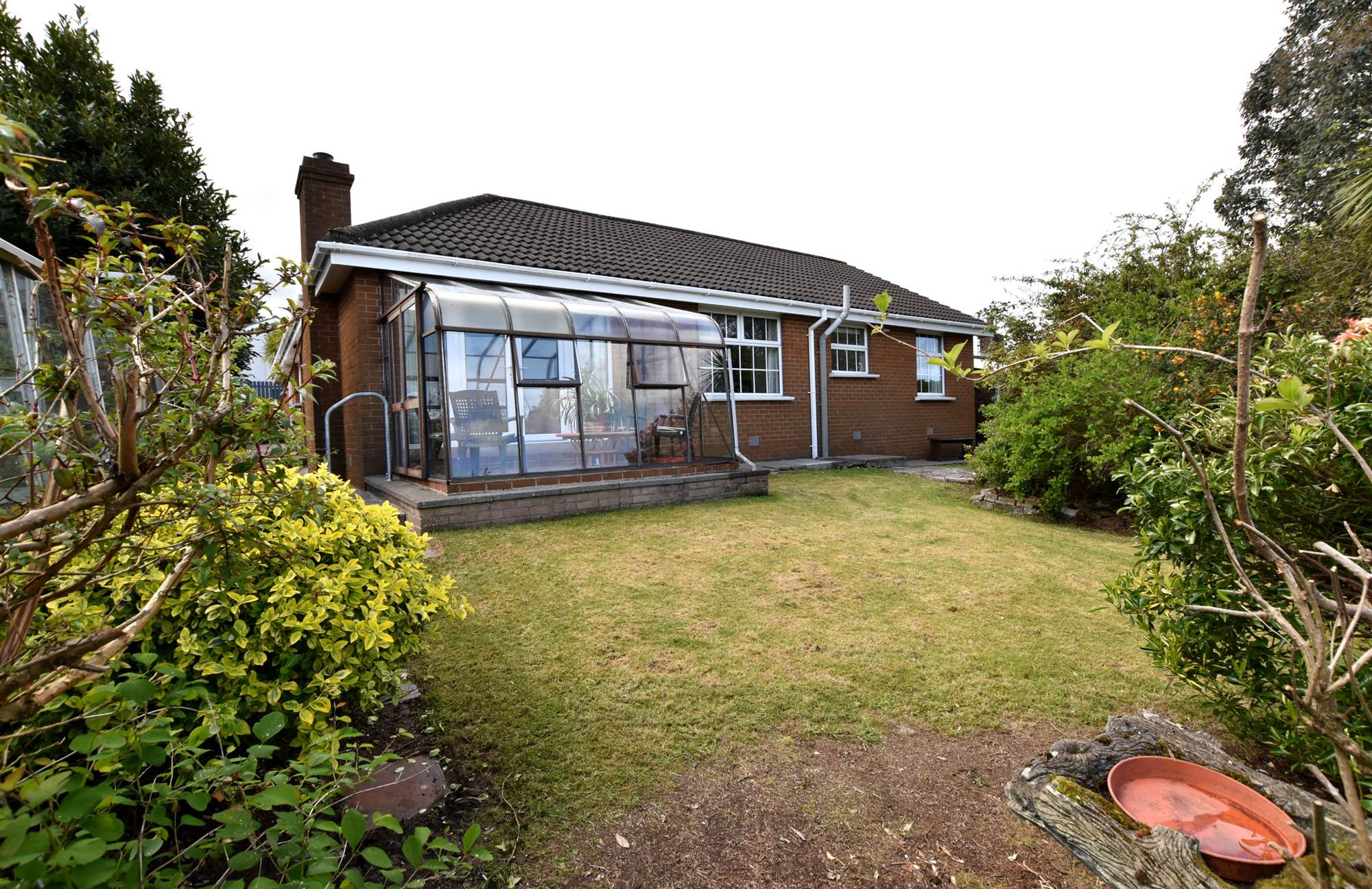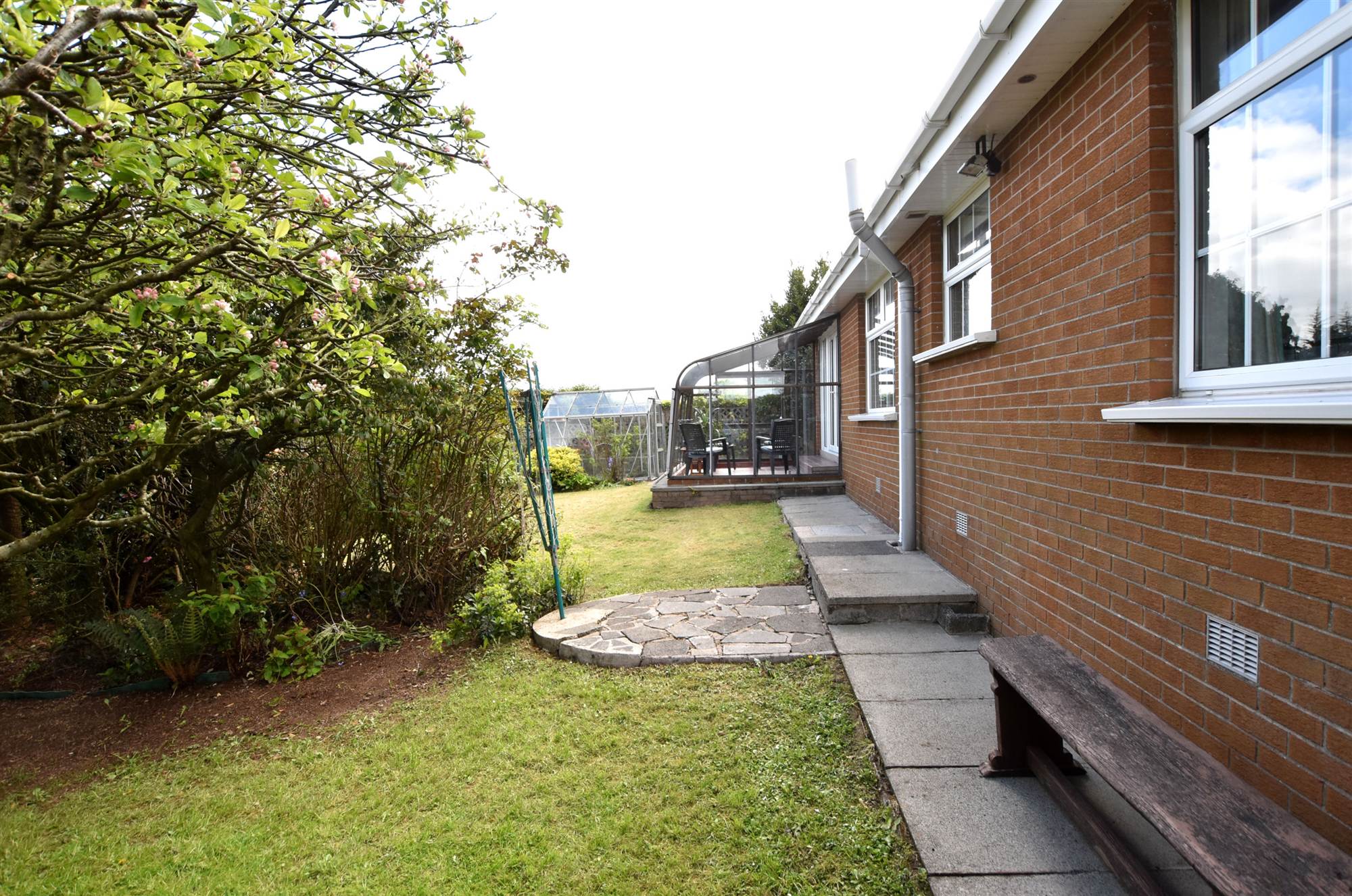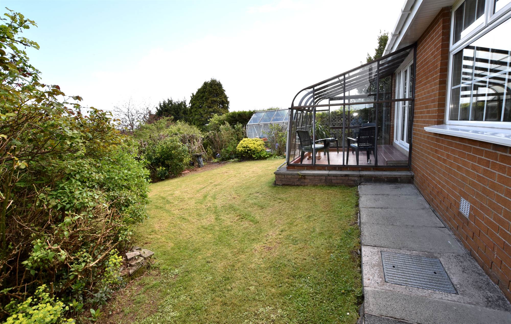 To side and rear in lawns, trees, bushes and paved patio area.