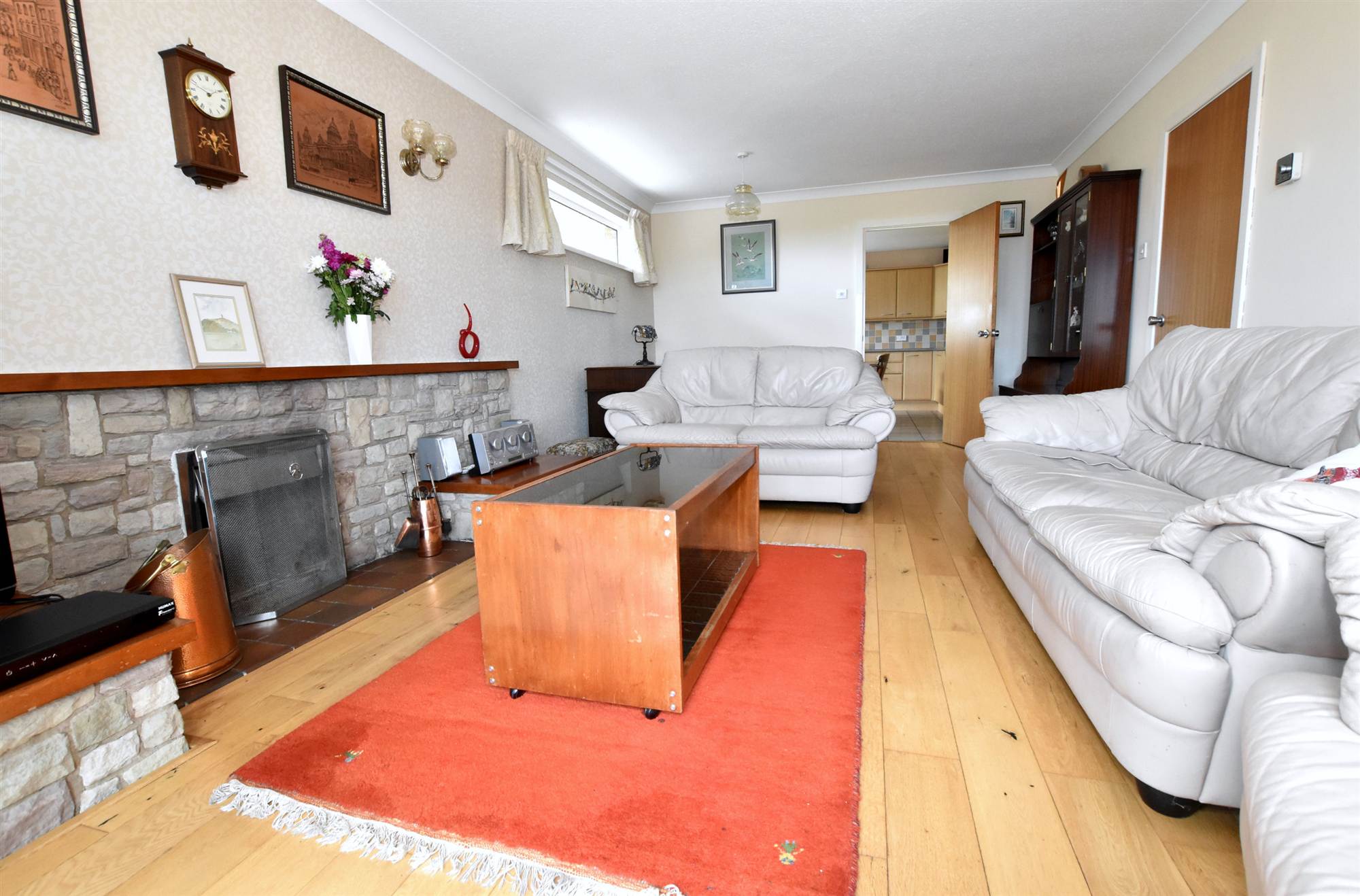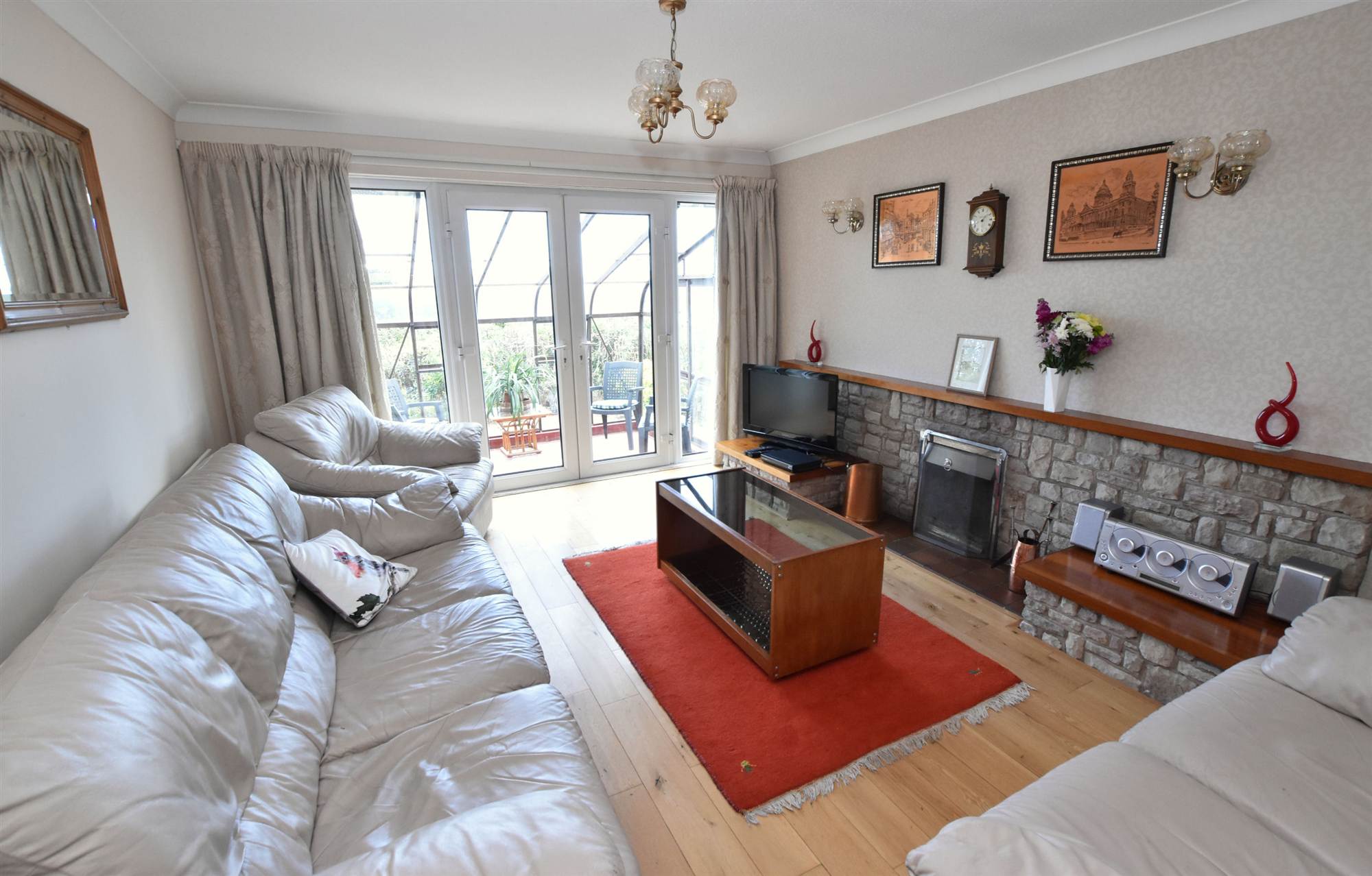 Feature Scrabo Stone fireplace, tiled hearth, polished wood floor, Upvc double glazed french doors to:.