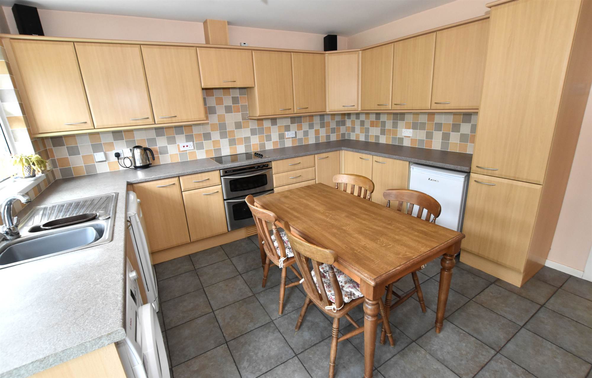1 ½ Tub single drainer stainless steel sink unit with mixer taps, range of high and low level units, formica round edged work surfaces, built-in double oven, four ring hob unit, extractor hood, plumbed for washing machine, plumbed for dishwasher, wall tiling, ceramic tiled floor.