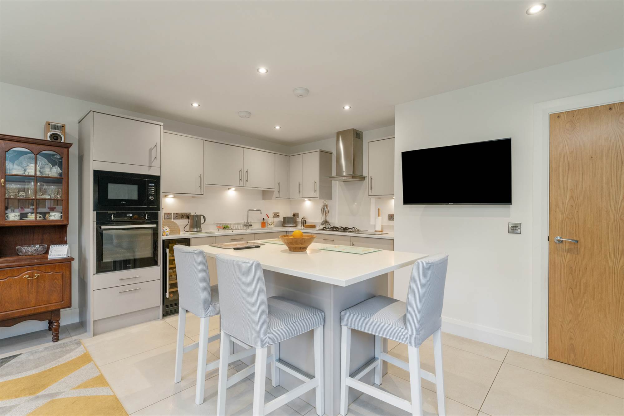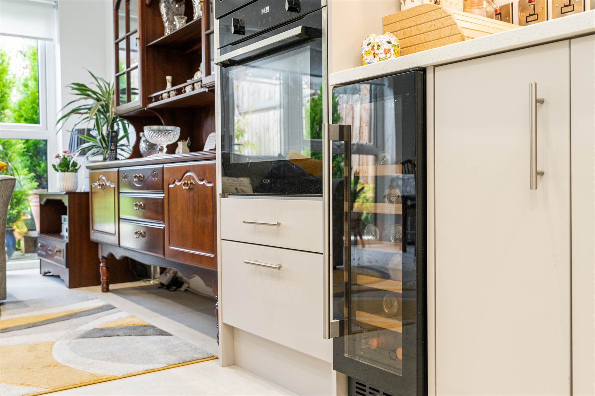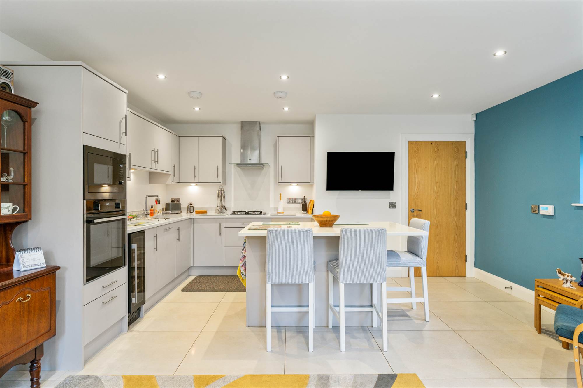 1.5 tub single drainer stainless steel sink unit with mixer taps, range of high and low level Putty coloured units, white Quartz work surfaces, 4 ring gas hob unit, stainless steel and glass extractor hood, built in oven, integrated microwave, dishwasher, under counter fridge and freezer, wine cooler, concealed lighting, island with breakfast bar, ceramic tiled floor, LED recessed spotlighting, uPVC double glazed French doors to rear, wired for wall mounted TV.