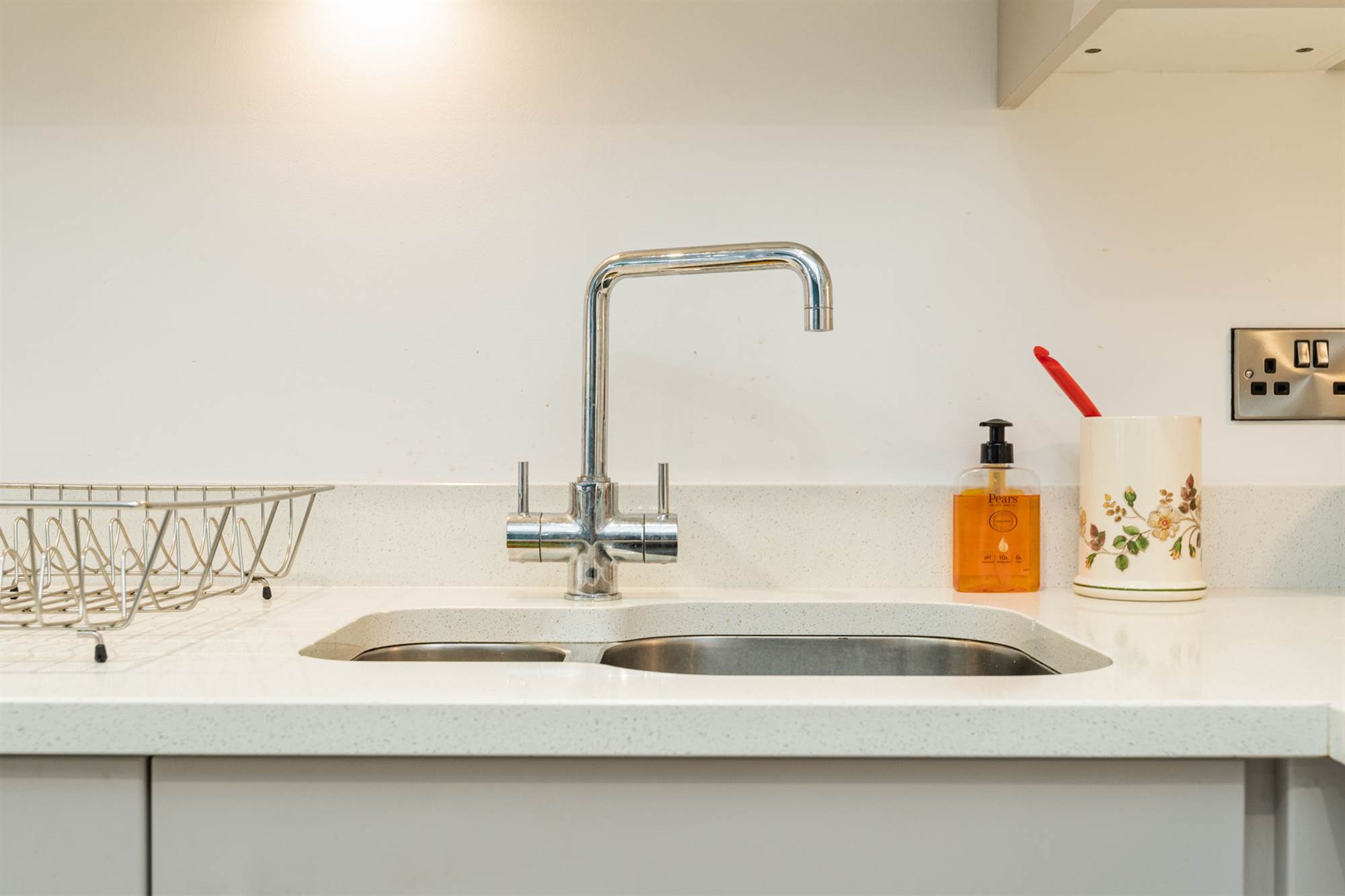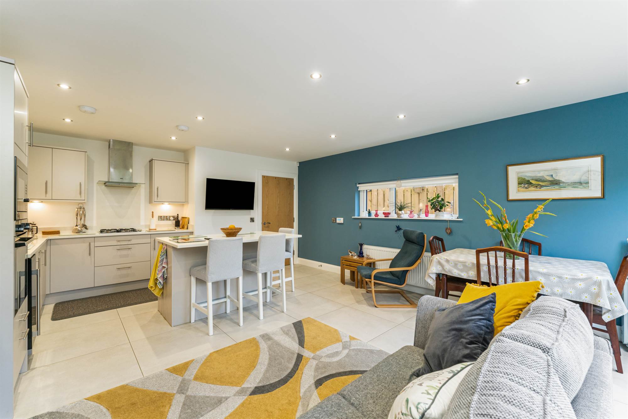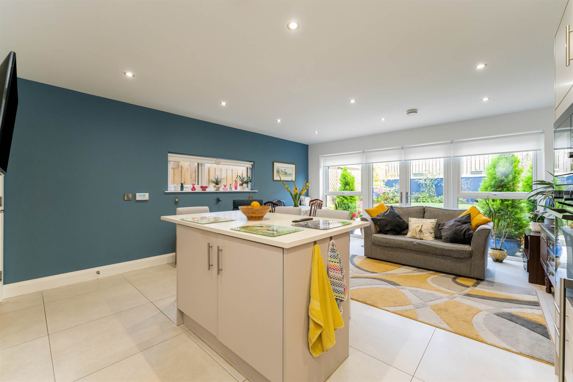 1.5 tub single drainer stainless steel sink unit with mixer taps, range of high and low level Putty coloured units, white Quartz work surfaces, 4 ring gas hob unit, stainless steel and glass extractor hood, built in oven, integrated microwave, dishwasher, under counter fridge and freezer, wine cooler, concealed lighting, island with breakfast bar, ceramic tiled floor, LED recessed spotlighting, uPVC double glazed French doors to rear, wired for wall mounted TV.