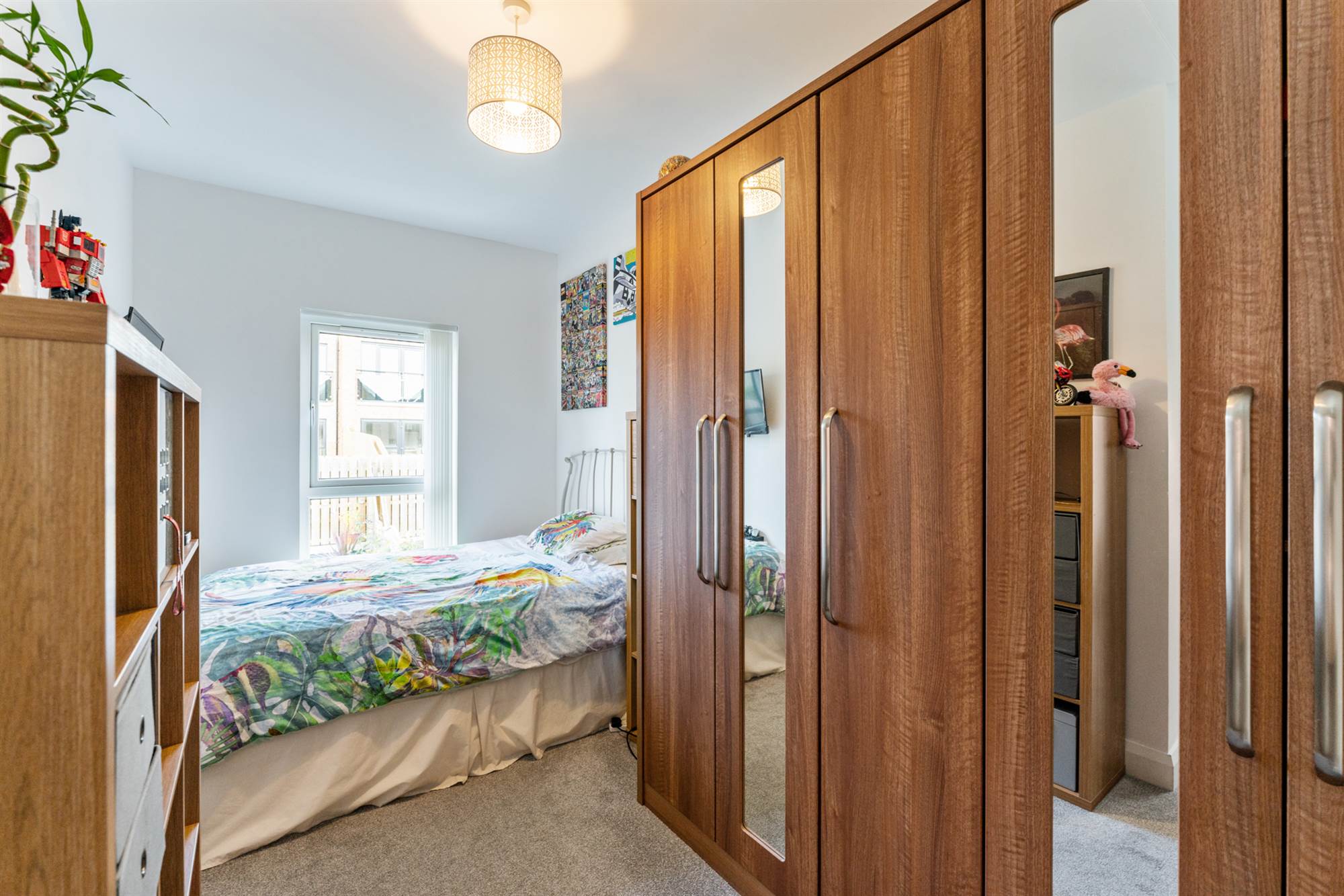 Garden to rear in manicured lawn, well stocked flowerbeds, modern paved patio, fencing, outside light, outside water tap, access to side for bins etc.