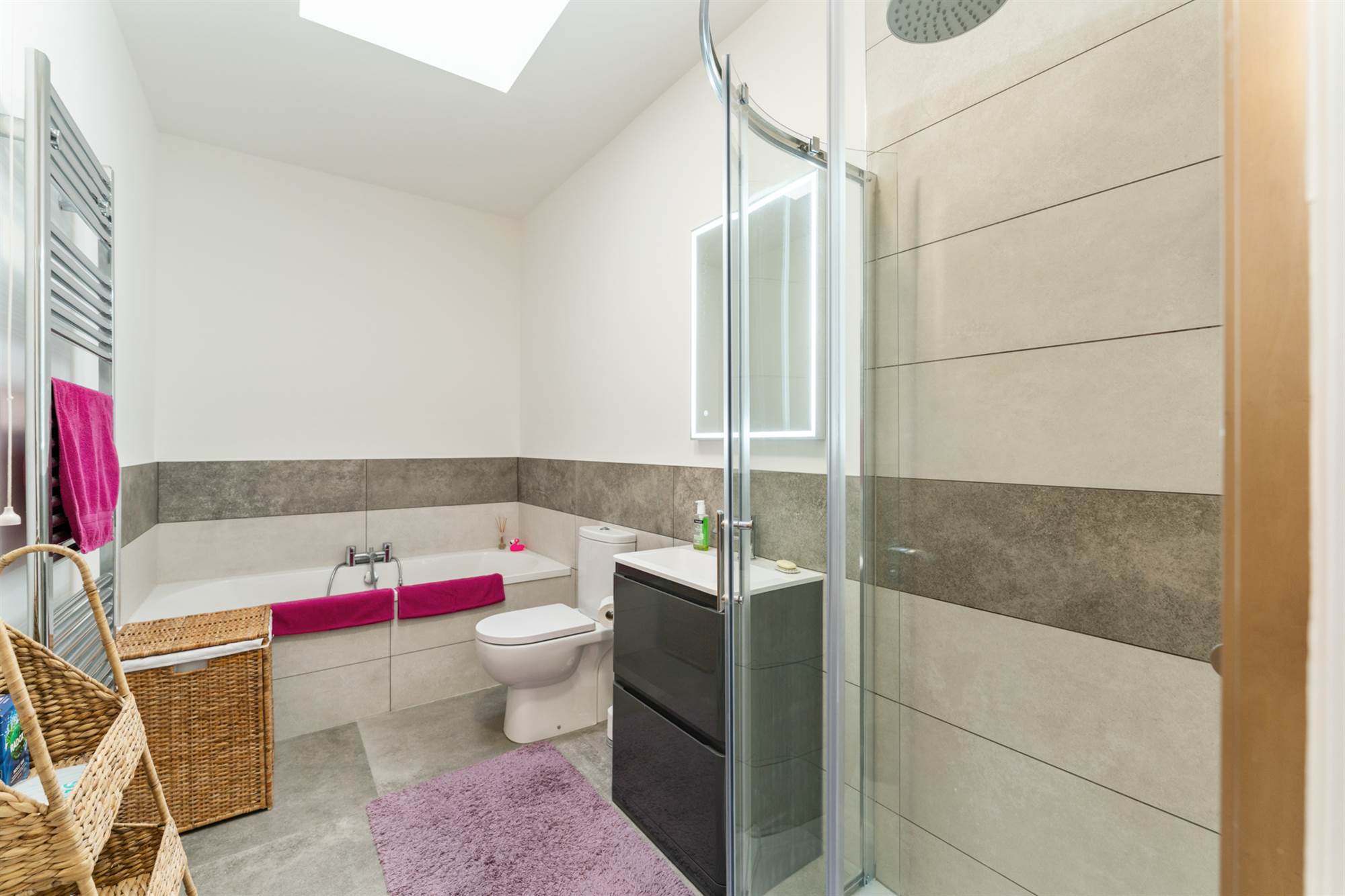 Modern white suite comprising: panelled bath with chrome mixer taps and telephone hand shower, large separate fully tiled shower cubicle with thermostatically controlled shower, rain head and telephone hand shower, grey high gloss vanity sink unit with mixer taps, wall mounted heated mirror with integral lighting, wall tiling, push button WC, chrome towel radiator, feature wall and floor tiling, keylite light well, LED recessed spotlighting, extractor fan.