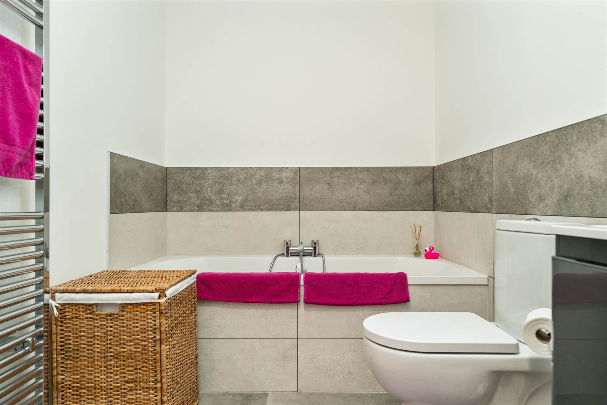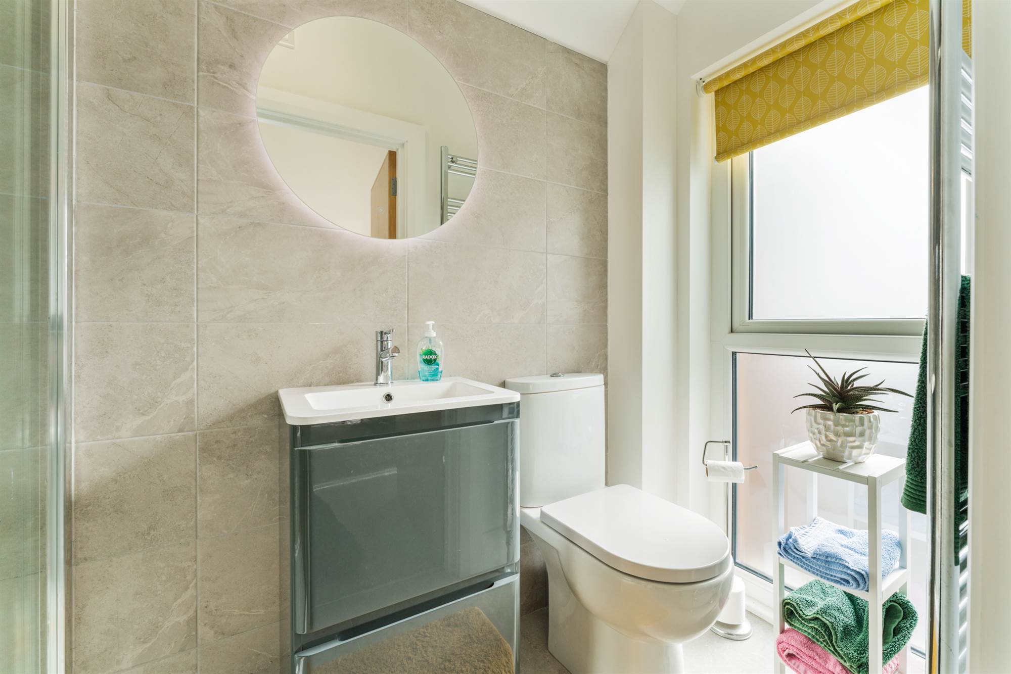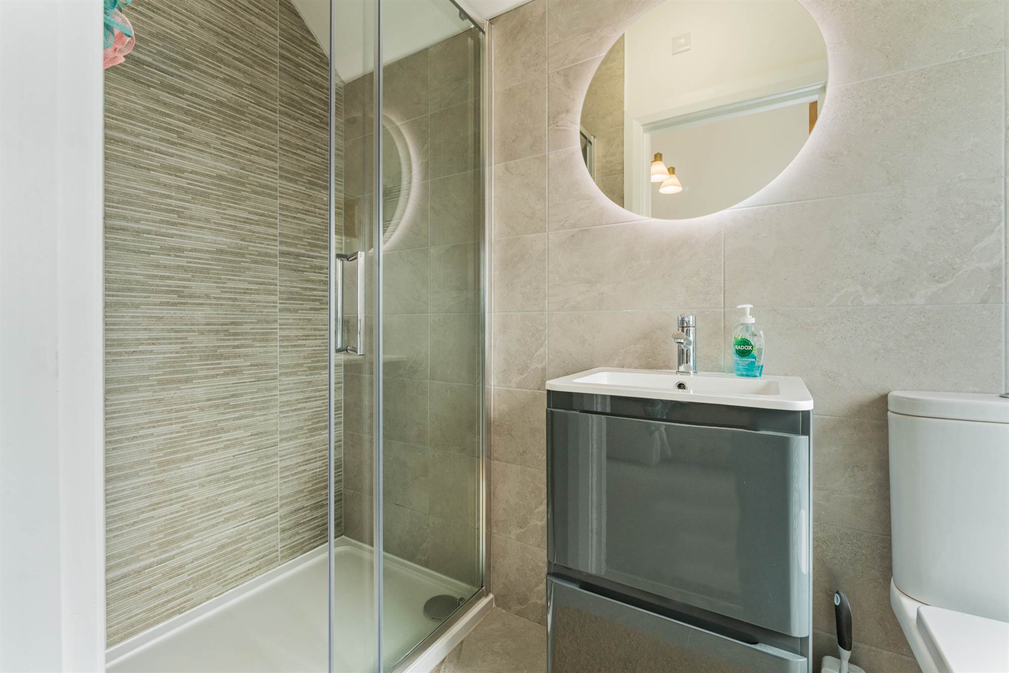 Modern white suite comprising: Large separate fully tiled shower cubicle with thermostatically controlled shower, rain head and telephone hand shower, grey high gloss vanity sink unit with mixer taps, push button WC, wall mounted heated mirror with integral lightingwall tiling, ceramic tiled floor, chrome towel radiator, LED recessed spotlighting, extractor fan.