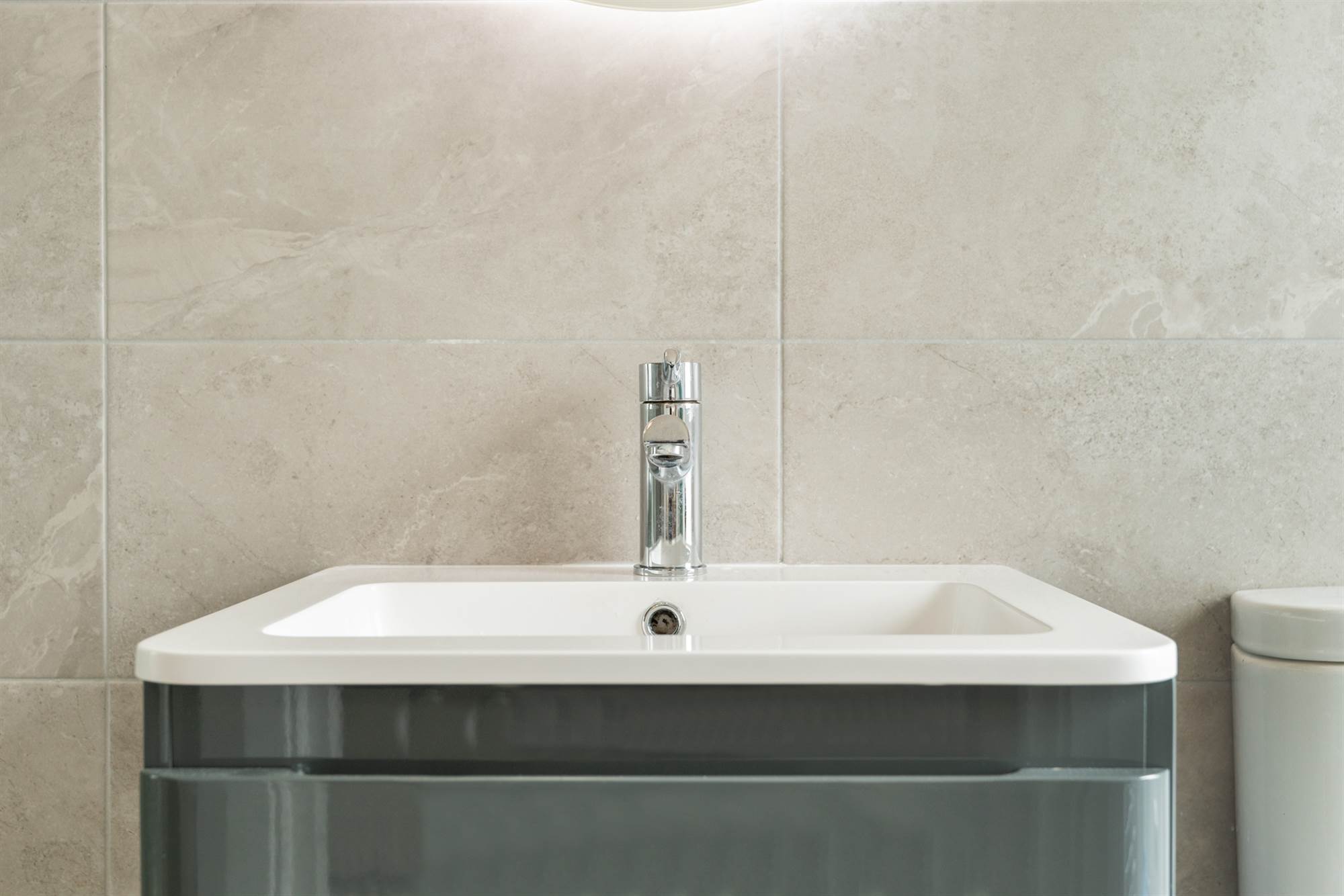 Modern white suite comprising: Grey high gloss vanity sink unit with mixer taps, push button WC, feature wall and floor tiling, extractor fan, LED recessed spotlighting.