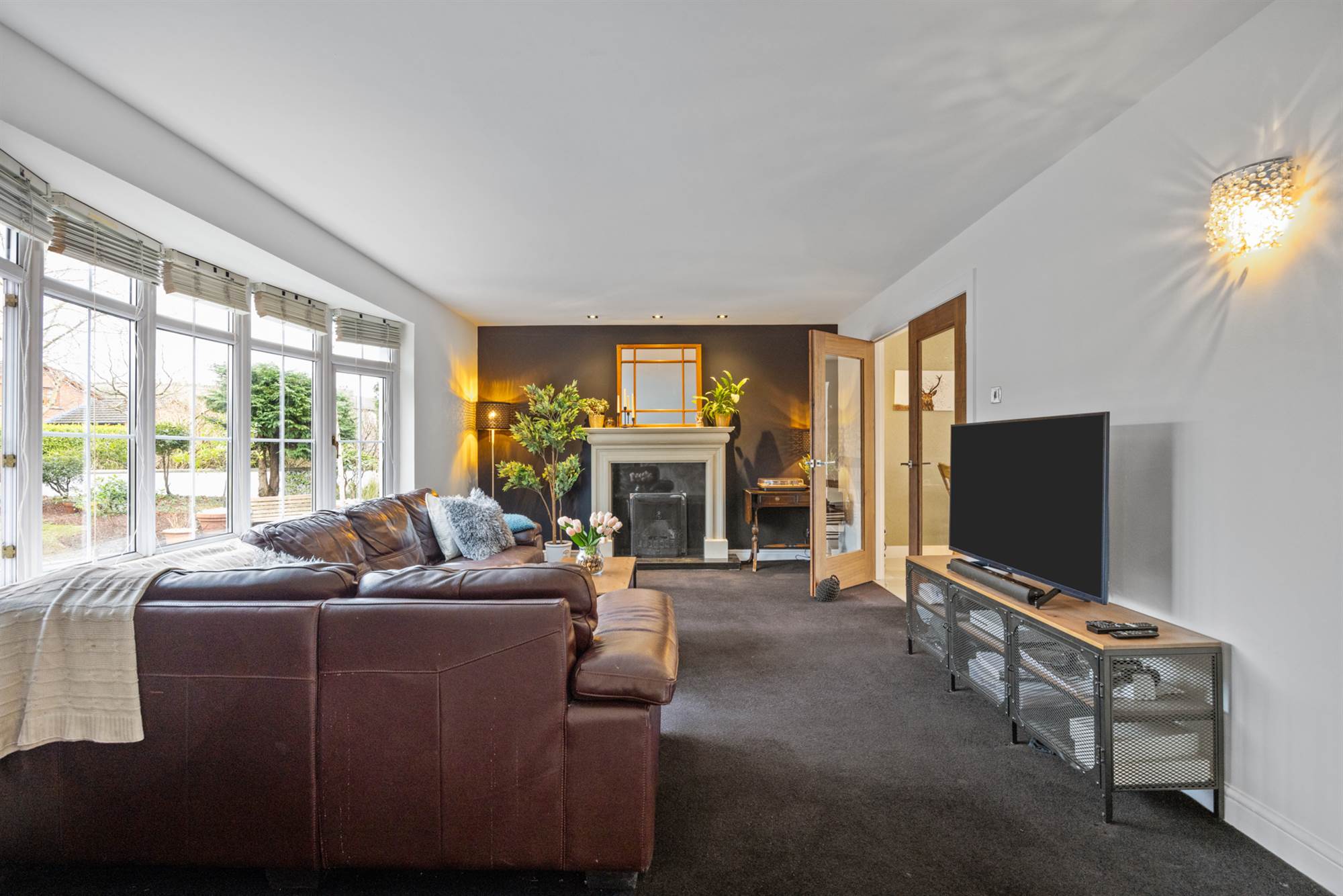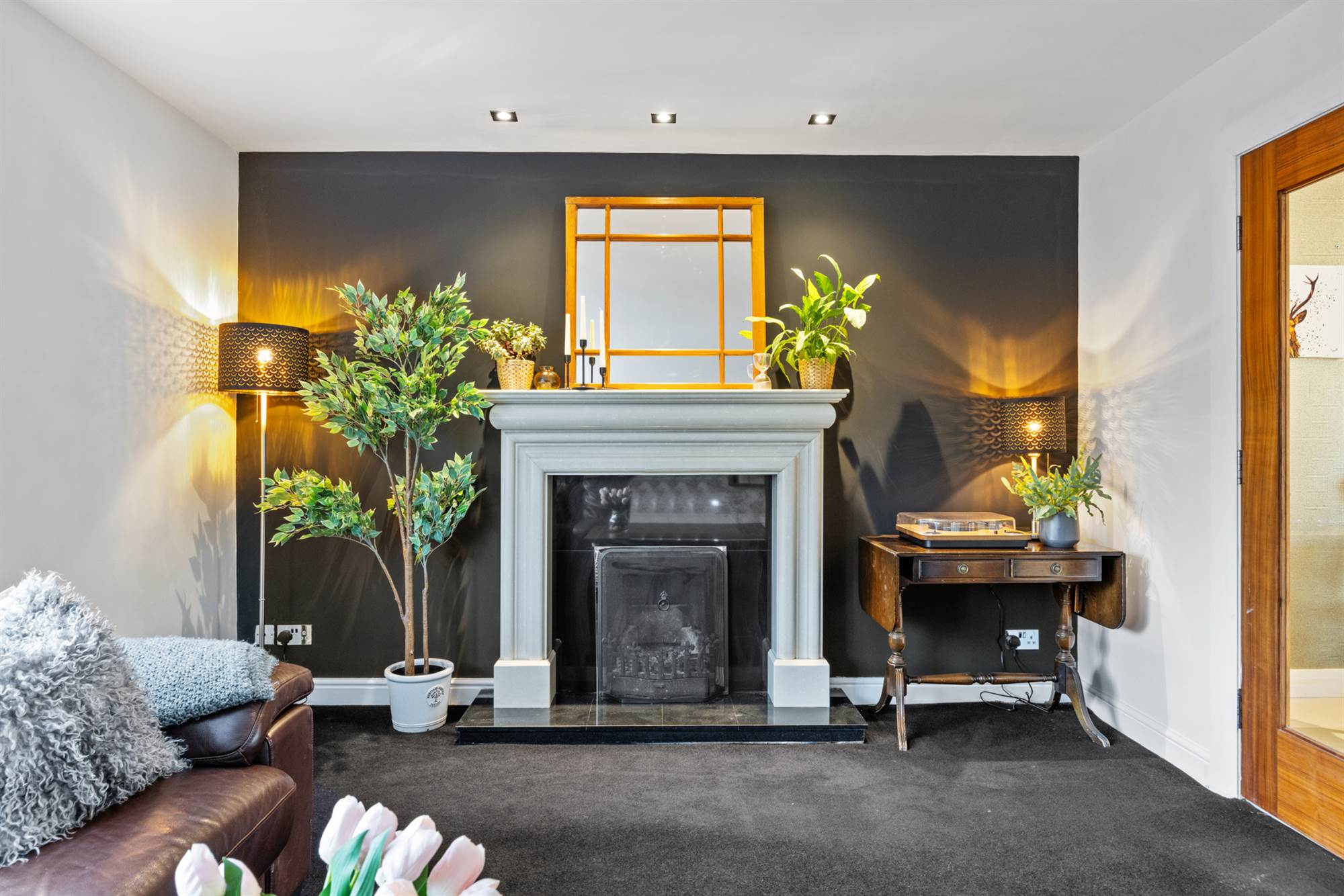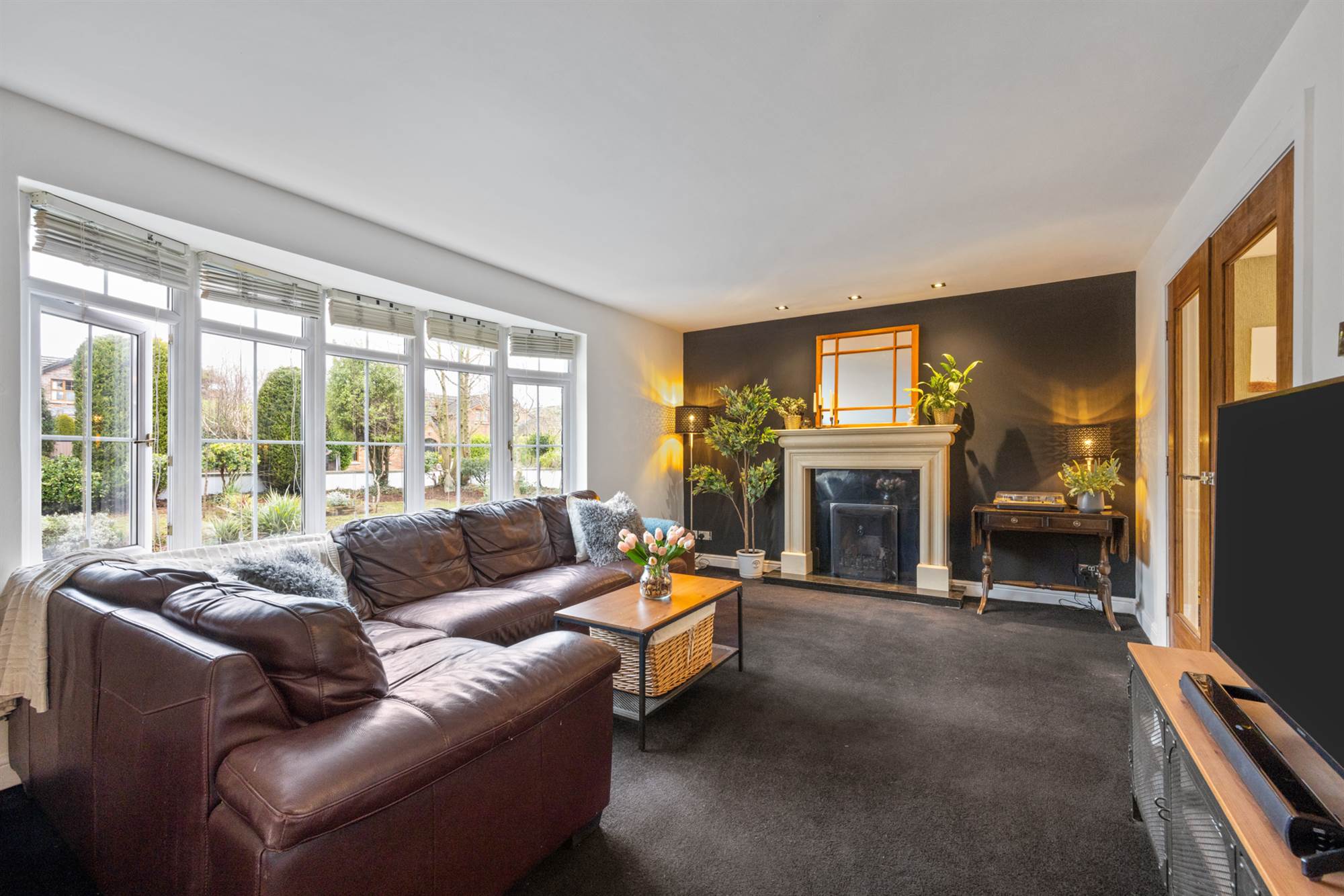 Attractive cream granite fireplace surround, black granite inset and hearth, open fire, TV point, LED recessed spotlighting, glazed double doors to Kitchen/Dining.
