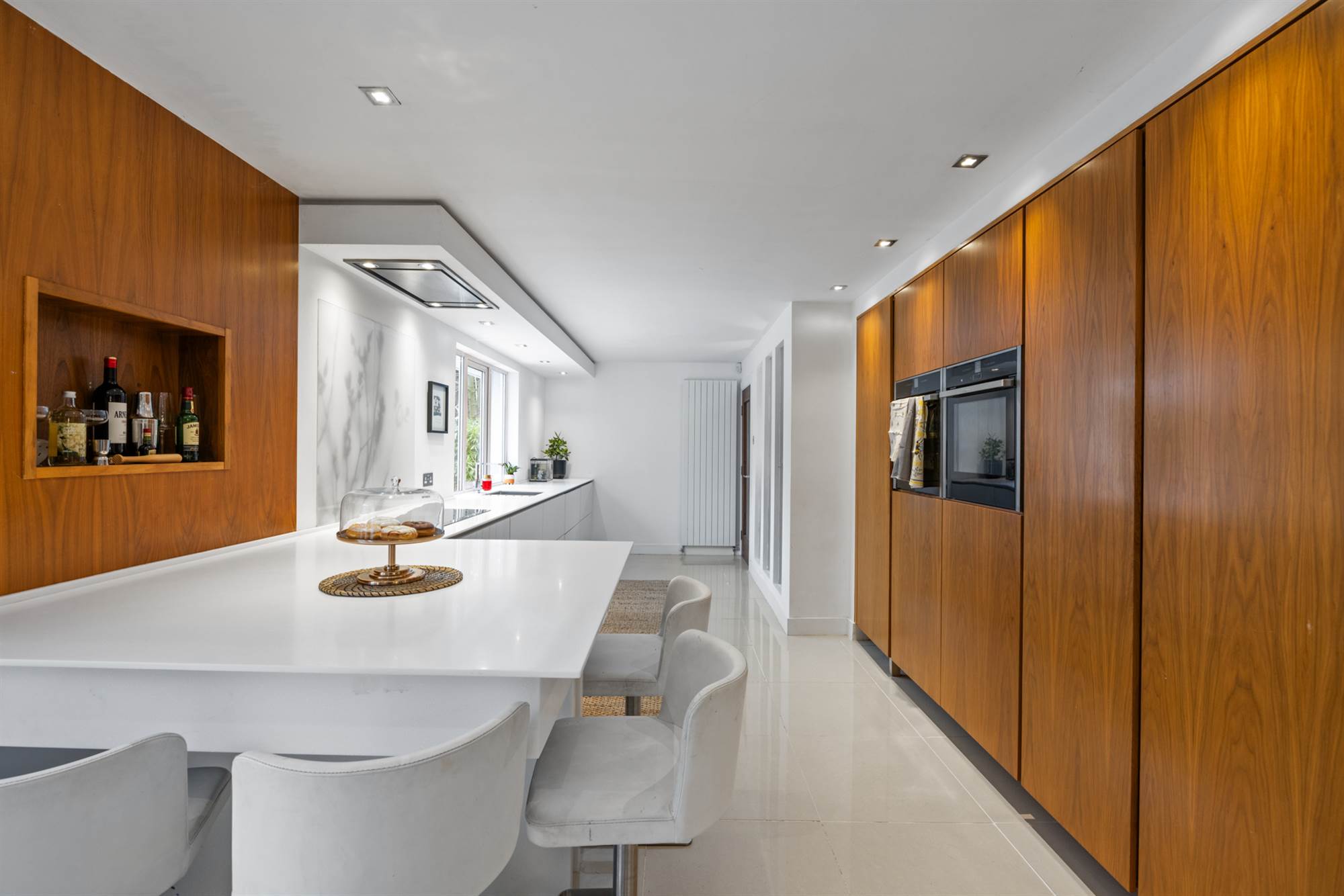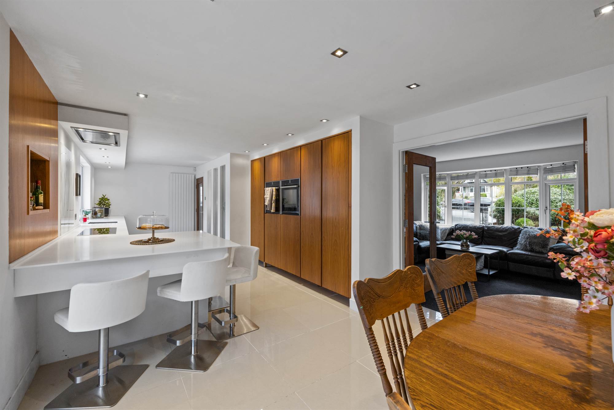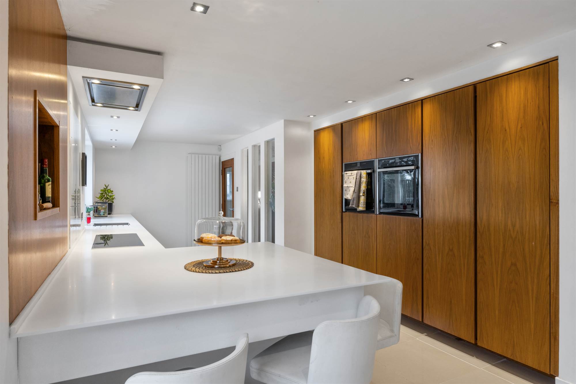 Luxury kitchen/ dining room with modern White and Walnut units, integrated appliance, Quartz tops and beautiful breakfast pantry