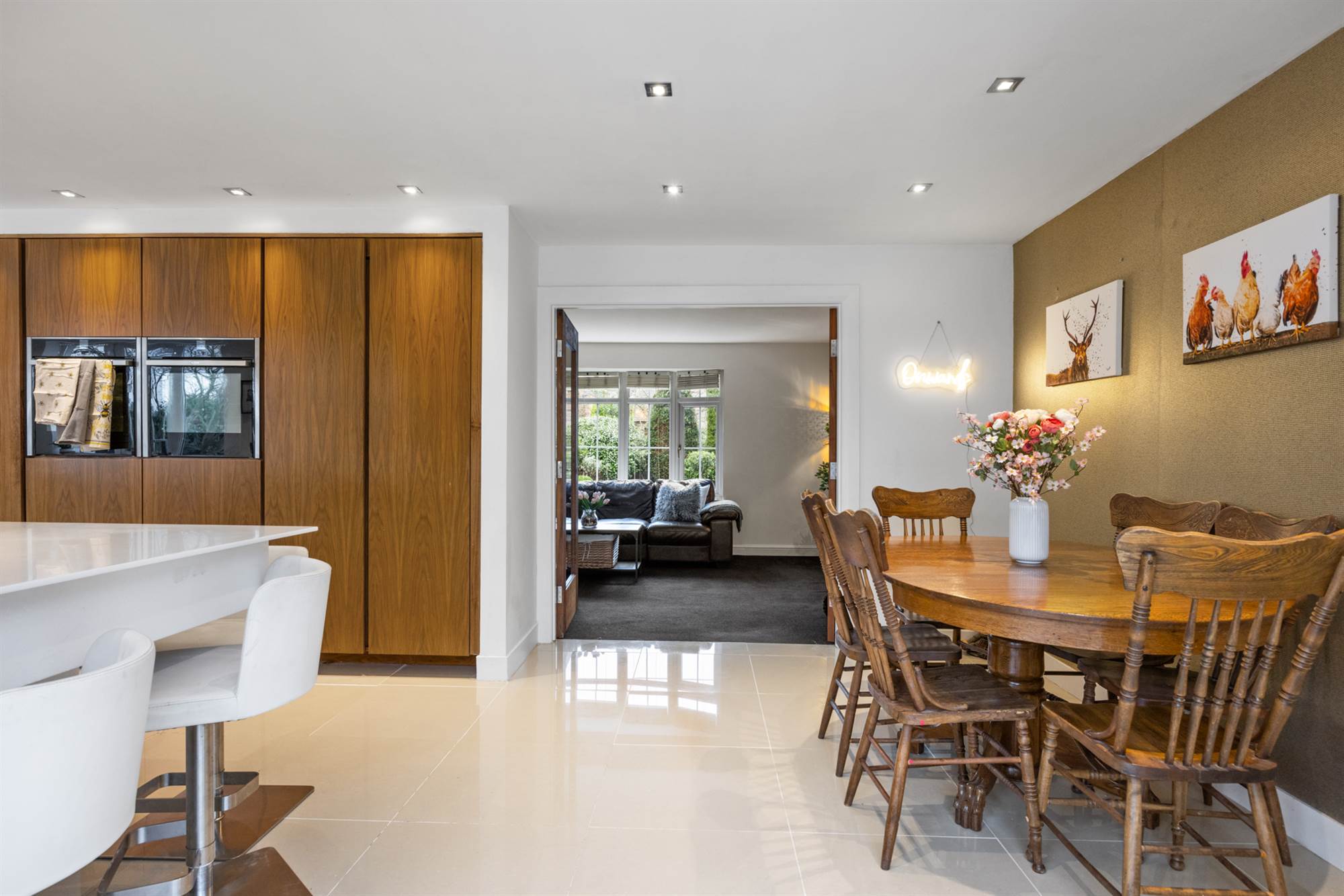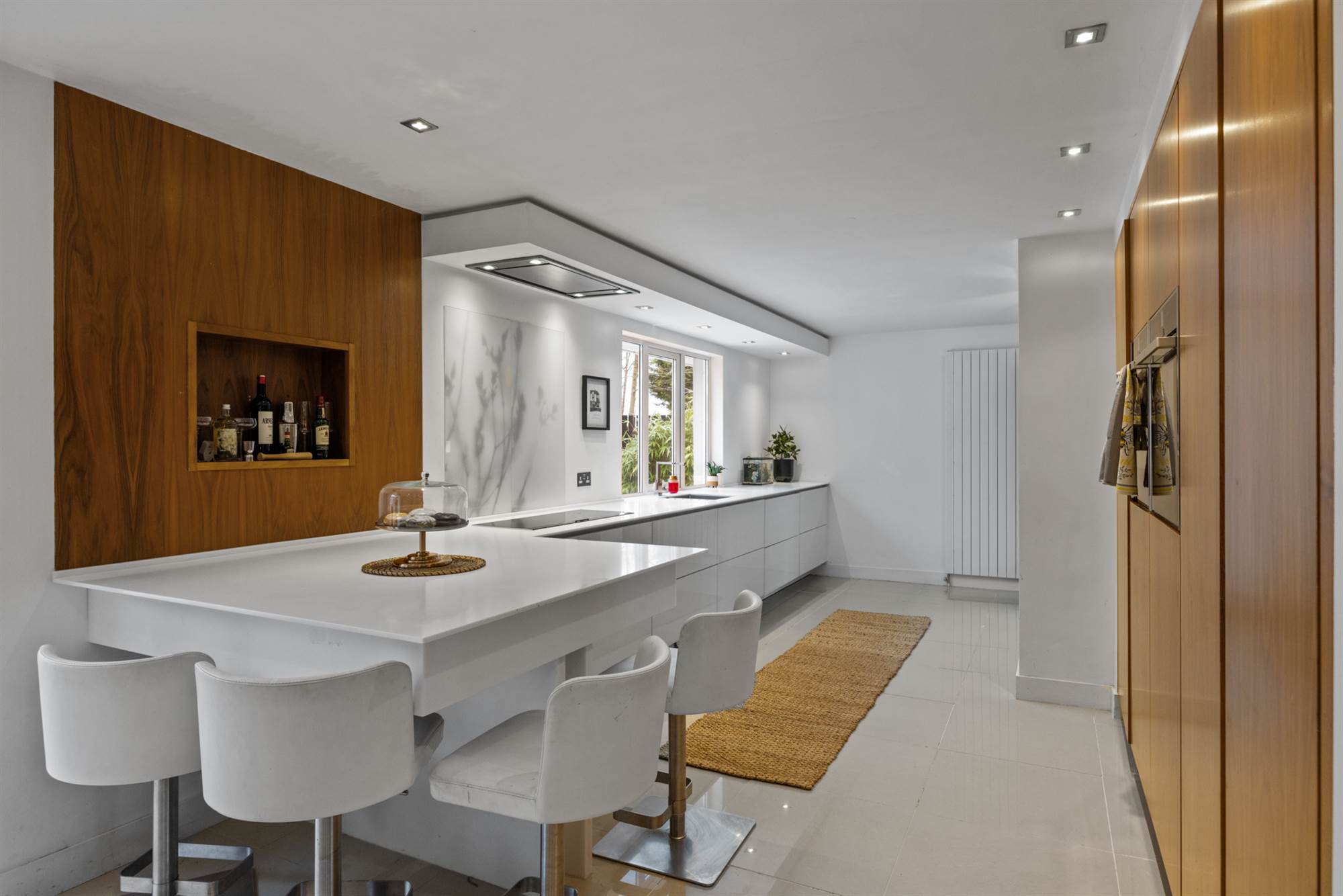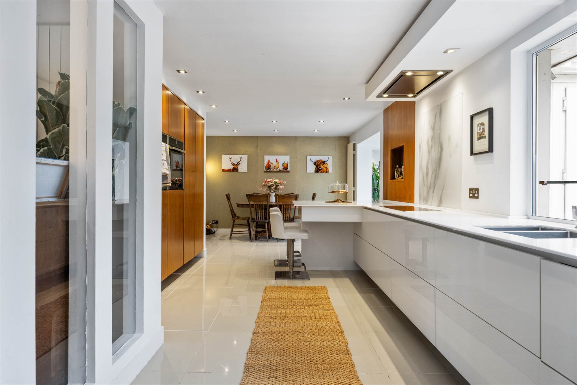 Luxury kitchen/ dining room with modern White and Walnut units, integrated appliance, Quartz tops and beautiful breakfast pantry