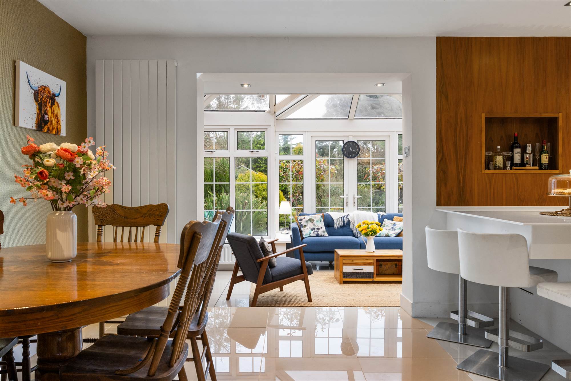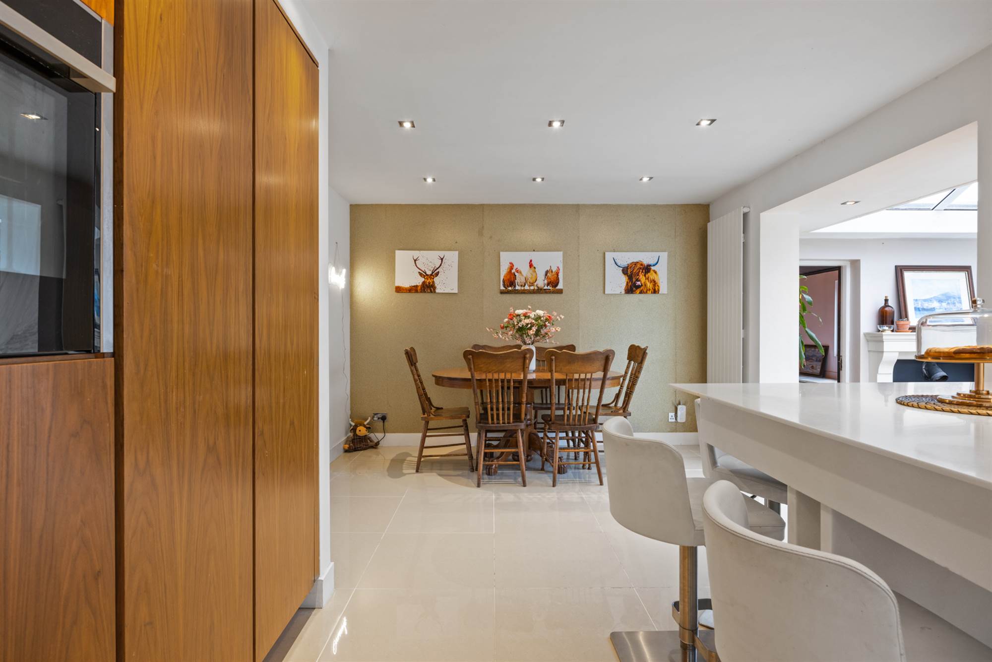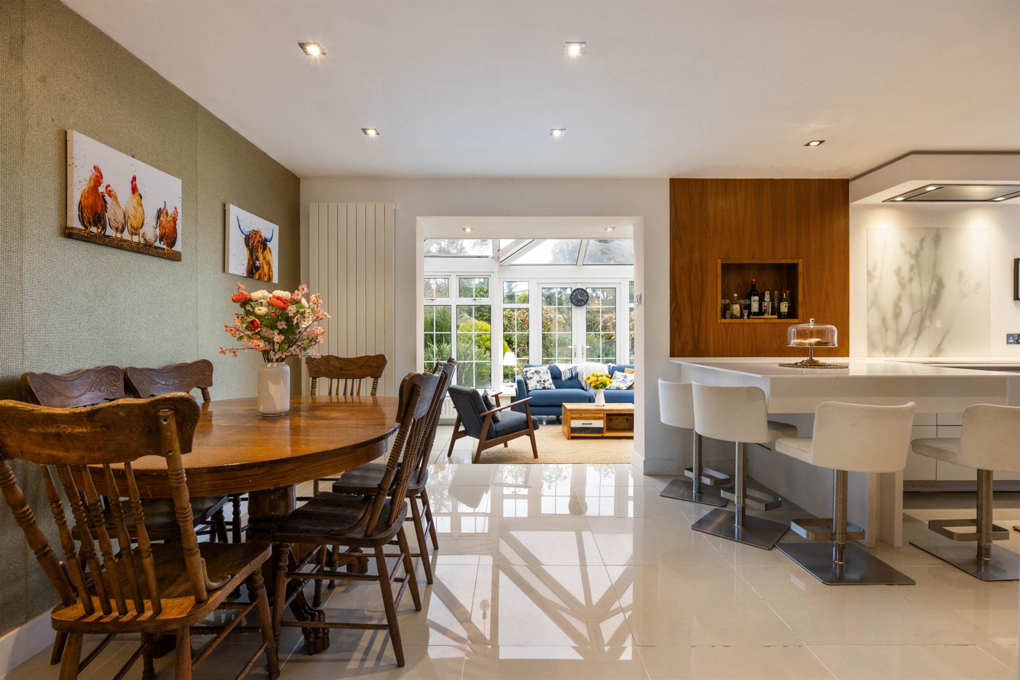 'Franke' 1.5 tub single drainer, stainless steel sink unit with mixer taps, excellent range of high and low level white and walnut units, Quartz tops, 'Siemens' 4 ring induction hob, recessed stainless steel extractor hood, twin 'Neff' built in ovens, integrated fridge freezer and dishwasher, concealed breakfast/coffee pantry, breakfast bar, 2 vertical radiators, cream Porcelain tiled floor, LED recessed spotlights, open to Conservatory.