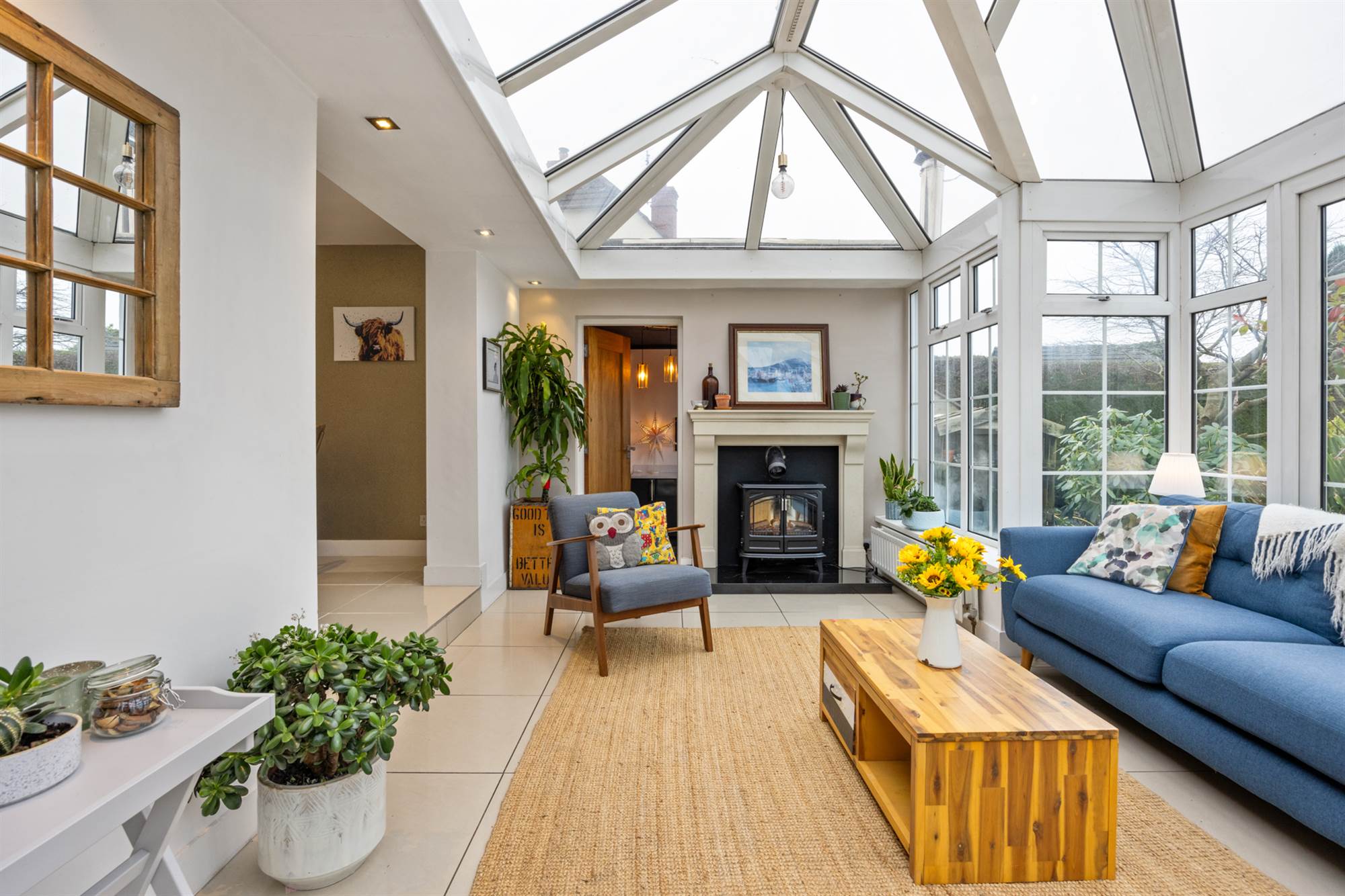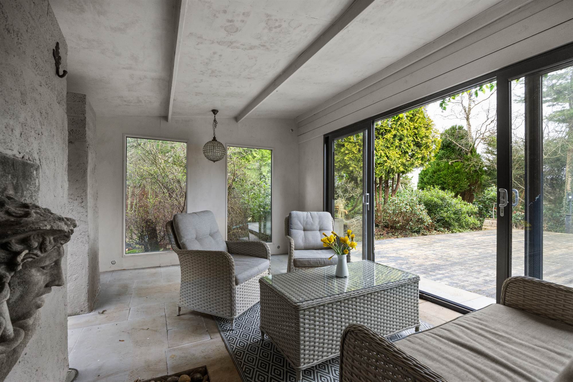 Externally, there is an attached garage which is currently separated into garage store and great sized home office via a stud wall and is accessed through the utility. The property rests on generous manicured lawns, well stocked shrub beds and borders, mature trees, hedging, and multiple patio/ deck areas. Of particular note, there is a garden room complete with water feature, electric underfloor heating and patio doors, opposite, there is a large outdoor stone clad fireplace with gas fire and bench seating. The dwelling is approached via a spacious tarmac driveway to front with additional driveway area going down the side into the rear garden, should you have a touring caravan or leisure boat to tuck away.