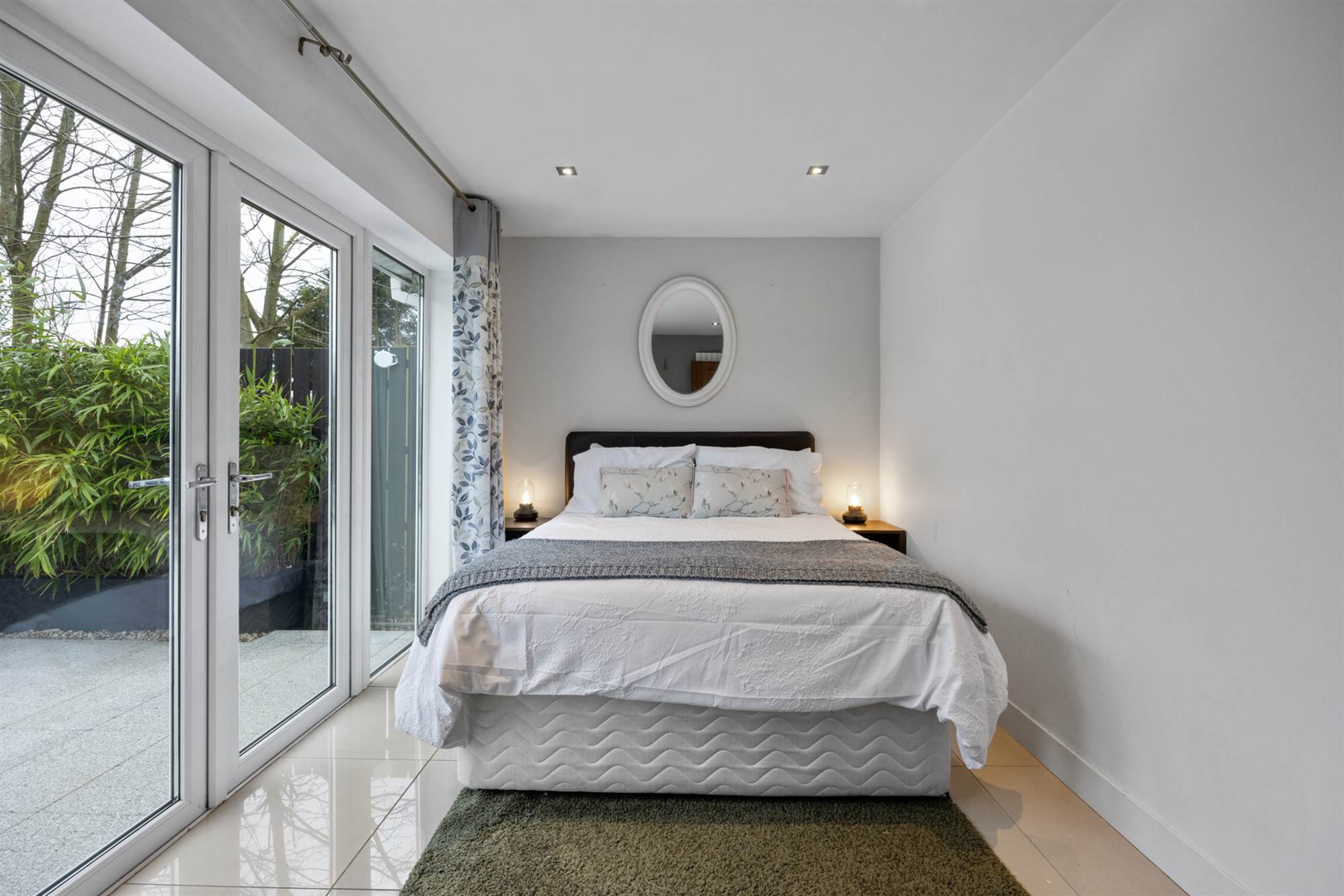 Cream Porcelain tiled floor, LED recessed spotlighting, uPVC double glazed French doors to rear, vertical radiator.