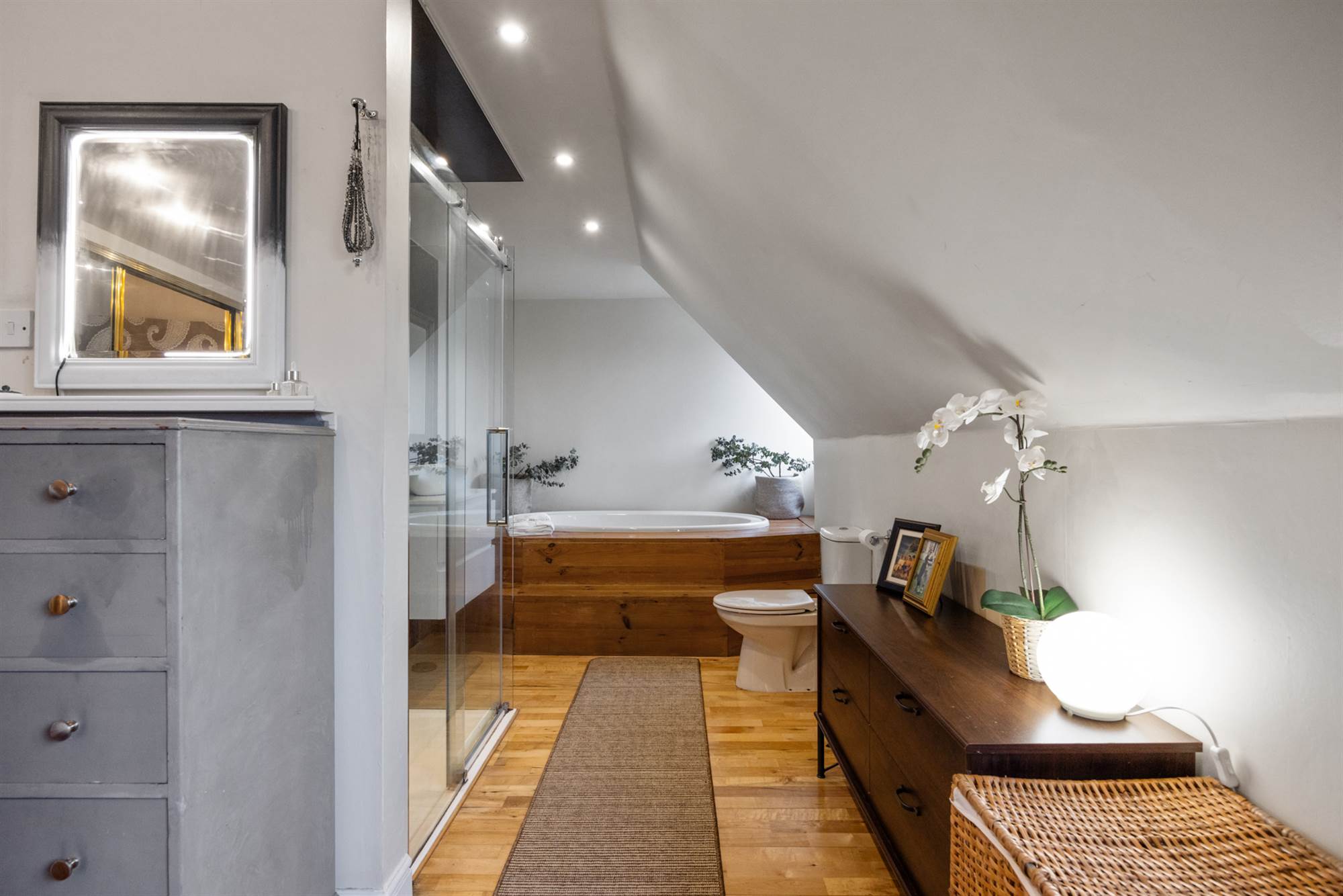 Modern white suite comprising: Large recessed bath with chrome mixer taps, separate fully tiled shower cubicle with Triton' thermostatically controlled shower, floating vanity sink unit with mixer taps, push button WC, polished oak floor, LED recessed spotlighting, extractor fan.