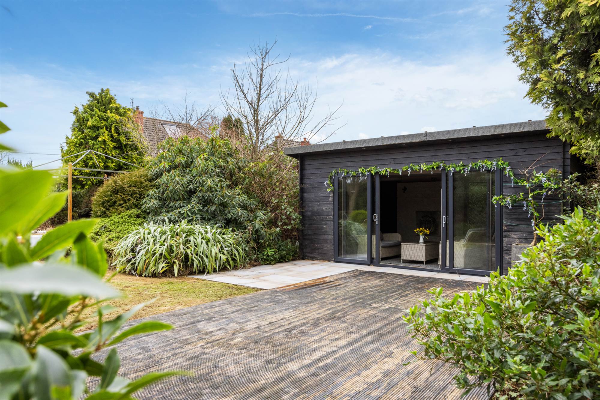 Resting on a circa 0.5 of an acre South facing plot, the gardens are remarkable and offer a multi-layered planting scheme creating formal and informal areas in which to entertain, alfresco dine and enjoy, at the far rear is a large, wooded, area ideal for a growing families to build dens, enjoy a camp fire and have garden adventures.