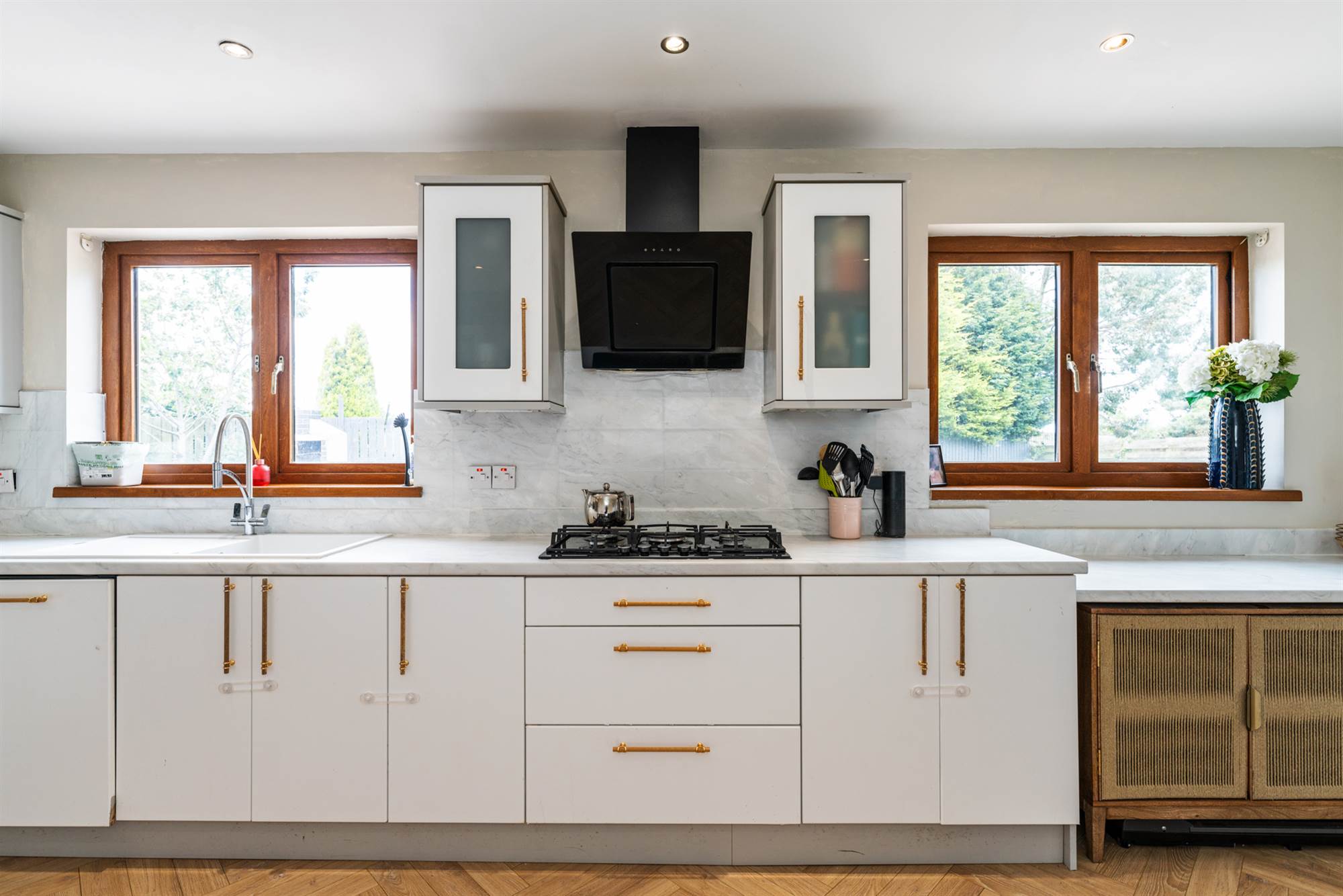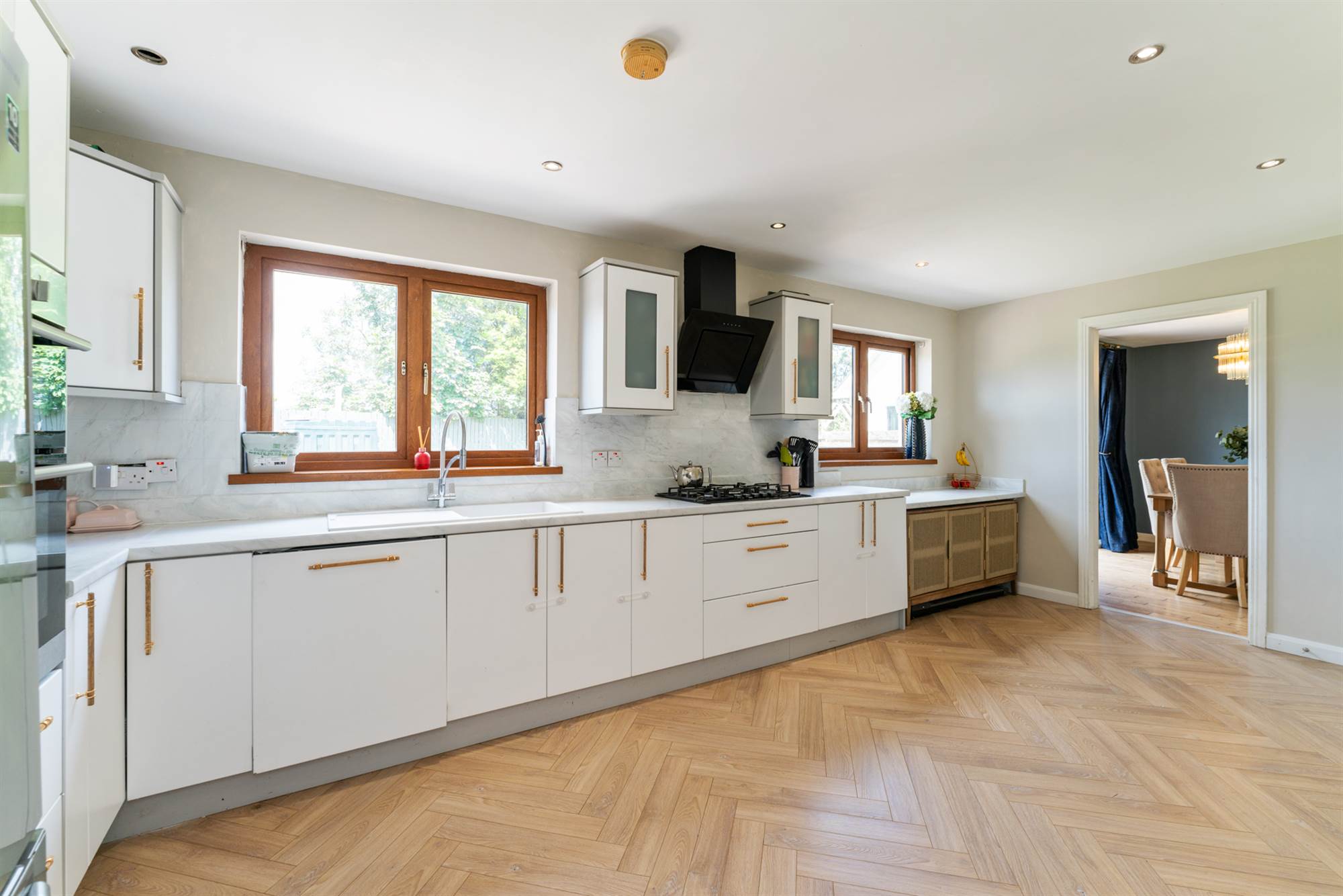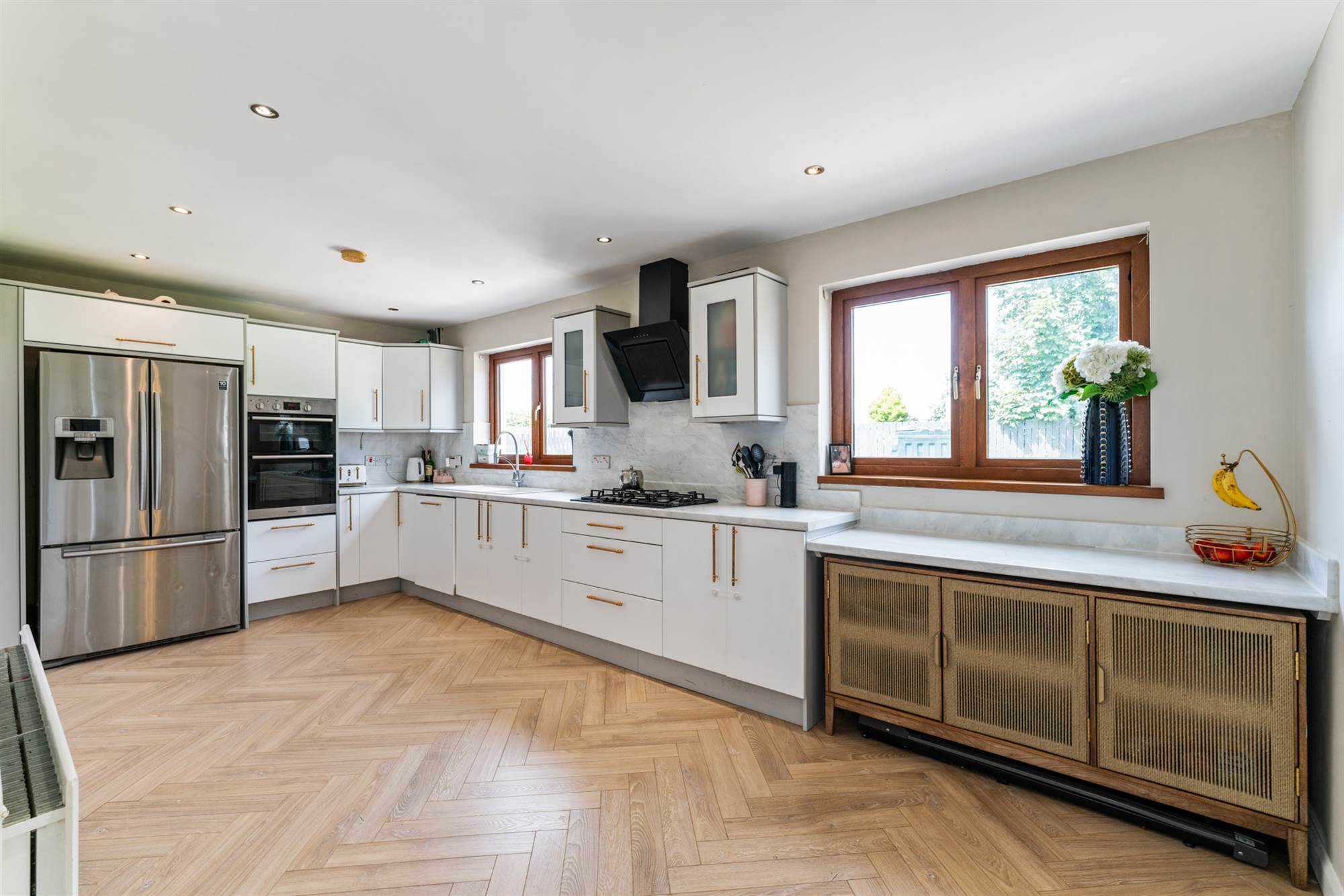 White Single drainer sink unit, mixer taps, excellent range of high and low level units, Marble effect formica round edge worksurfaces, 5 ring gas hob unit, Black extractor hood, double built in oven, integrated dishwasher, recess for American style fridge freezer, glazed cabinets, wall tiling, polished laminate herringbone floor, breakfast bar.
