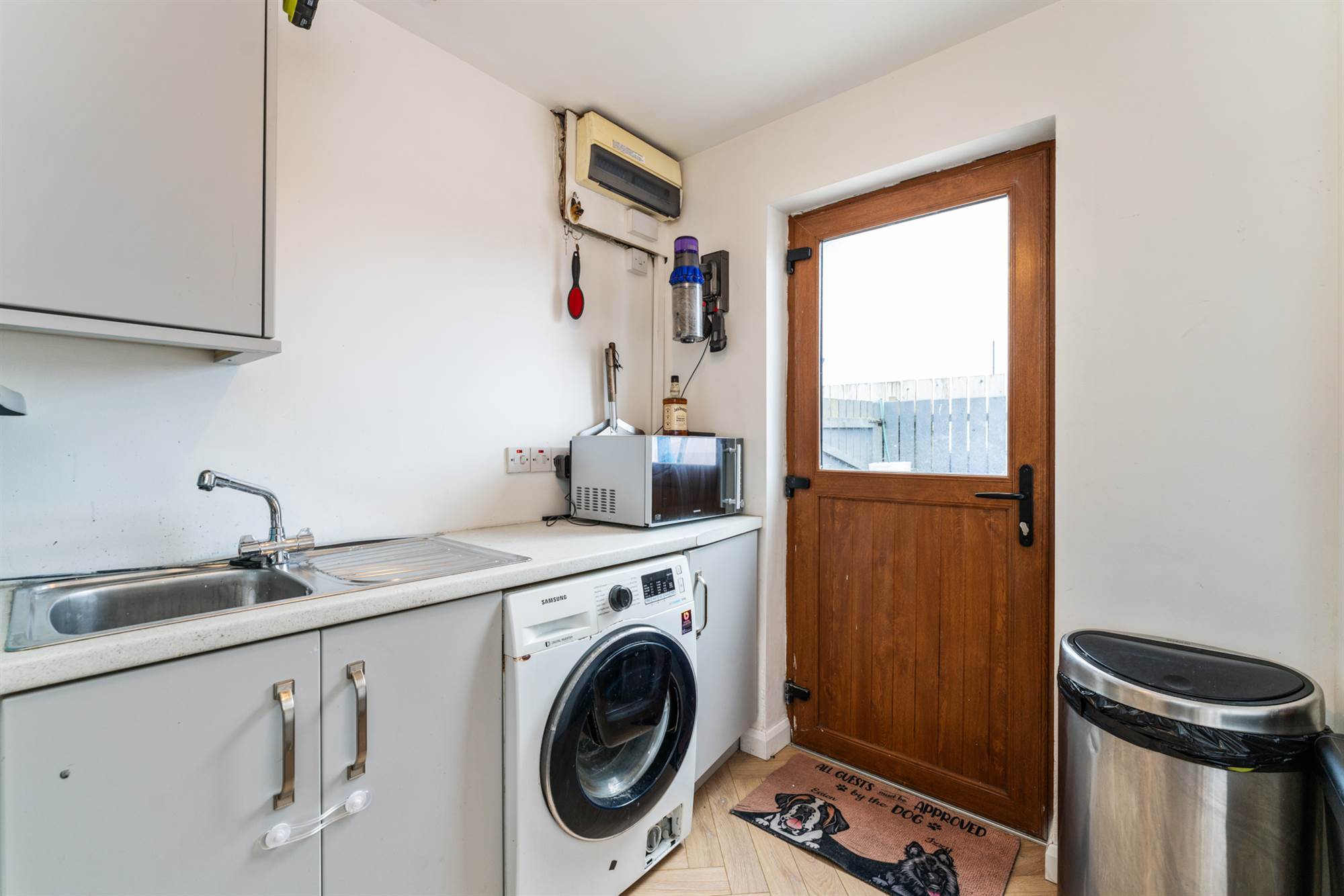 Stainless steel sink unit, mixer taps, range of high and low level units, plumbed for washing machine, polished laminate herringbone floor, Upvc double glazed door to side.
