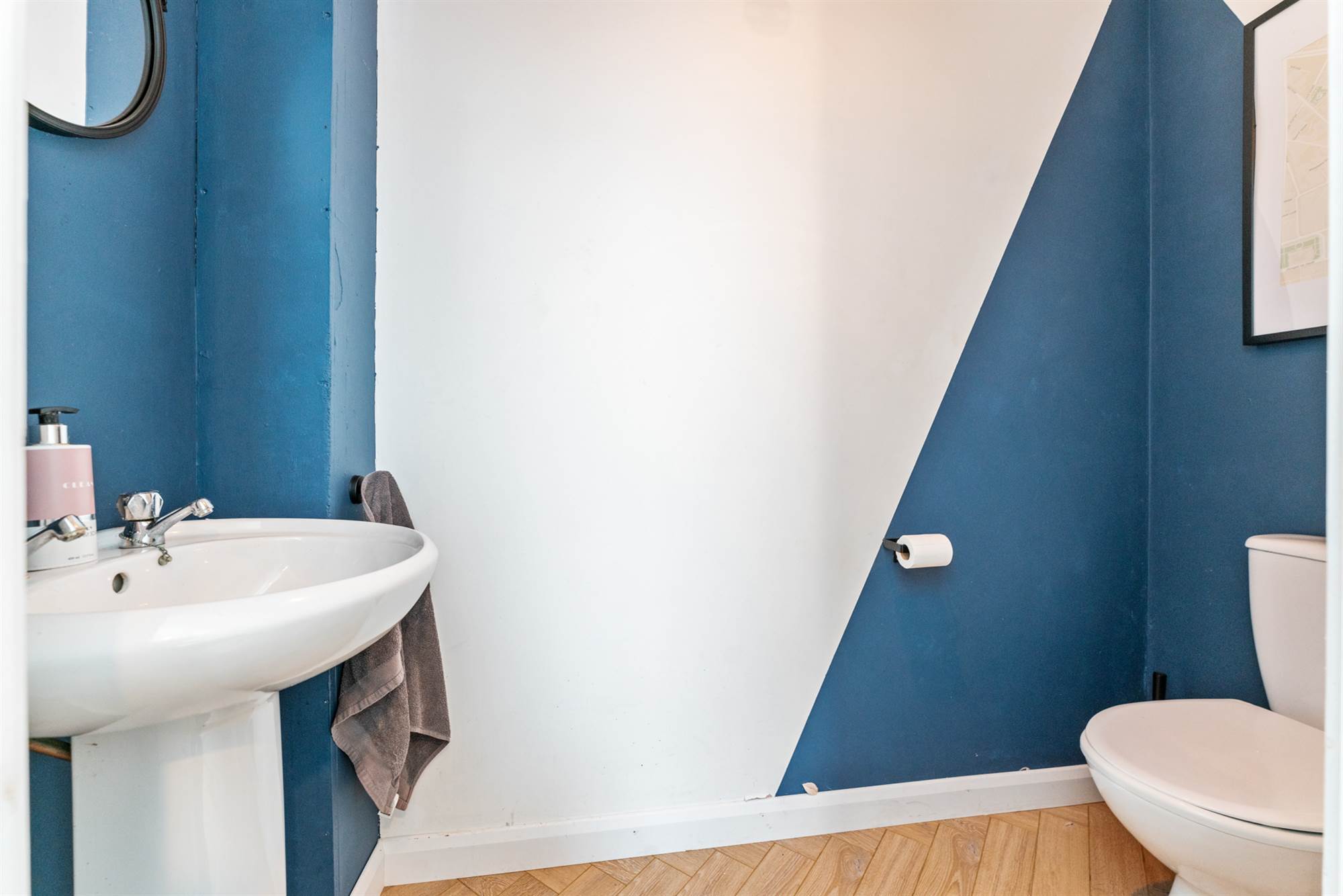 Comprising White suite with pedestal wash hand basin, low flush WC,polished laminate herringbone floor.
