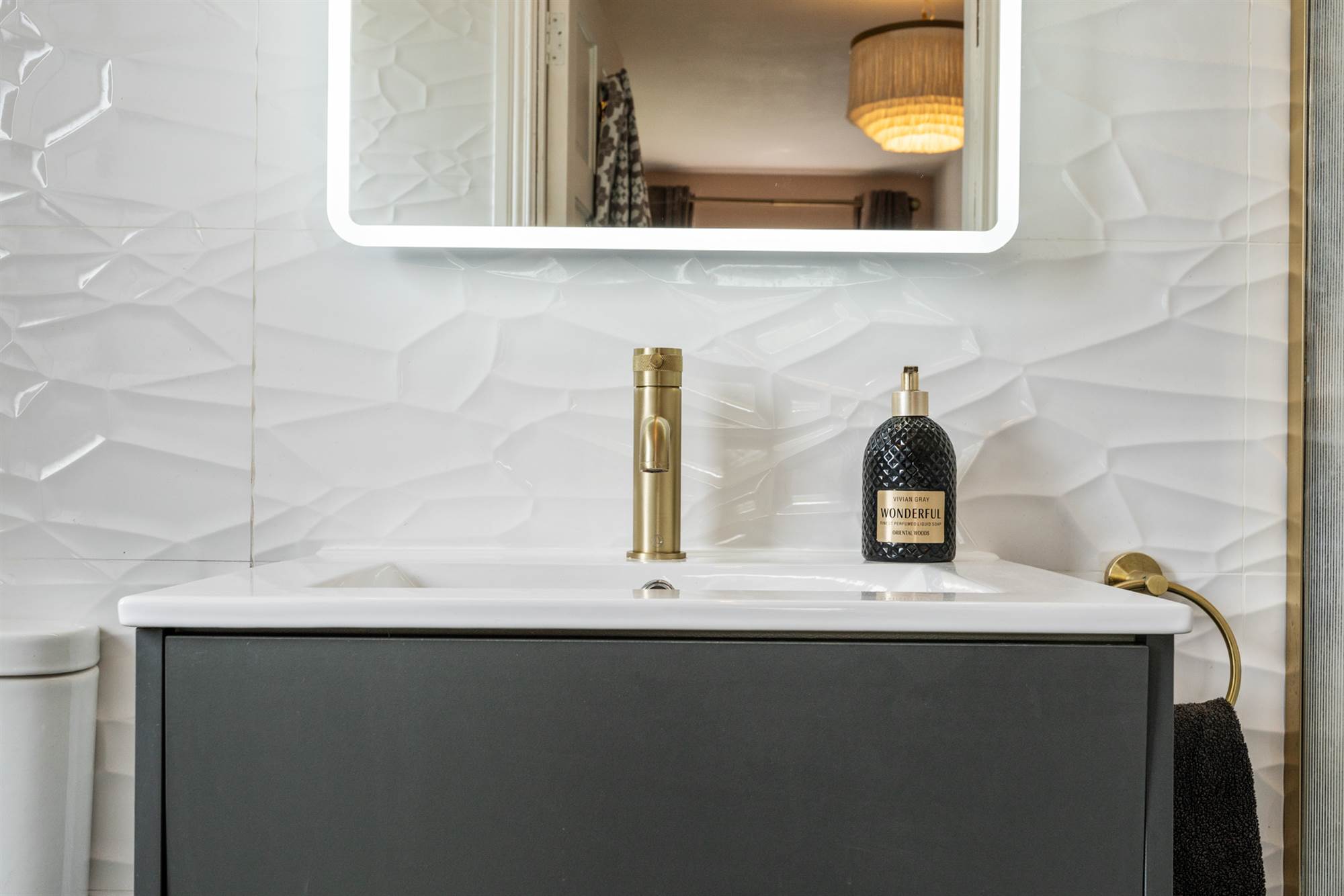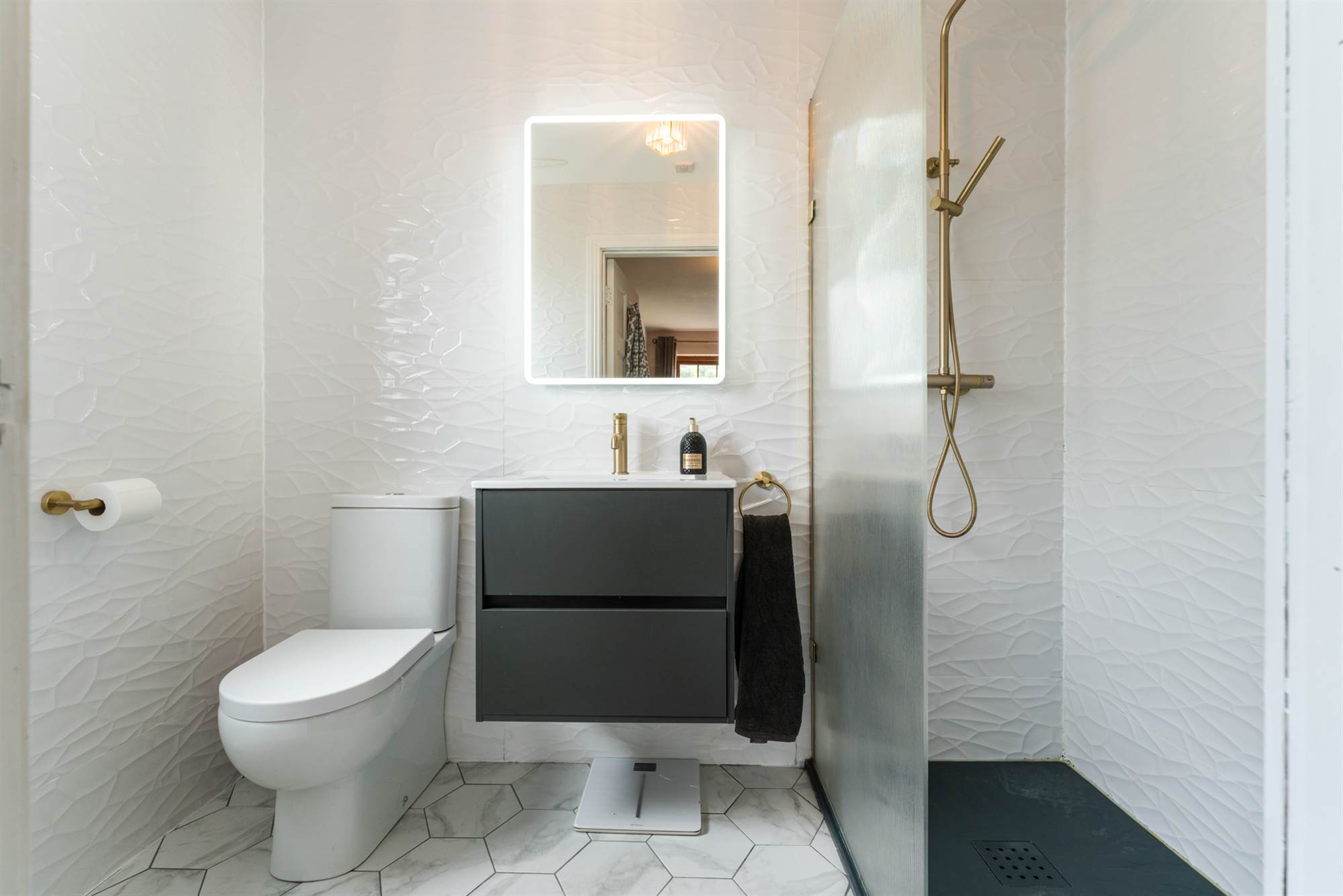 Comprising modern White suite with large separate fully tiled shower cubicle, glass panel, thermostatically controlled shower, rain head and telephone hand shower, floating vanity unit with wash hand basin and mixer taps, push button WC, extensive feature wall tiling, wired for wall mounted mirror, extractor fan, ceramic tiled floor.