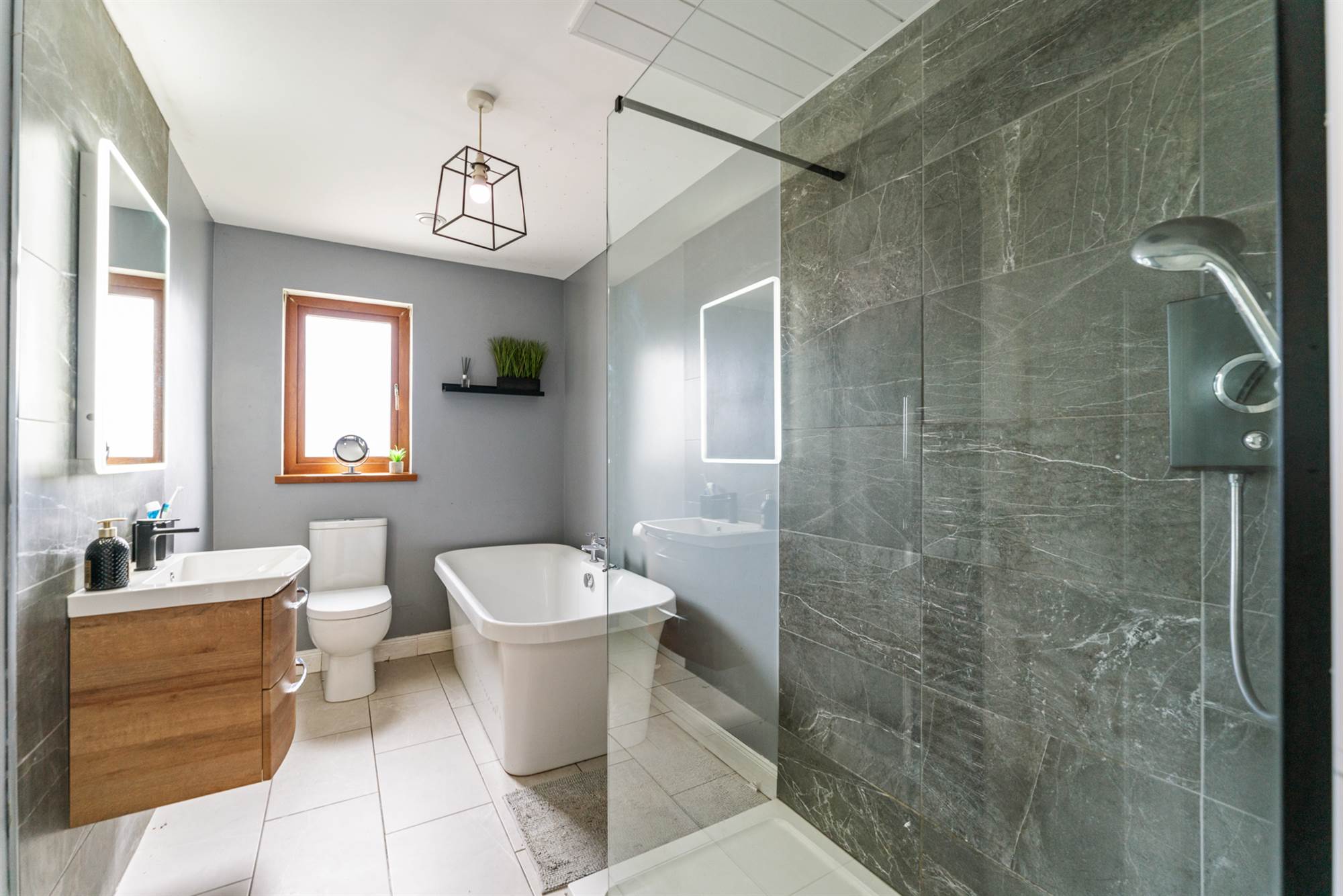 White suite comprising: freestanding bath with centre mixer taps, large separate walk in shower with feature tiling, thermostatically controlled shower unit, glass panel, floating vanity unit with wash hand basin and mixer taps, push button WC, feature wall tiling, wired for wall mounted mirror, ceramic tiled floor, extractor fan, chrome towel radiator.