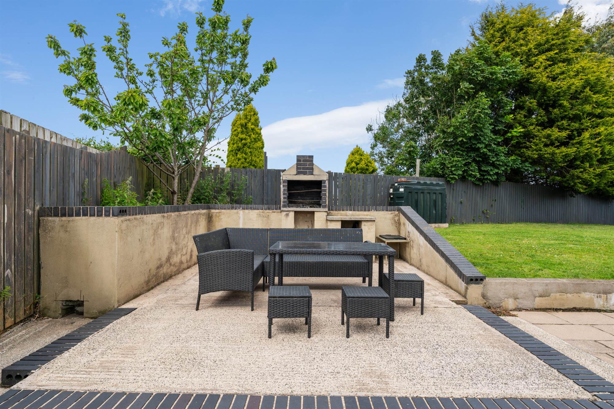 Gardens to front and rear laid in lawns, extensive patio, BBQ area and fencing