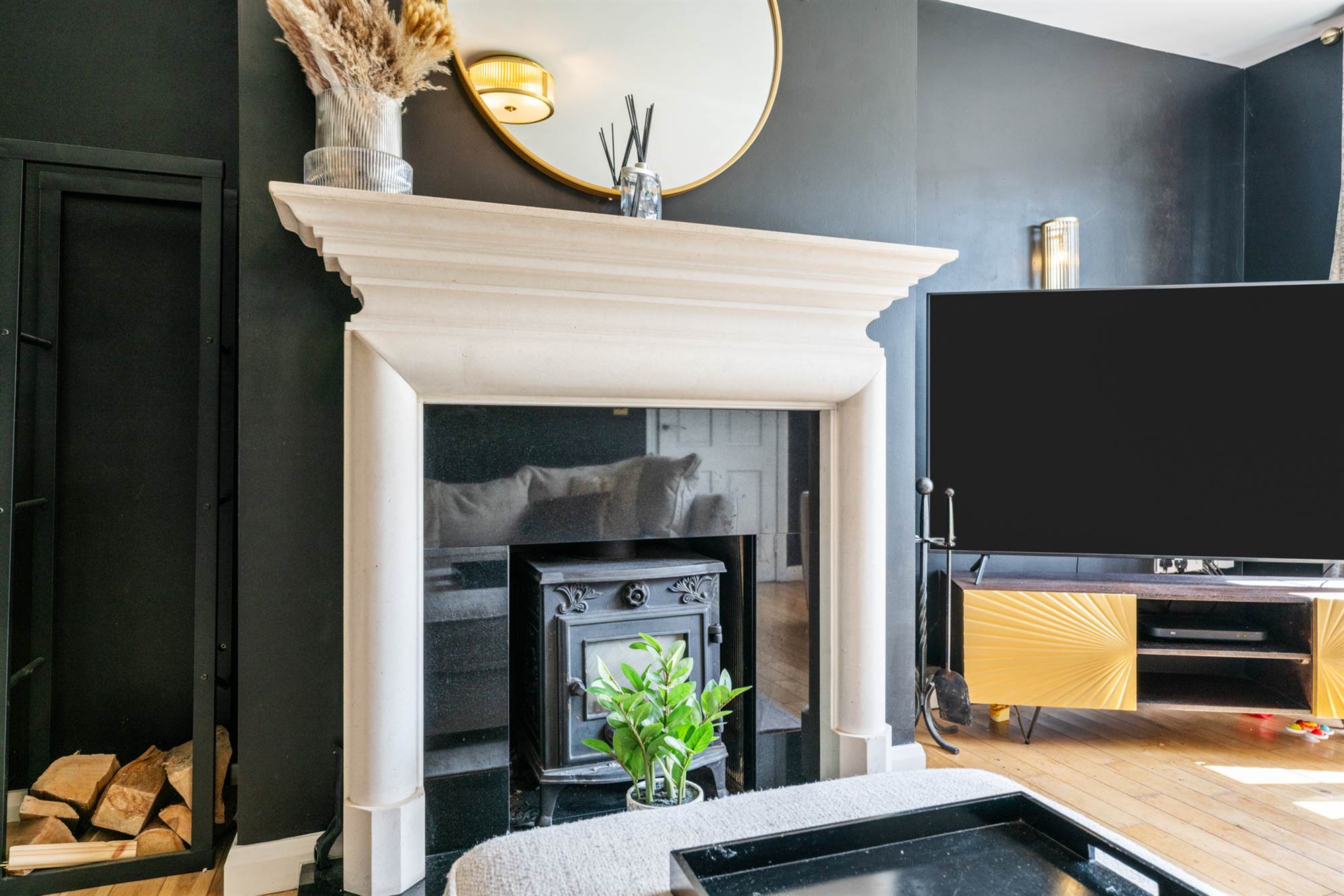 Attractive Limestone fireplace surround with wood burning stove and Granite hearth, polished Oak floor, wall light points.