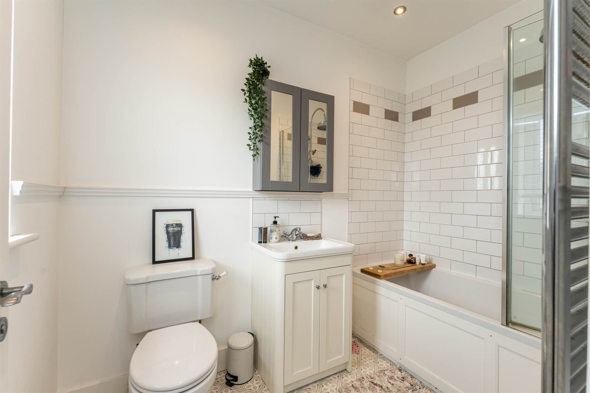 Panelled bath with mixer taps and overhead rain shower, vanity sink unit, low flush WC, ceramic tiled floor, chrome towel radiator.