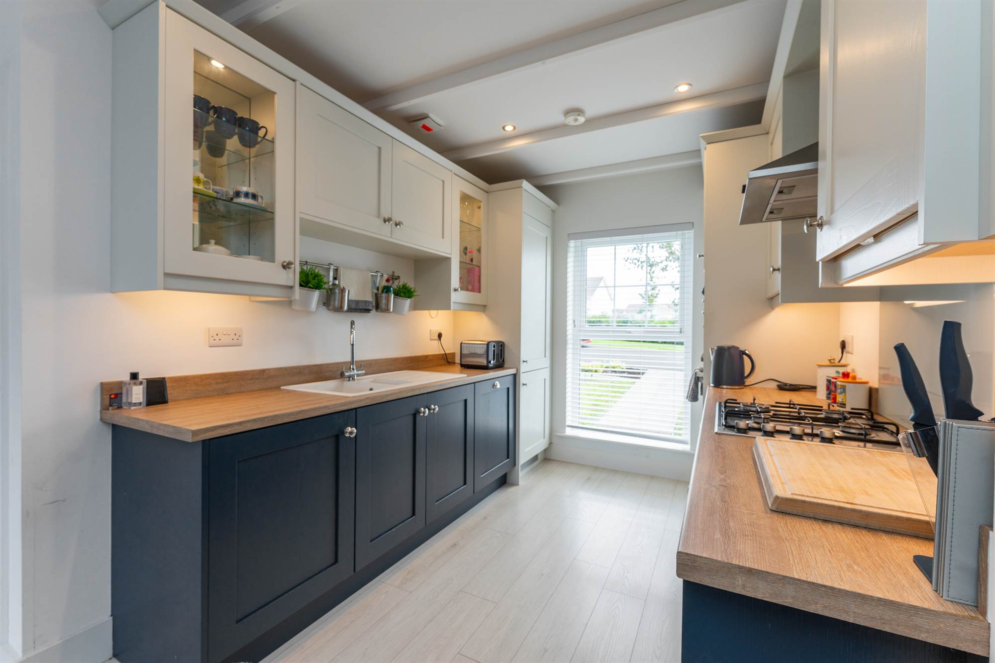 Full range of high and low level units, 1.5 tub sink unit with mixer taps, dishwasher, fridge freezer, 4 ring gas hob, stainless steel extractor canopy over, eye level oven, wood laminate floor. Open to Living Room.