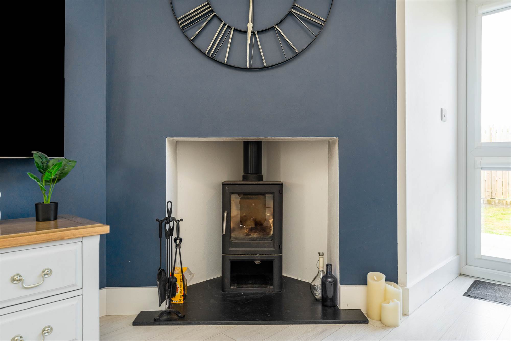 Cast iron wood burning stove, wood laminate floor, French doors to rear.