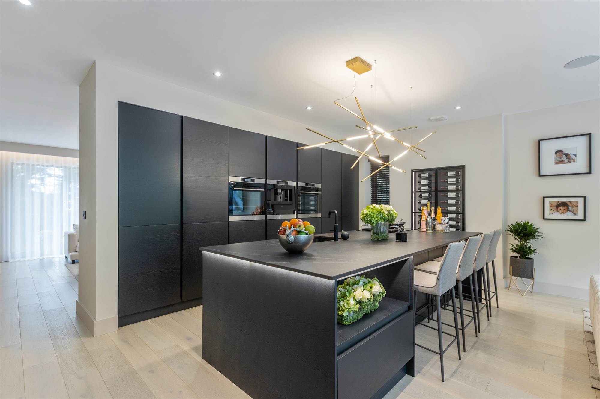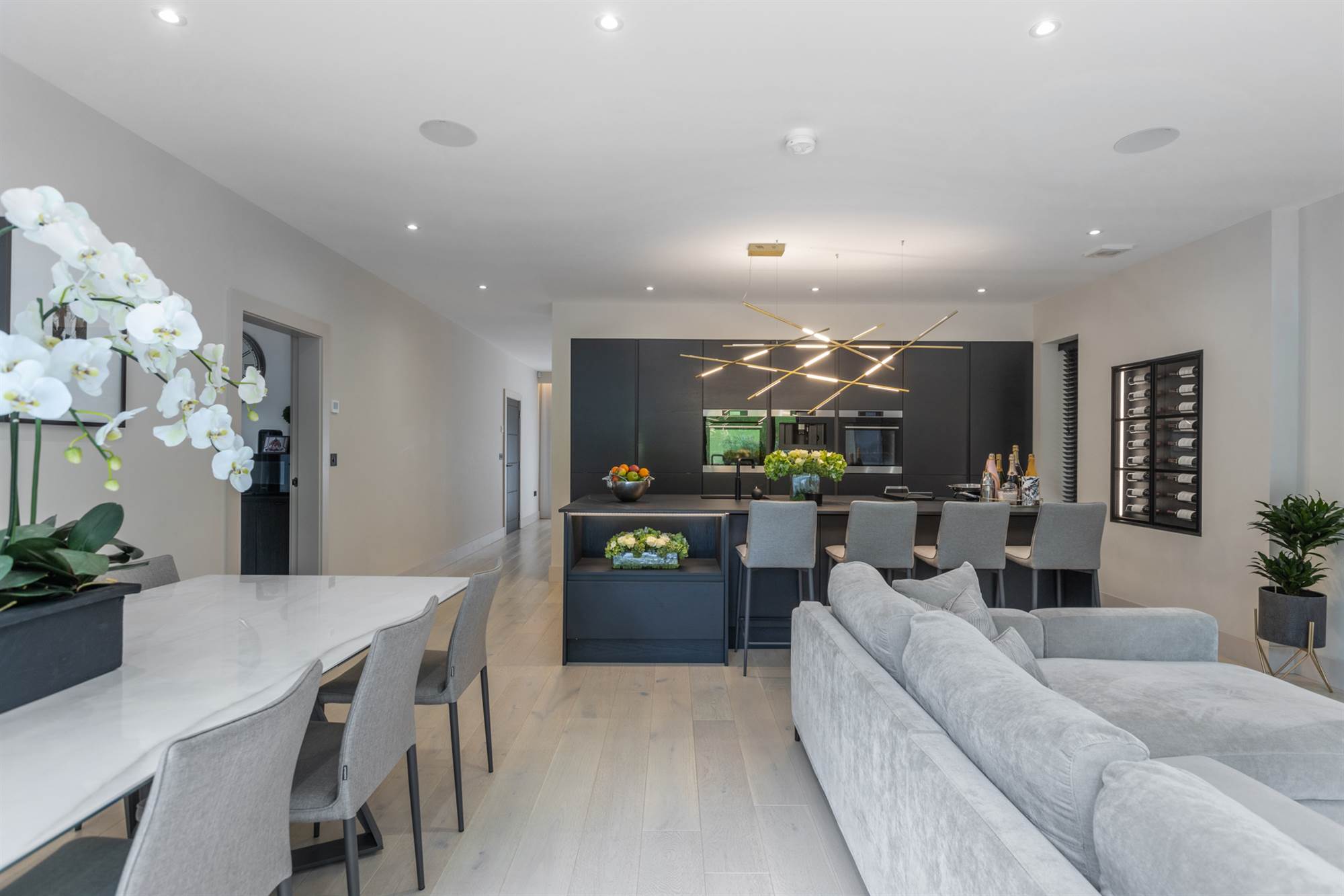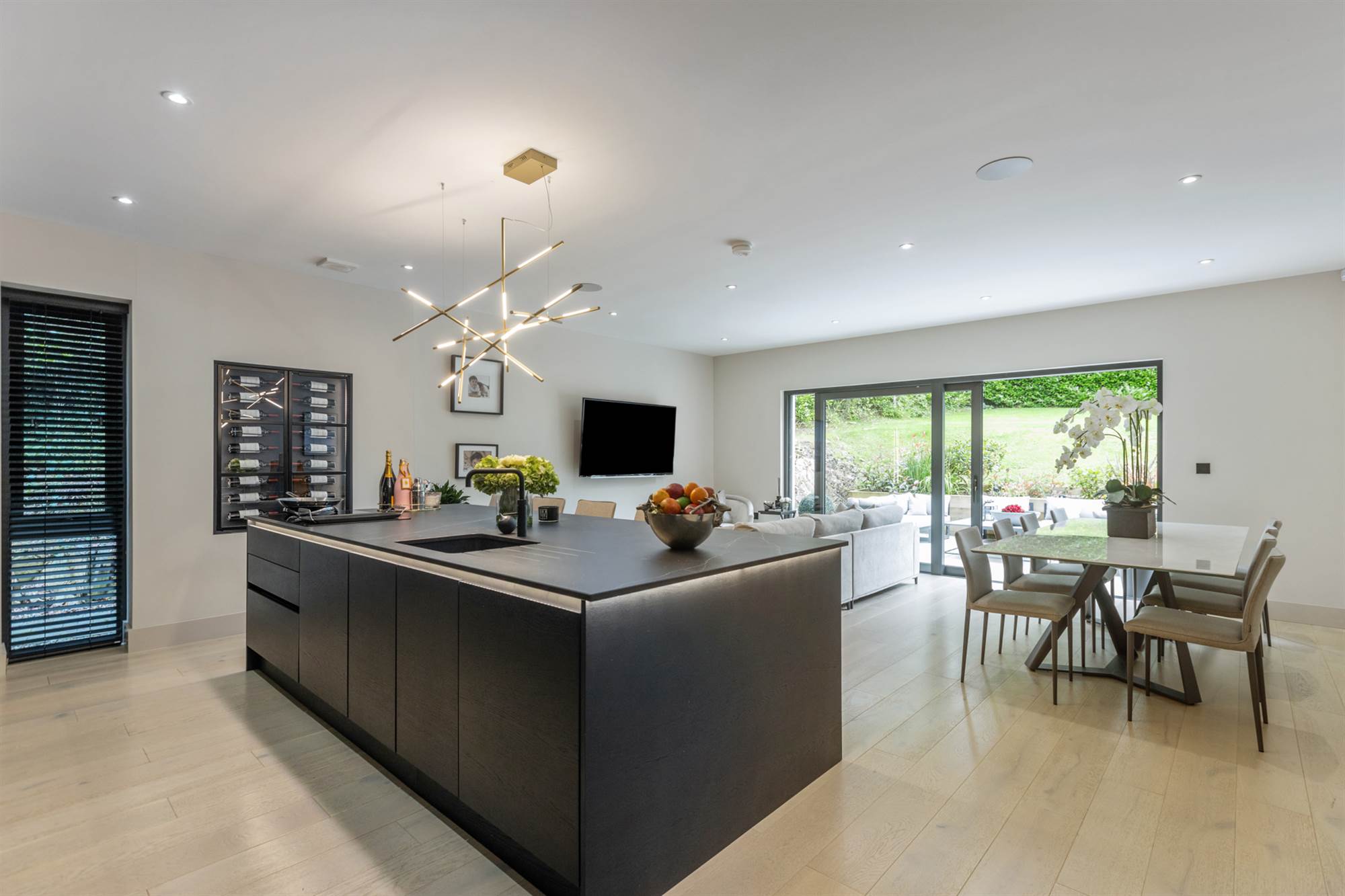 Central island with Dekton work surfaces, ceramic induction hob with extractor, built in wine rack, Quooker tap, dishwasher, fridge and freezer, coffee maker, plate warmer and two ovens, limed oak floor, sliding doors to rear.