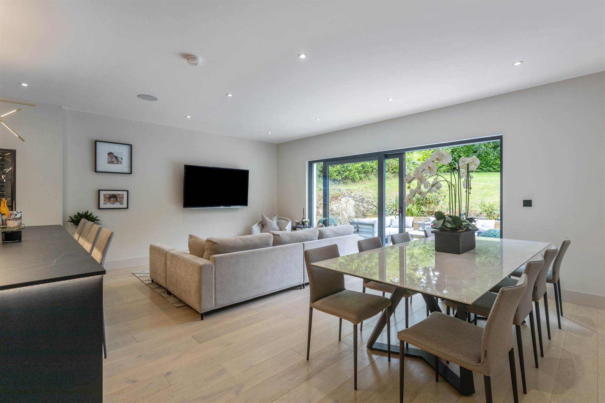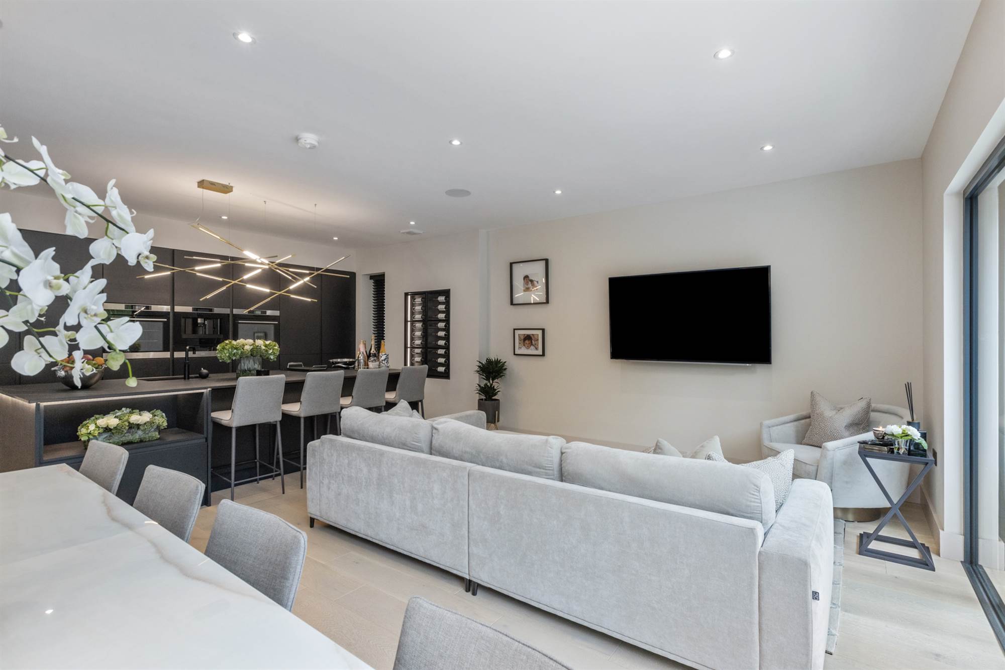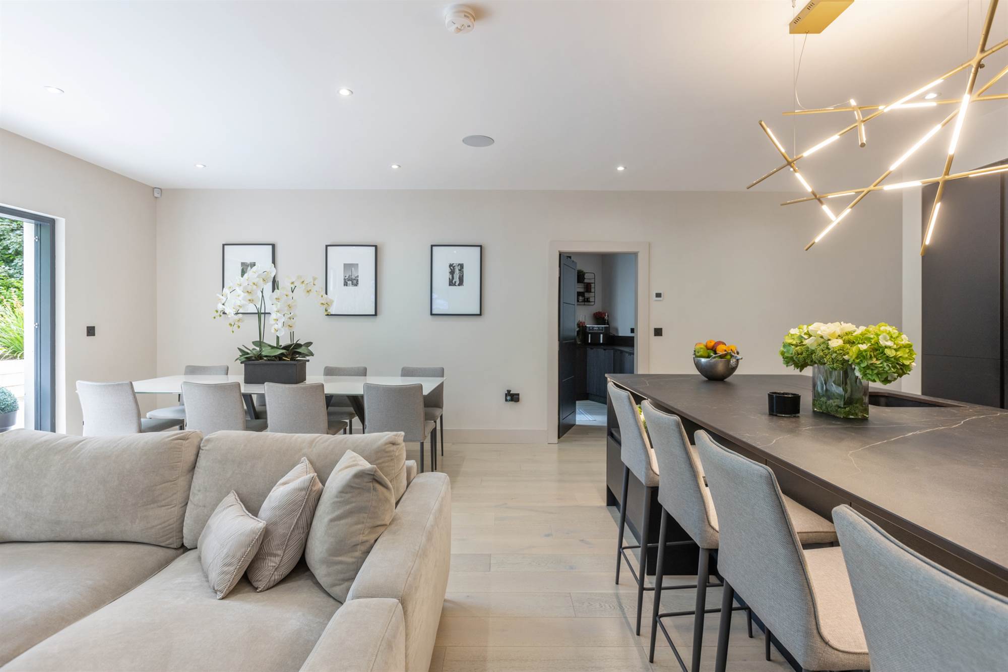 Central island with Dekton work surfaces, ceramic induction hob with extractor, built in wine rack, Quooker tap, dishwasher, fridge and freezer, coffee maker, plate warmer and two ovens, limed oak floor, sliding doors to rear.