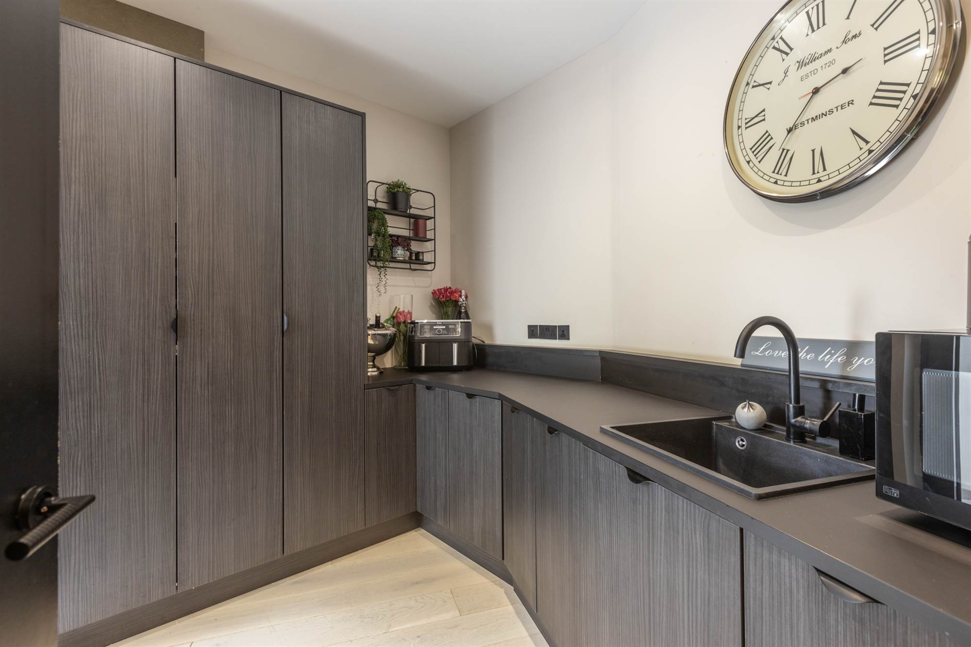 To max. Full range of high and low level units, sink unit with mixer taps, plumbed for washing machine, tumble dryer, limed oak floor, comms cupboard, rear door.