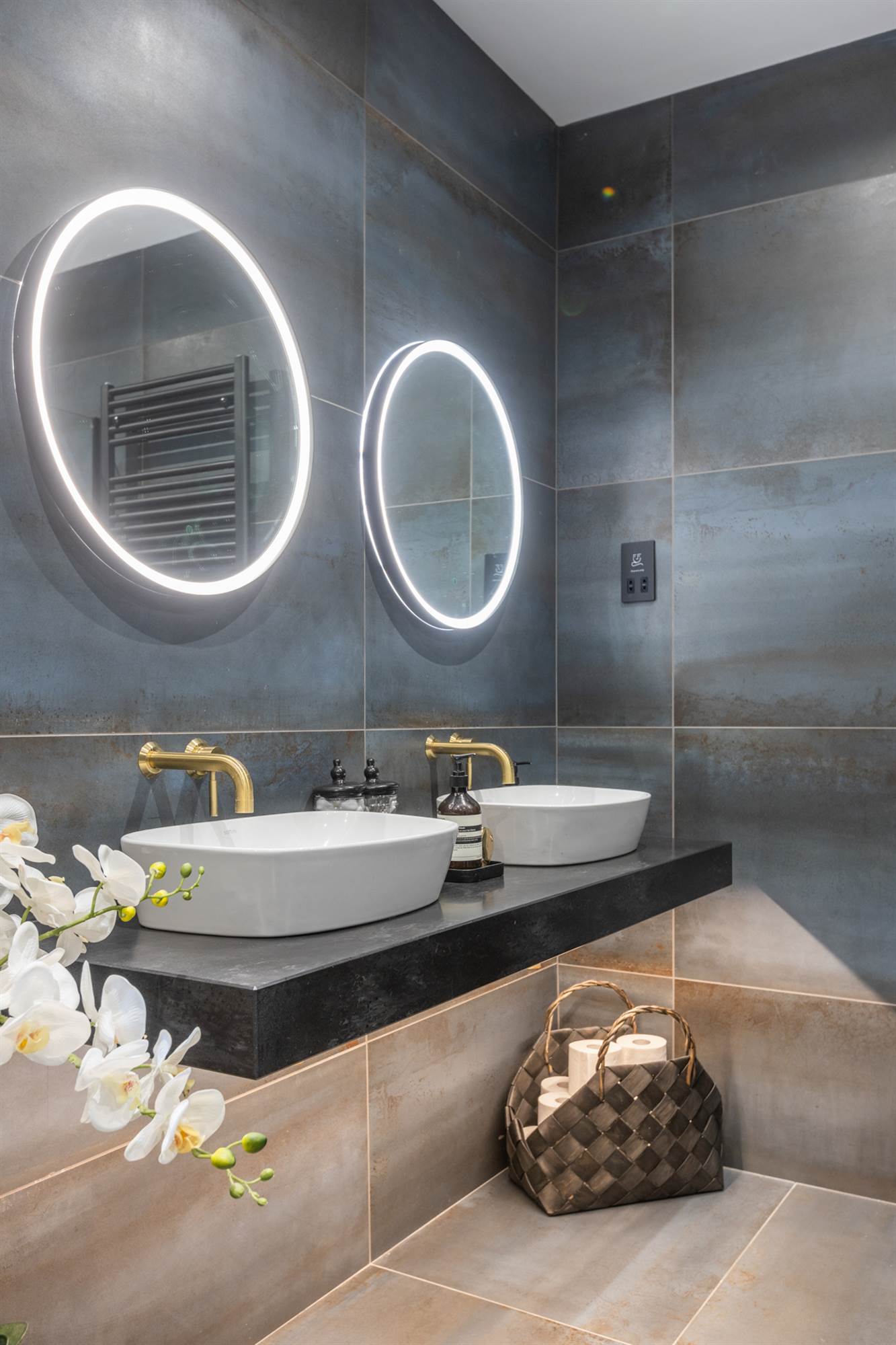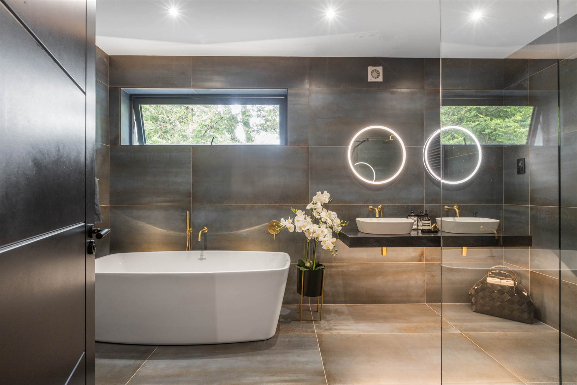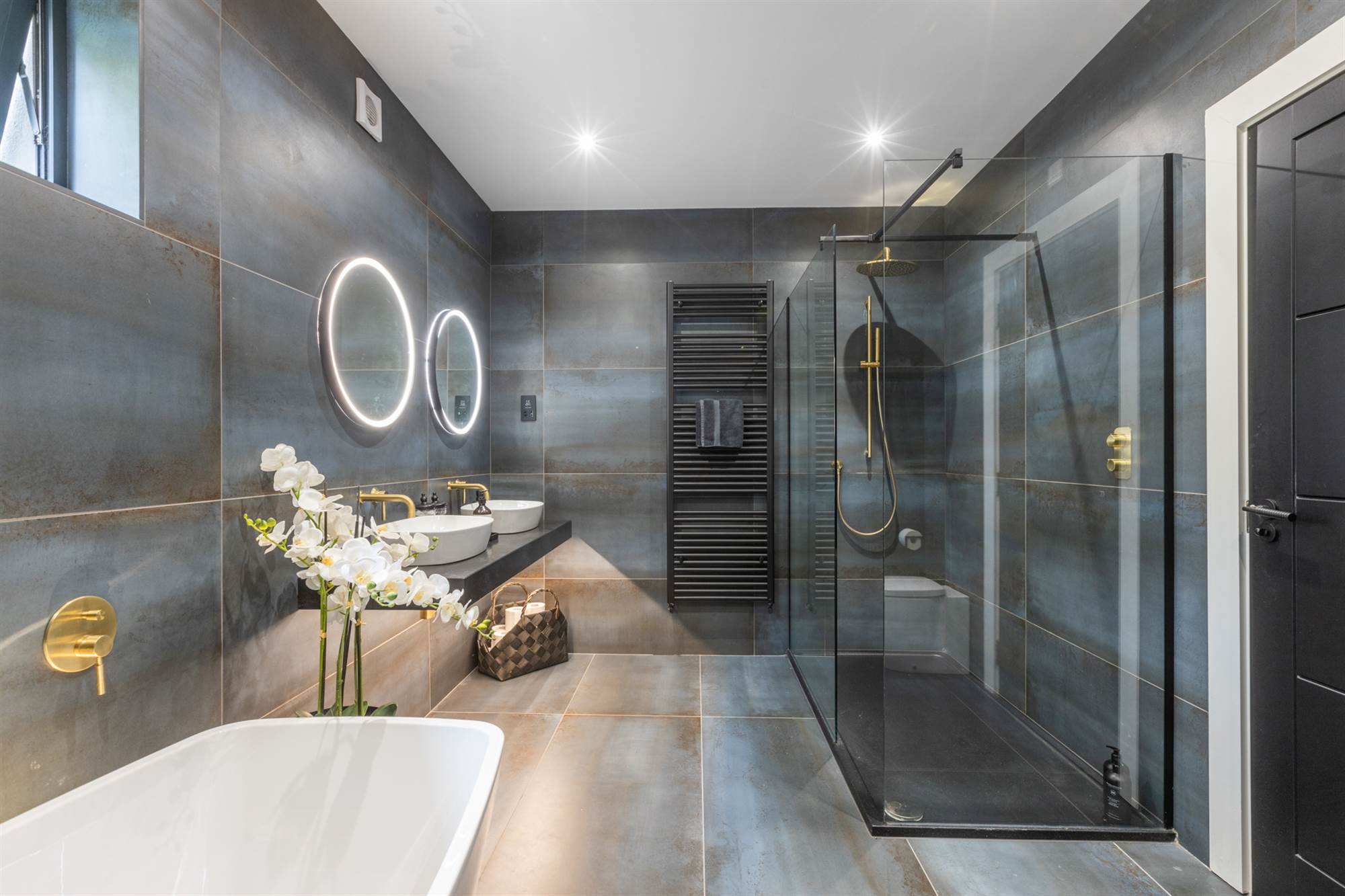 Sottini free standing bath with mixer taps and shower fitting, vanity unit with mixer taps and light mirrors, walk in shower with overhead rain shower, low flush WC, towel radiator, fully tiled walls, ceramic tiled floor.