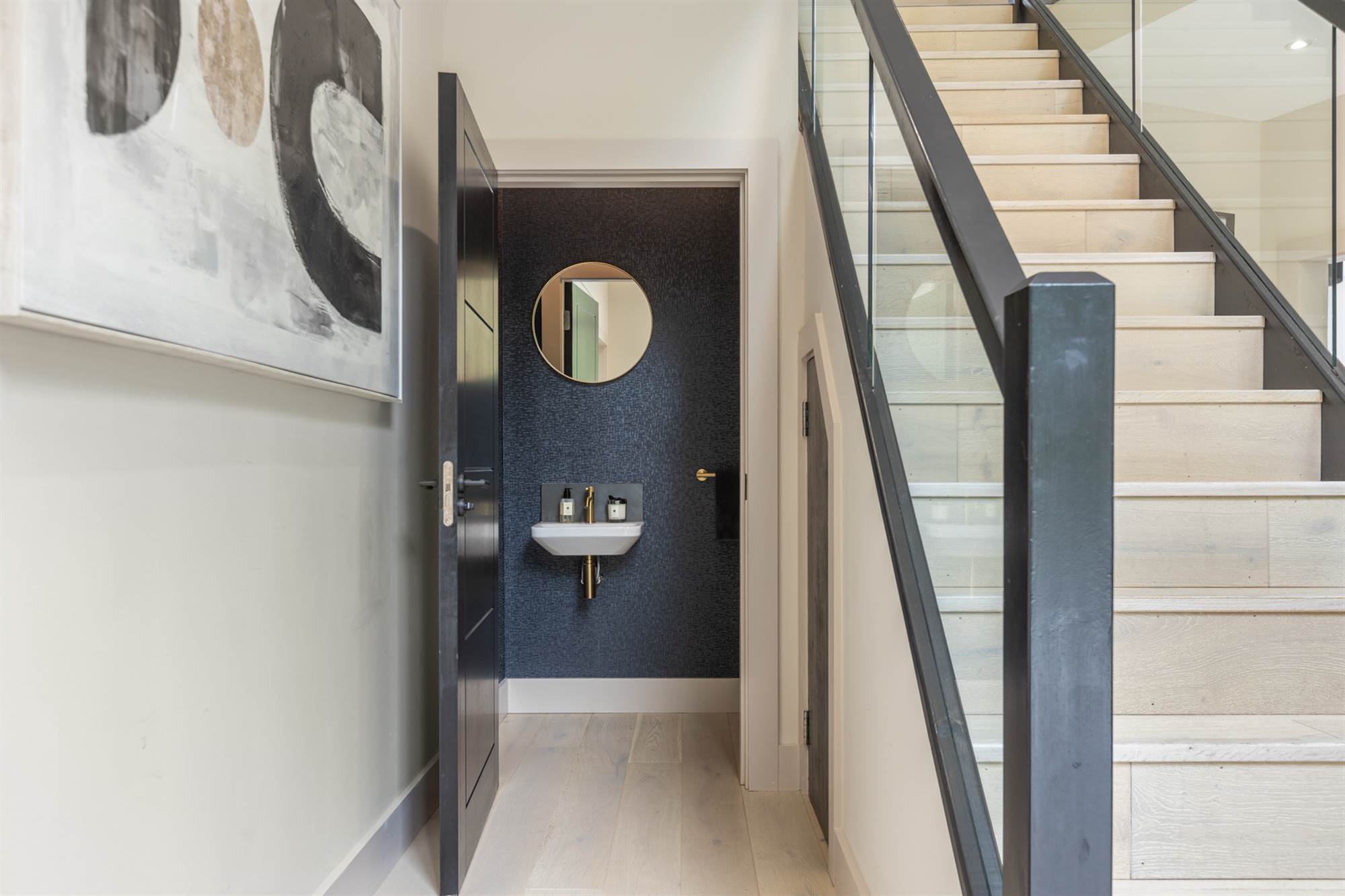 Wash hand basin, low flush WC, under stairs storage.