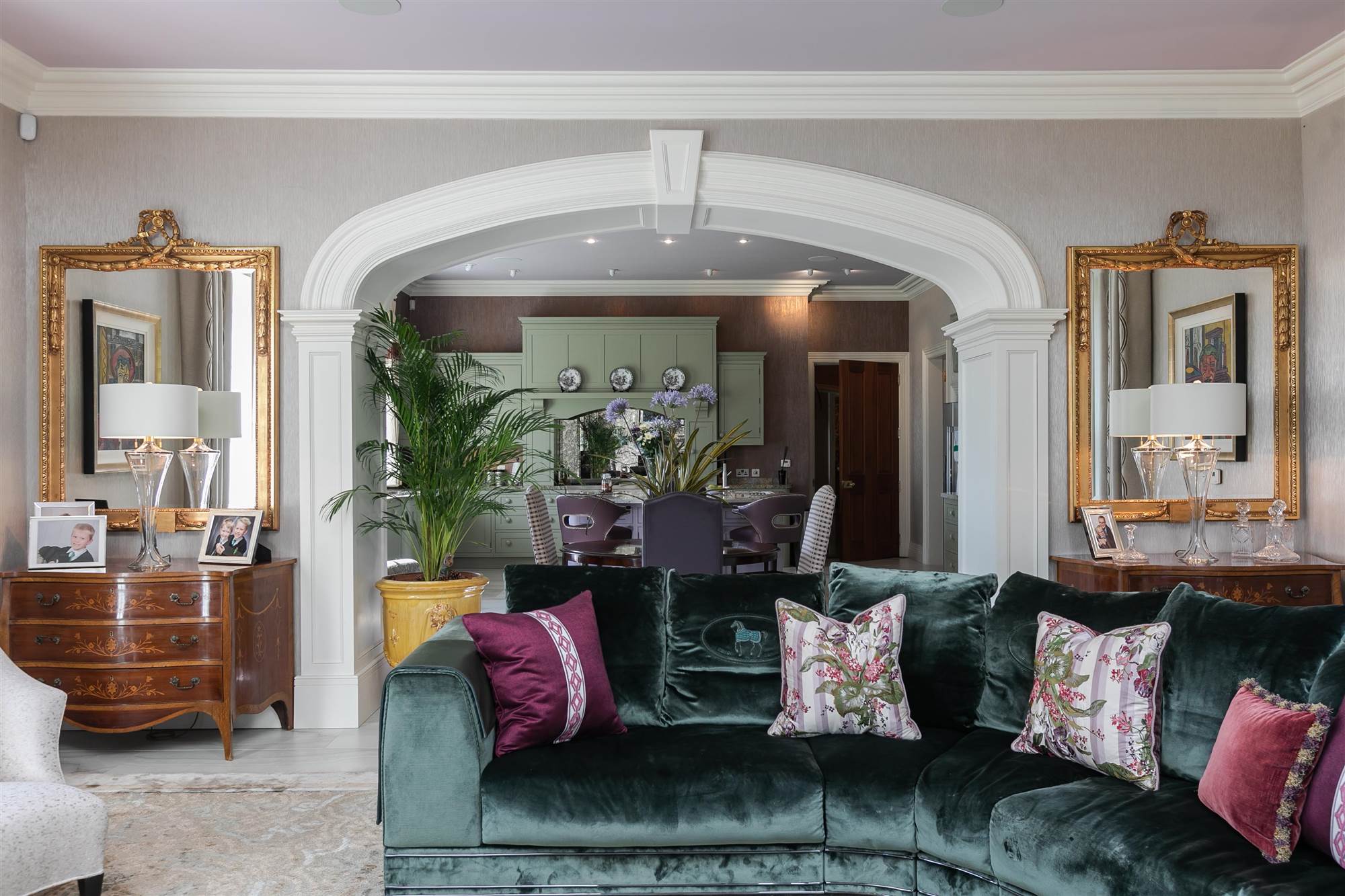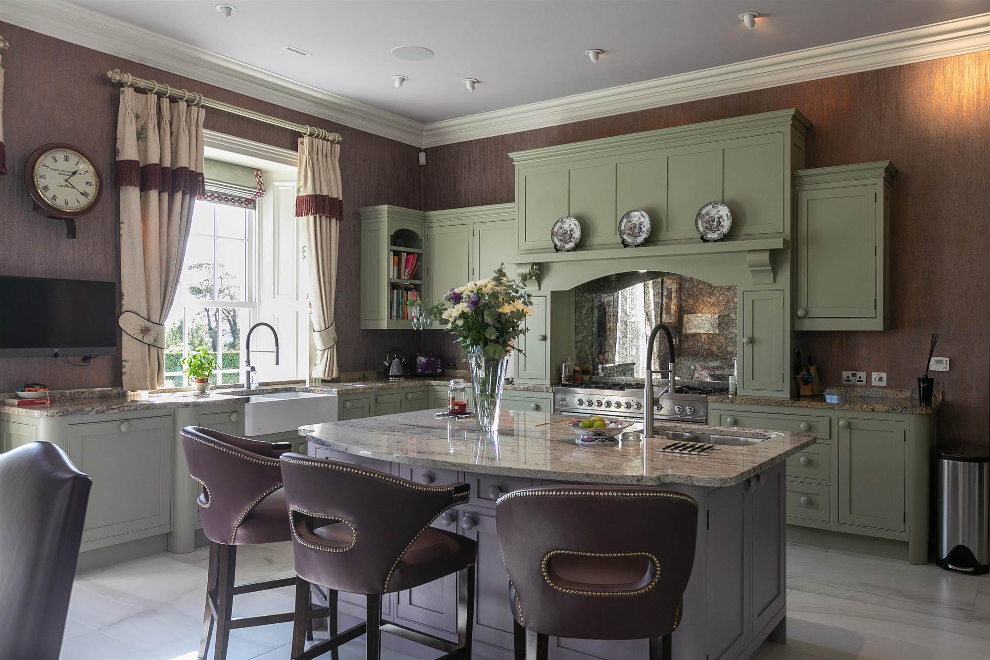 Hand painted kitchen with an excellent range of high and low level units and polished granite worktops, Brittania gas range, cooker with antique mirror splashback and beam mantle, twin Belfast sinks with mixer taps, large island with breakfast bar dining and stainless steel sink unit with mixer taps, integrated Neff dishwasher, integrated Bosch microwave oven and plate warmer, recess for American style fridge freezer, dining area for 4-6. Marble floor, corniced ceiling and recessed lighting. Open to living area, access to walk in pantry.