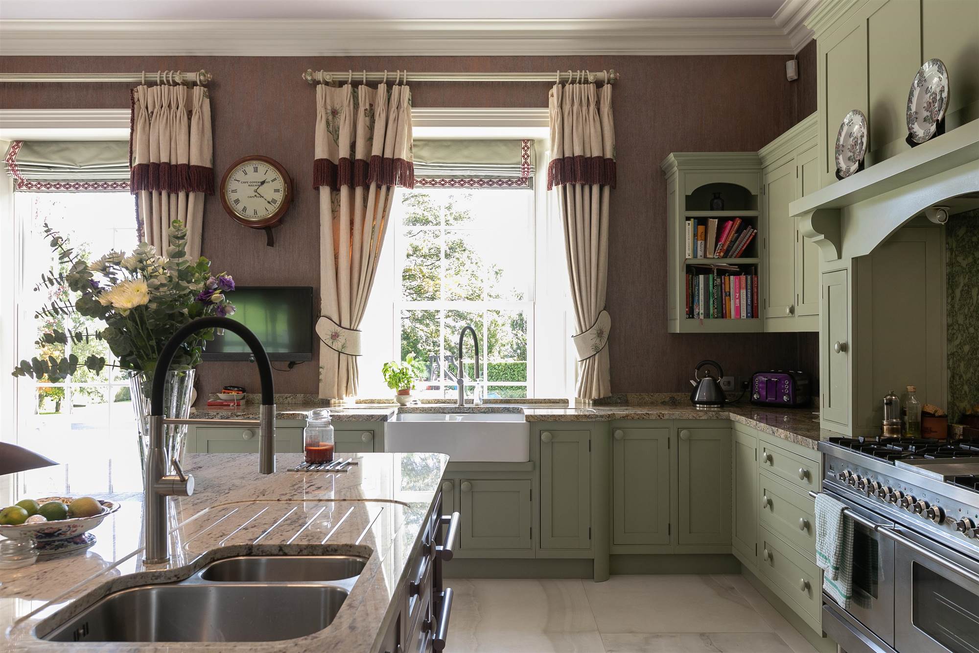 Fitted with an excellent range of hand painted units, solid and varnished worktops, twin Belfast sink with mixer taps, plumbed for dishwasher, space for tumble dryer, ceramic tiled floor, corniced ceiling, recessed lighting.