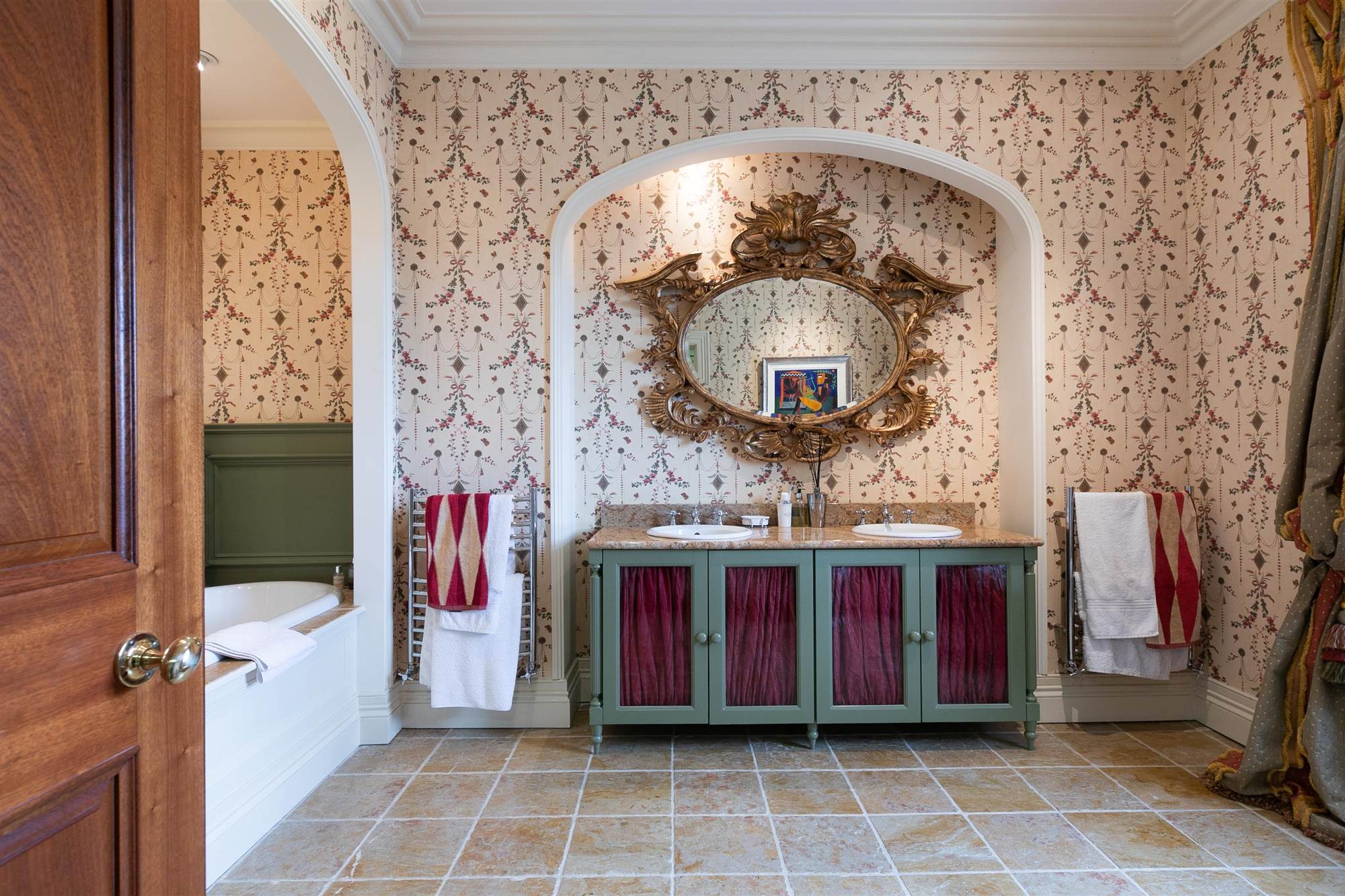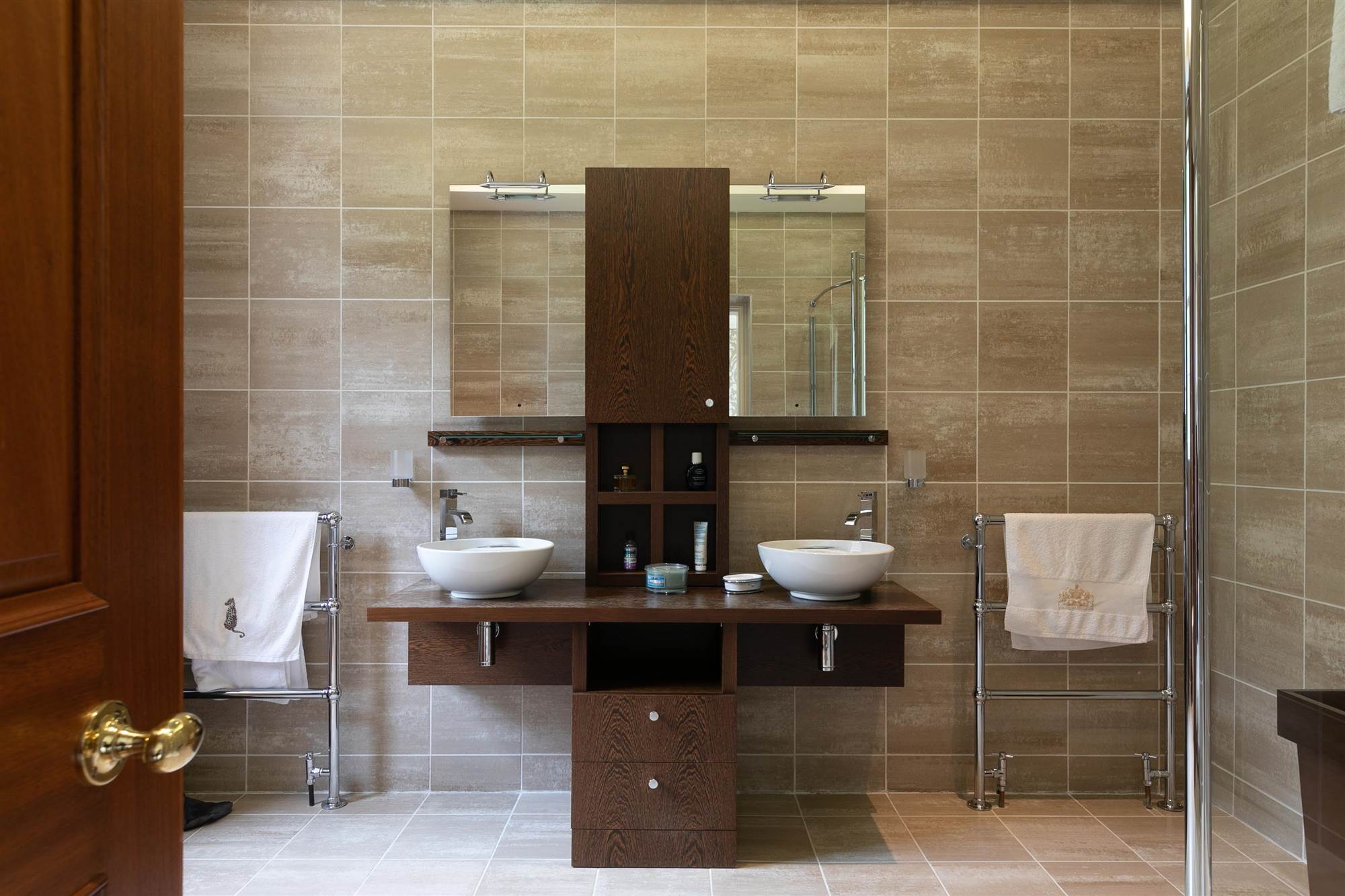 Traditional style suite comprising of low flush WC, bidet, twin inset wash hand basins with vanity unit below and granite worktops, fully tiled shower with chrome fitments, panelled bath, chrome heated towel rails, tiled floor, corniced ceiling, recessed lighting.