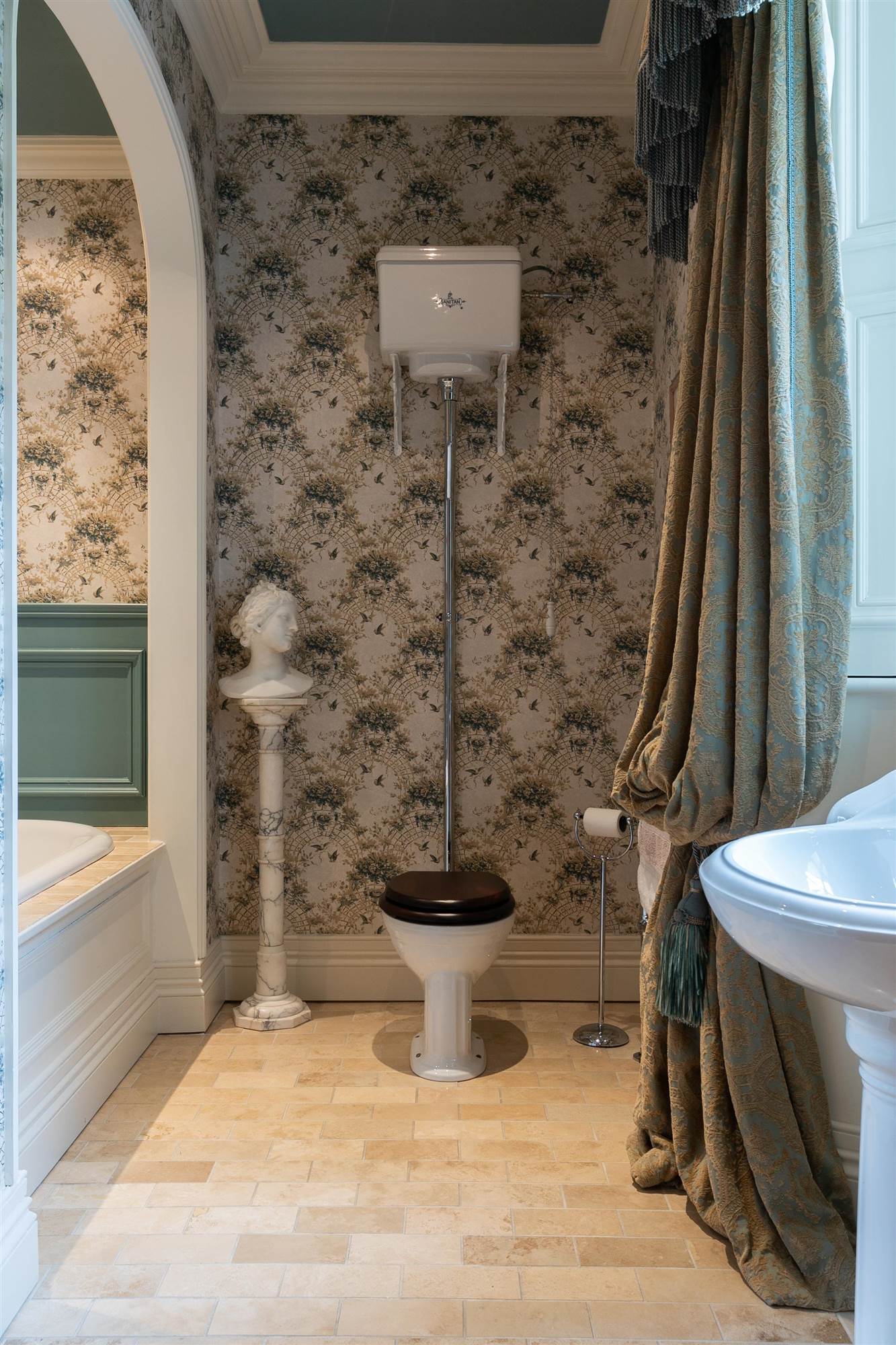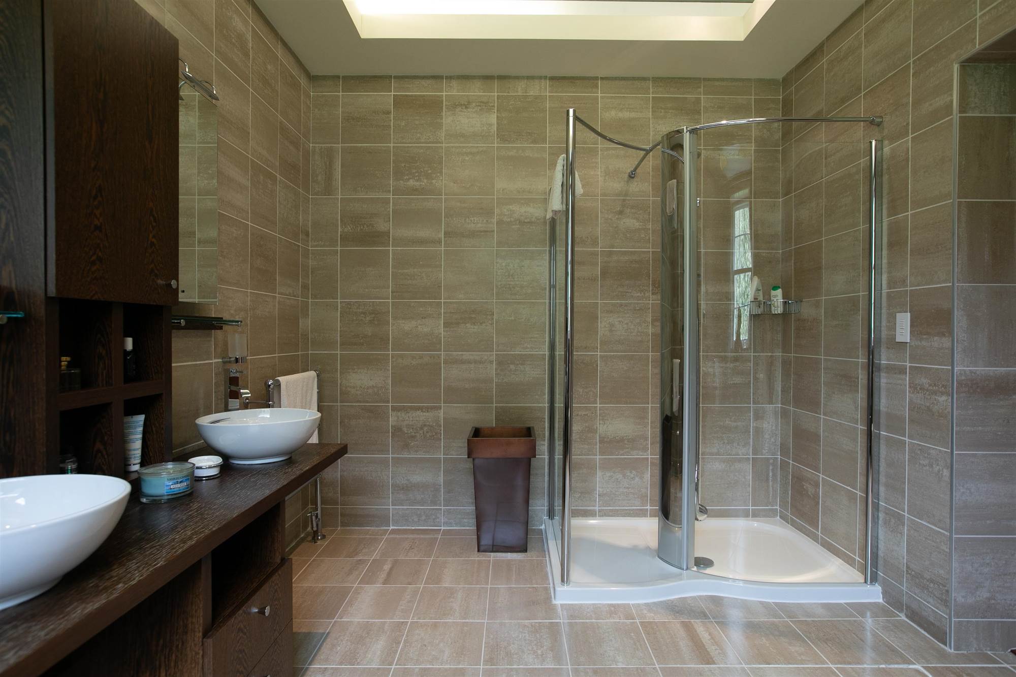 Traditional style suite comprising of 'Sanitan' WC and pedestal wash hand basin, fully tiled shower with chrome fitments, panelled bath, corniced ceiling, recessed lighting, tiled floor, chrome heated towel rail.