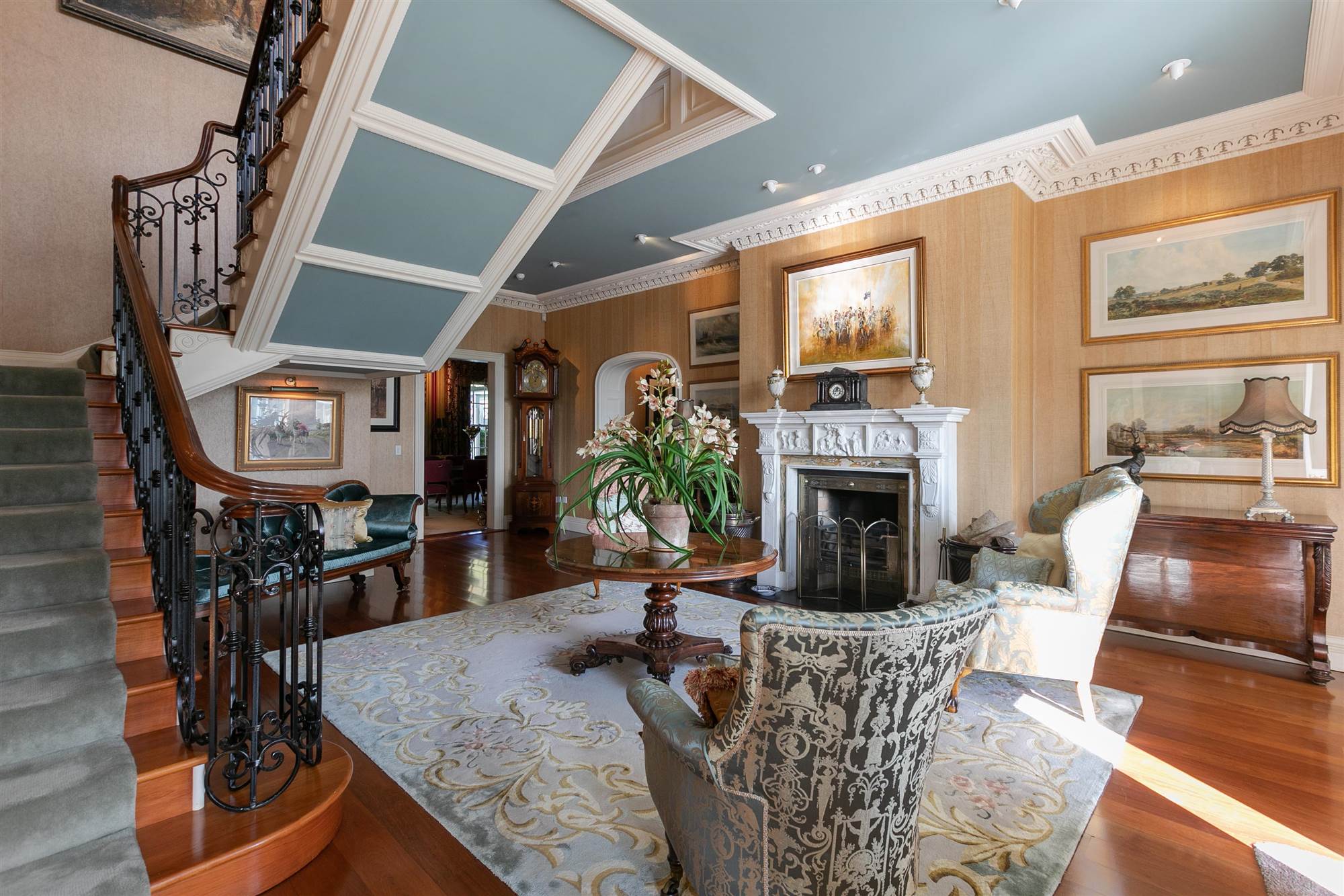 Marble fire surround with open fire and slate hearth, hardwood strip floor, ornate corniced ceiling, recessed lighting, wall light wiring, impressive staircase to first floor. Secret door to study.