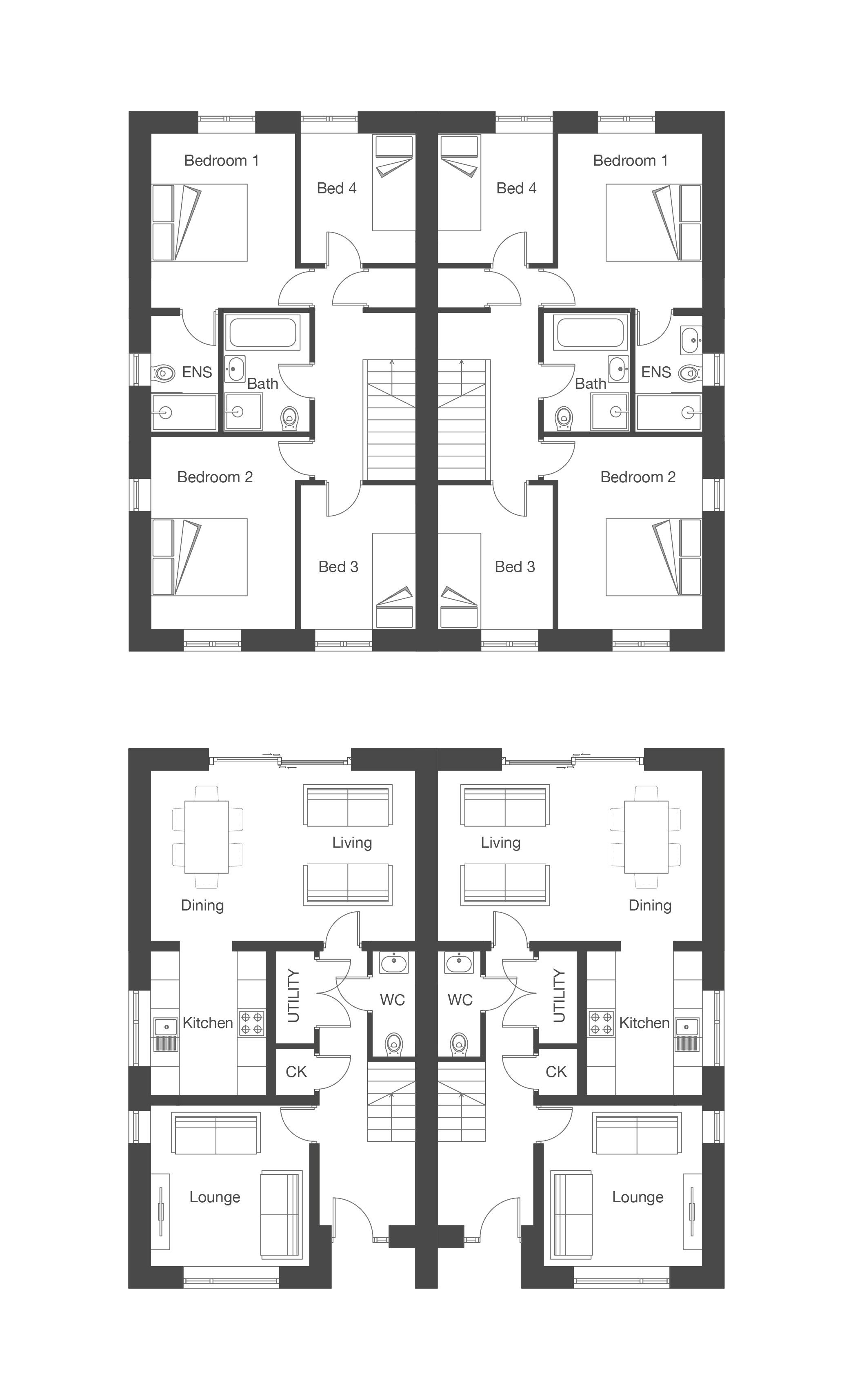 All walls and skirting boards will be painted white, giving you the final say over the internal finishes of your new home. And, as seen in our show home, internal doors are painted black, with black spindles and black ironmongery.